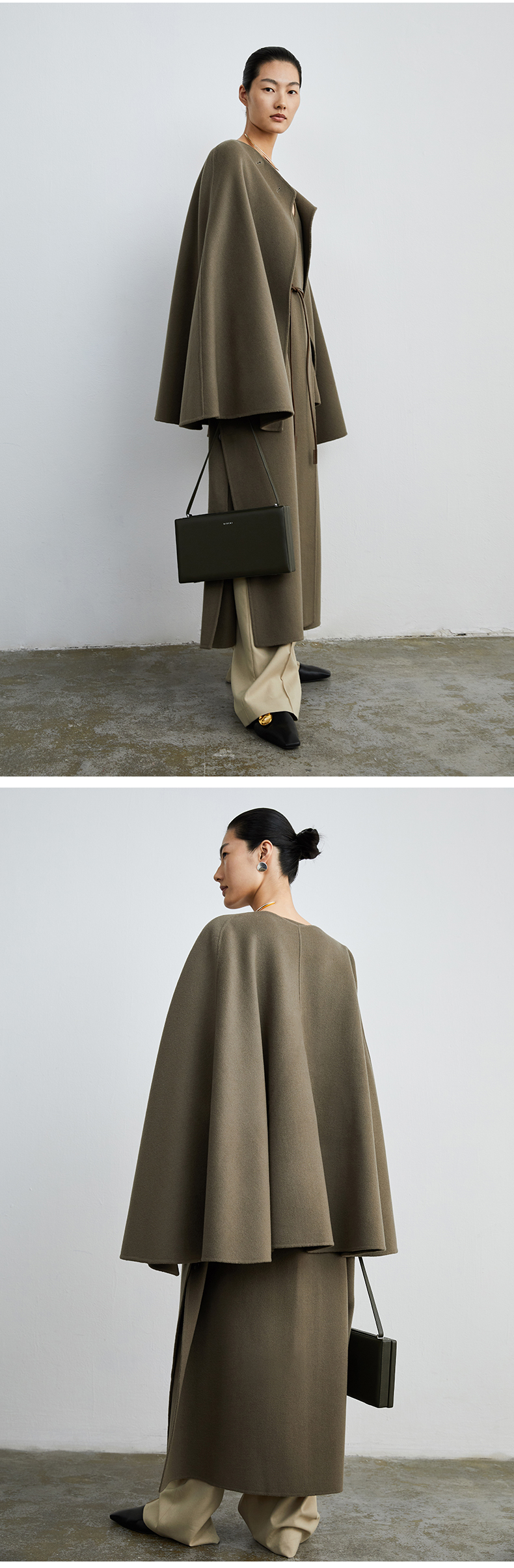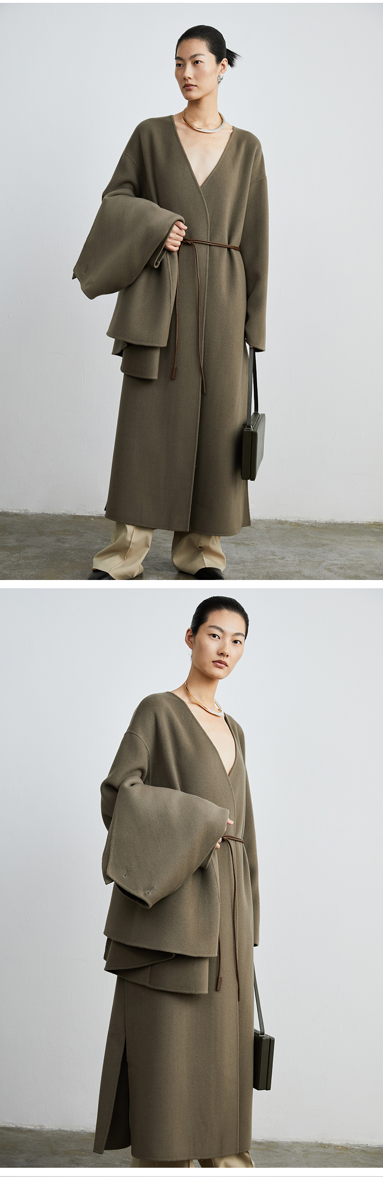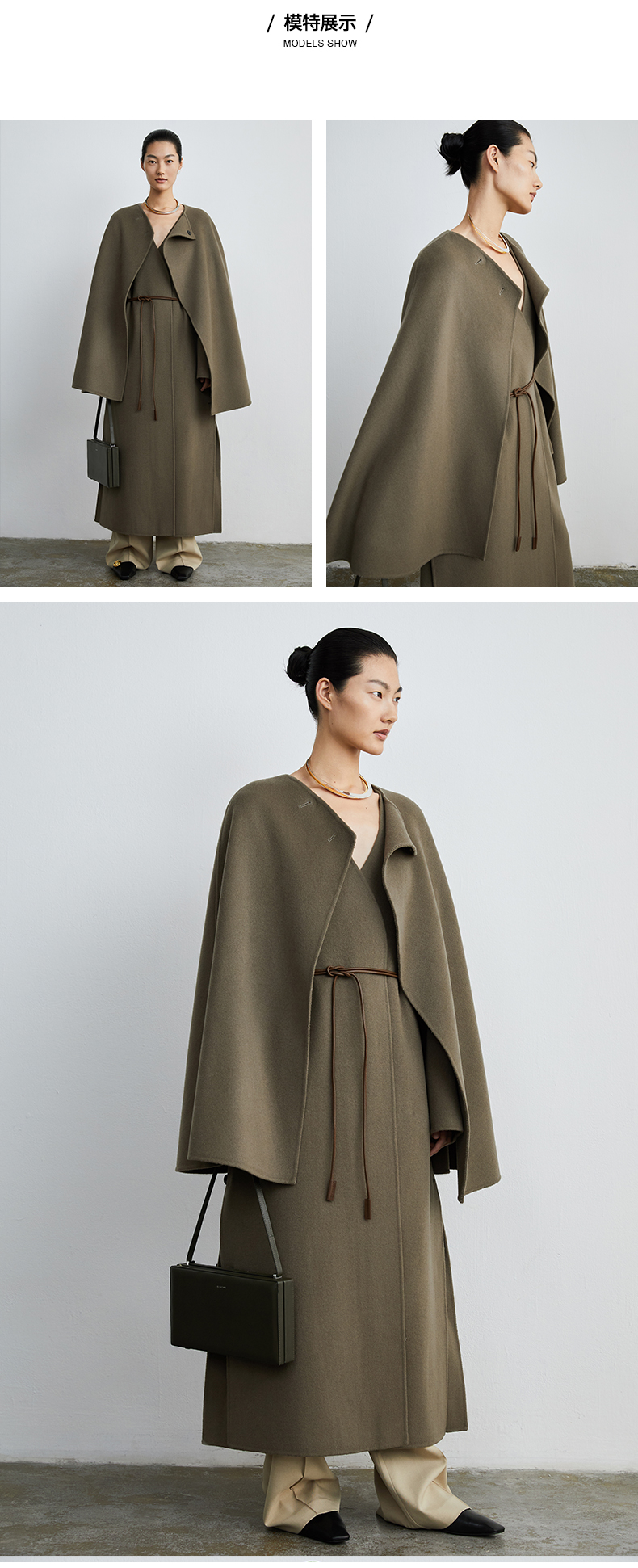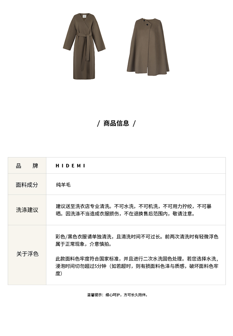 HIDEMI 摩卡其色斗篷分体两件套式腰带浴袍式长款澳毛大衣