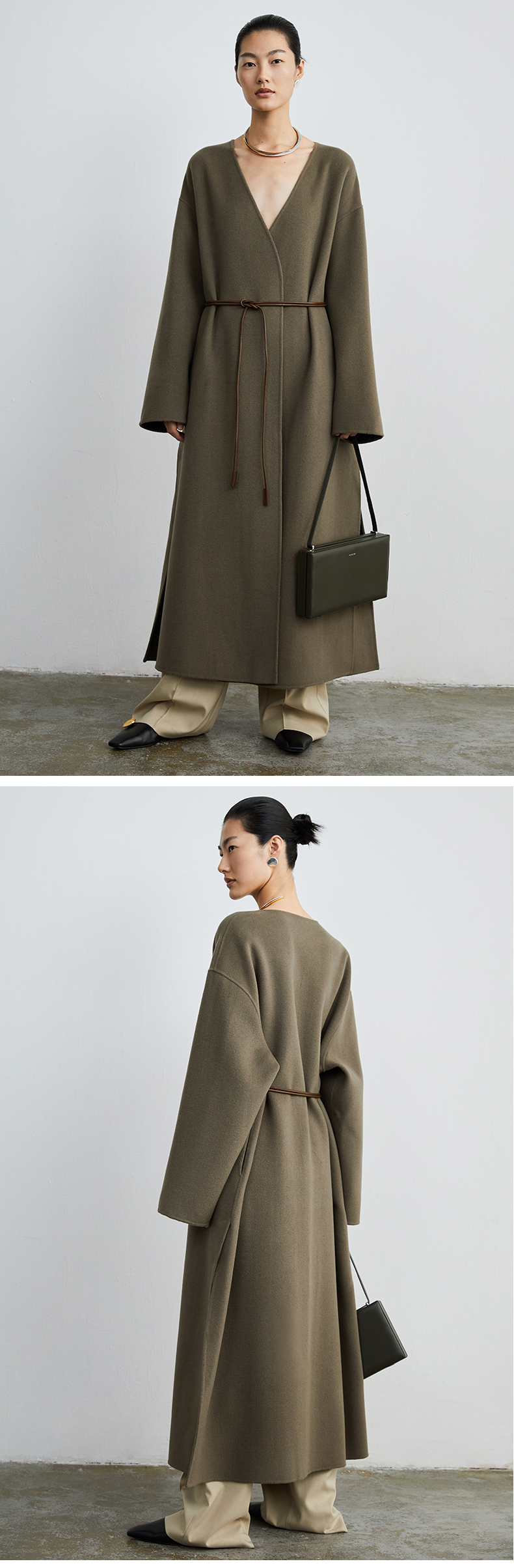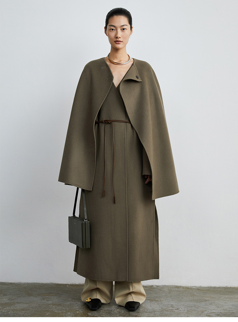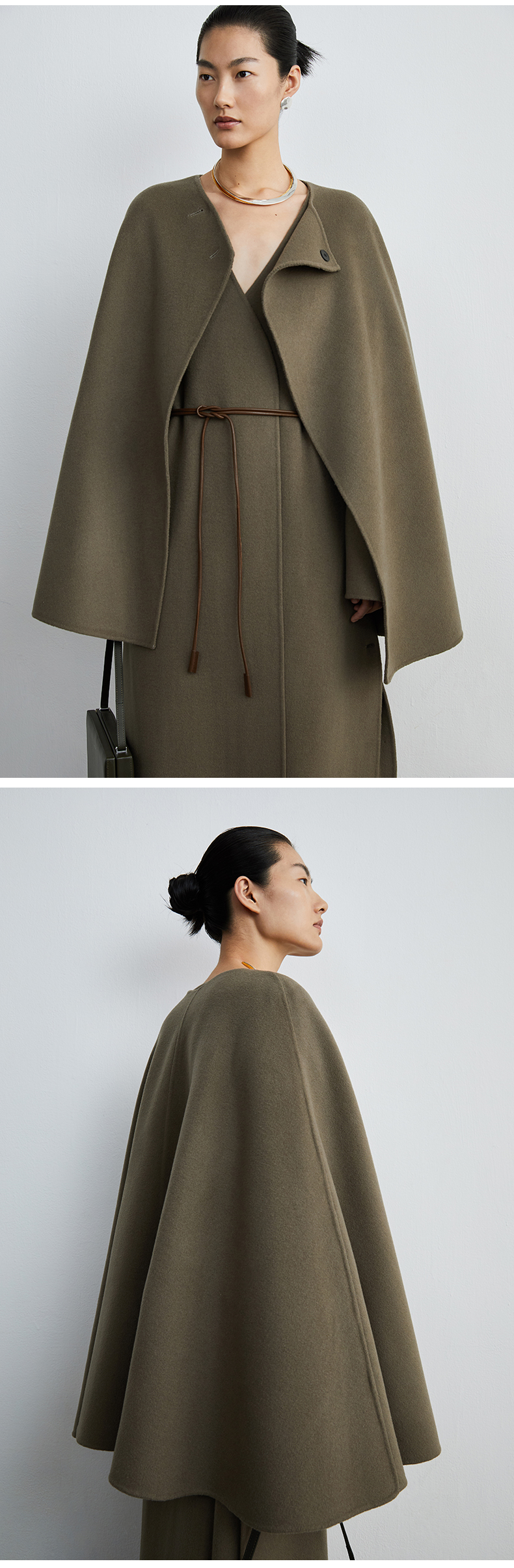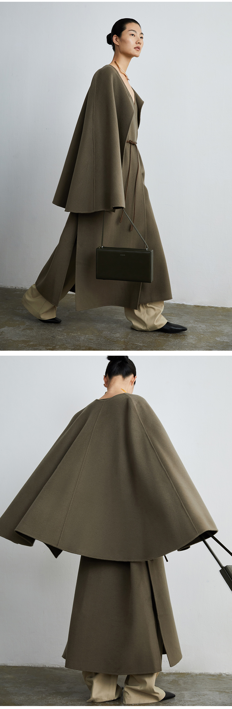 HIDEMI 摩卡其色斗篷分体两件套式腰带浴袍式长款澳毛大衣