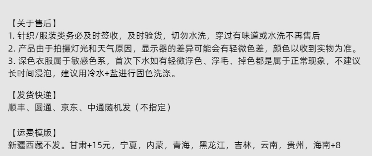 1. 针织/服装类务必及时签收,及时验货,切勿水洗,穿过有味道或水洗不再售后!尺码建议仅供参考,因个人原因导致尺码大小的退换货,售后运费自理。