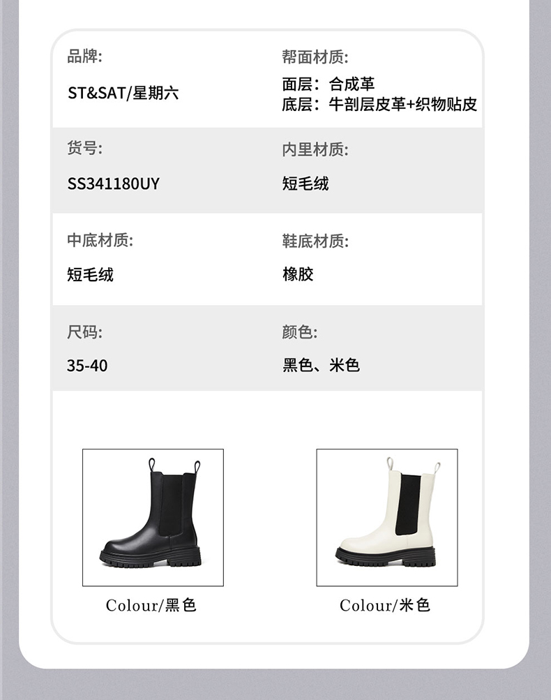 星期六极简风百搭加绒厚底切尔西SS341180UY