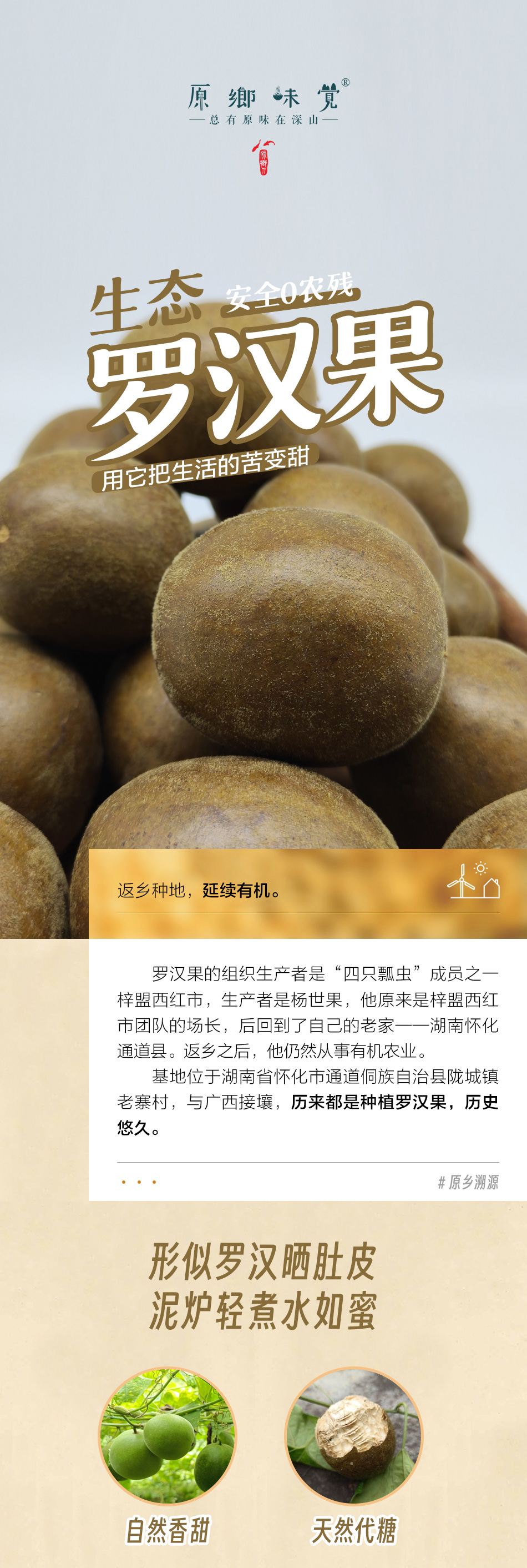 【规格】: 大果250g/袋(约10-12个) 小果250g/袋(约17-21个) 【新农人】:杨世果 【产品产地】:湖南省怀化市通道侗族自治县陇城镇老寨村 【发货地点】:云南省昆明市五华区西翥街道 【贮存方式】:阴凉干燥通风处,密封保存 【食用方式】:罗汉果冲泡时,清洗干净,连皮带肉一起开水冲泡,可反复冲泡。建议每次用量5g-8g。