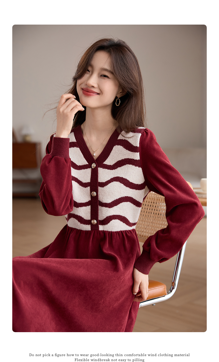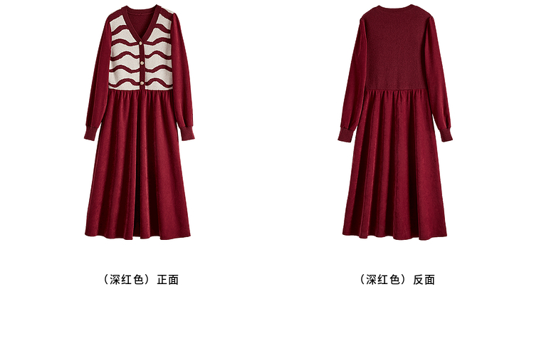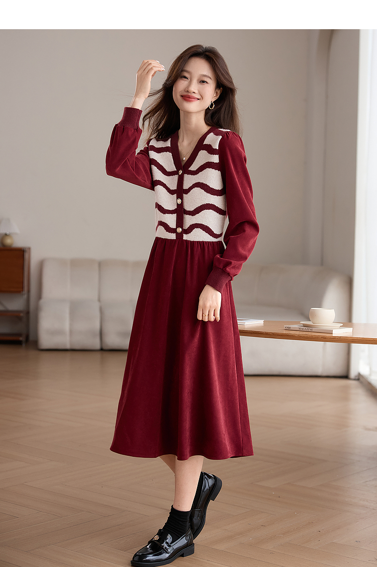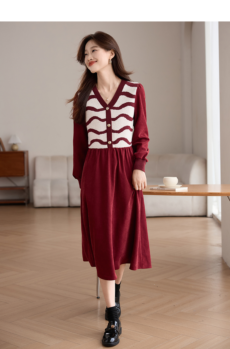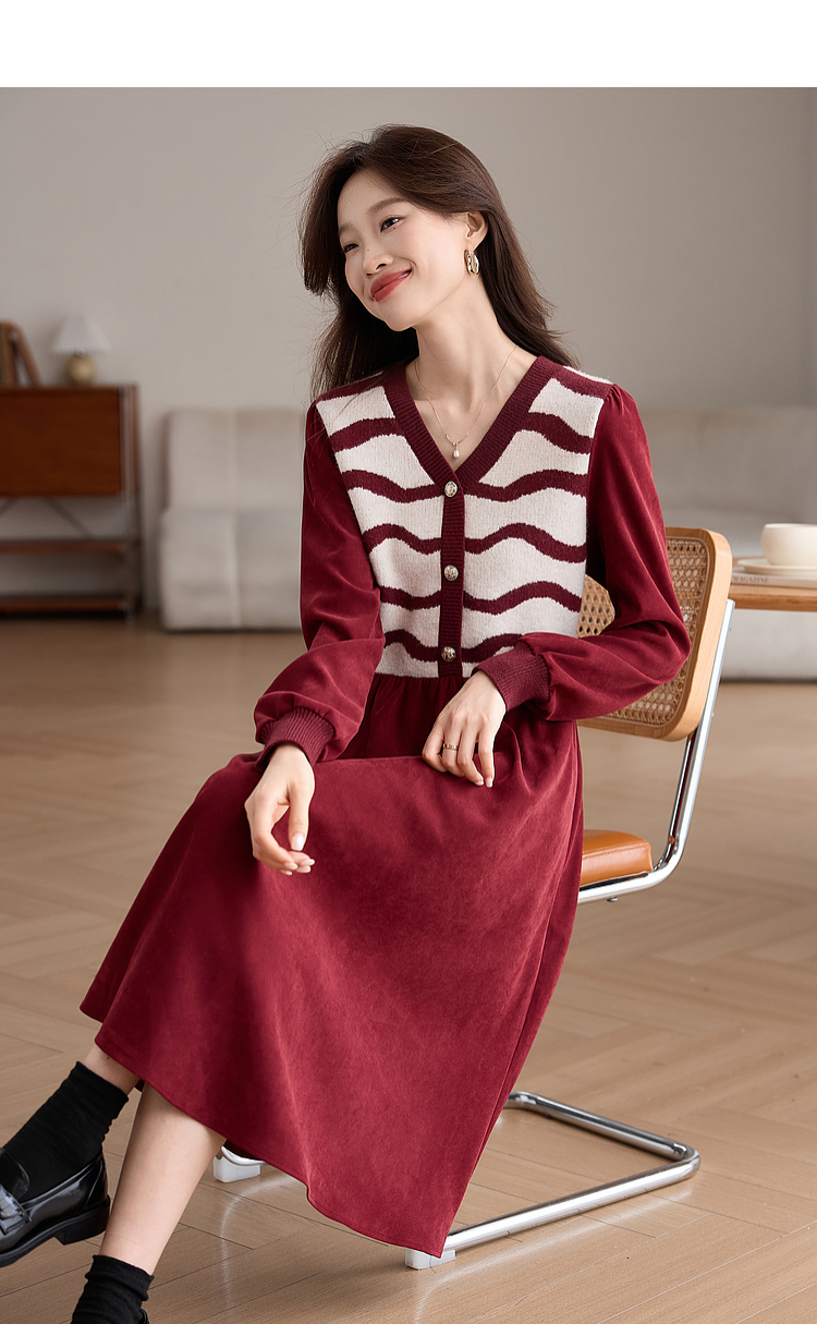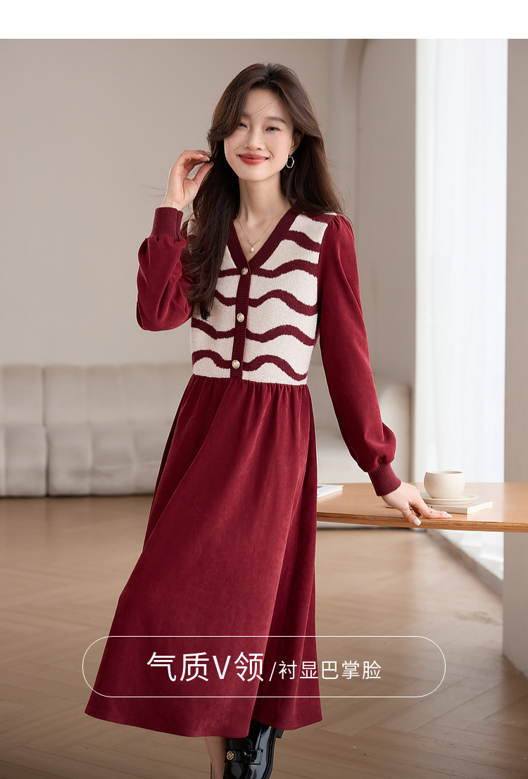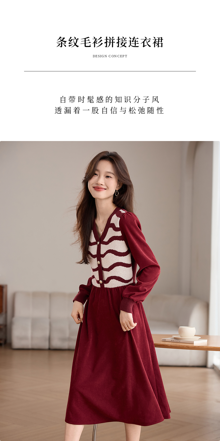 【专属特价】熙世界2025冬季新款圣诞穿搭条纹针织拼接假两件V领红色连衣裙女