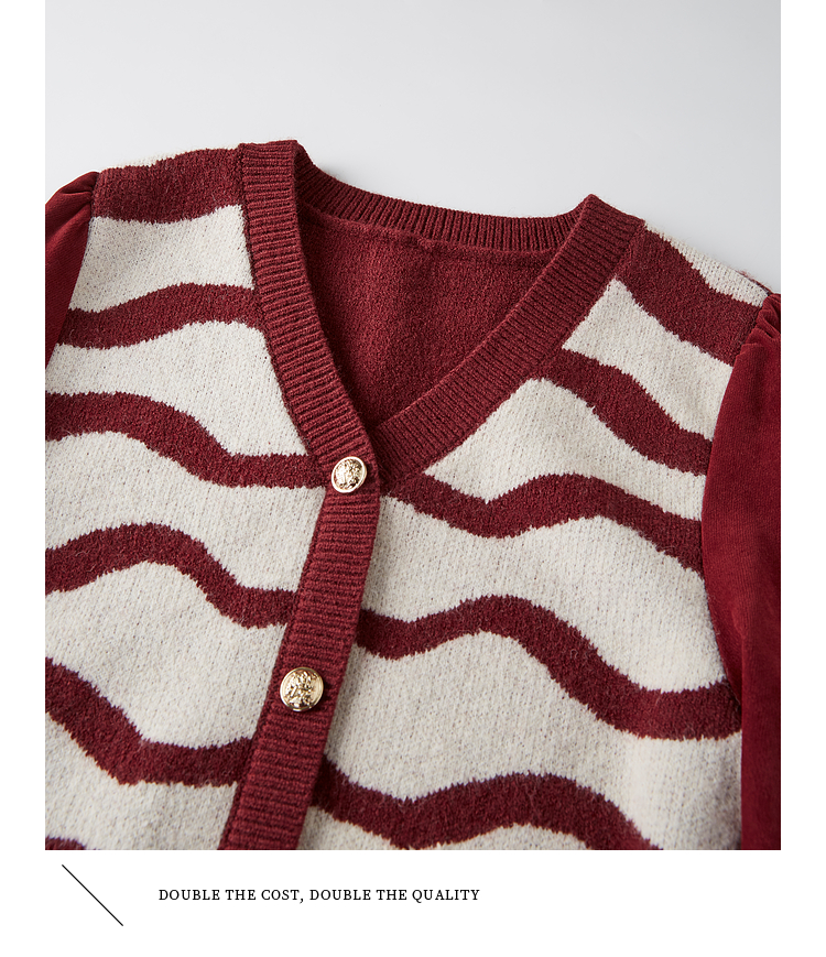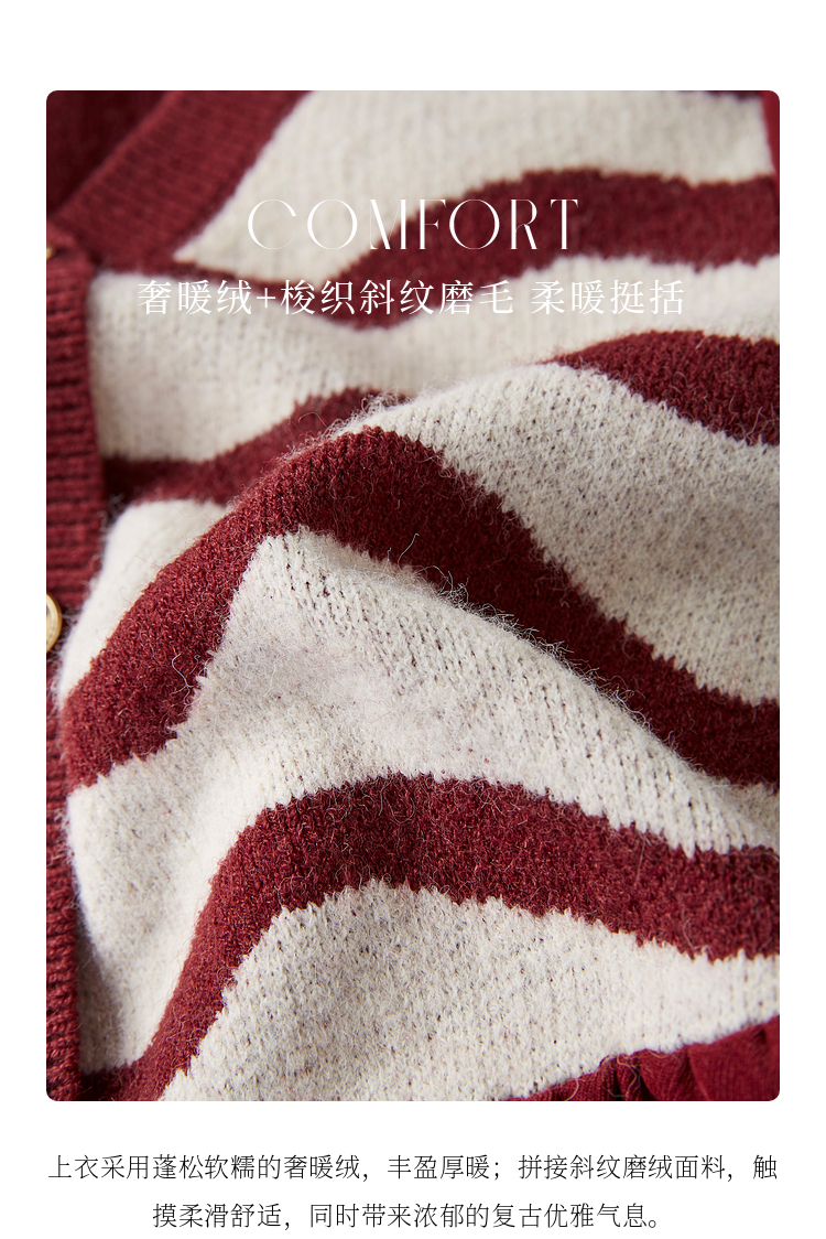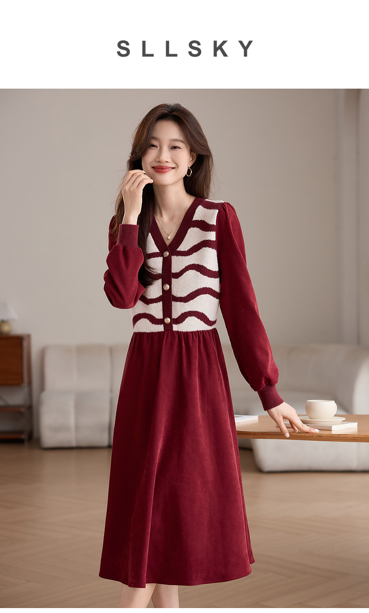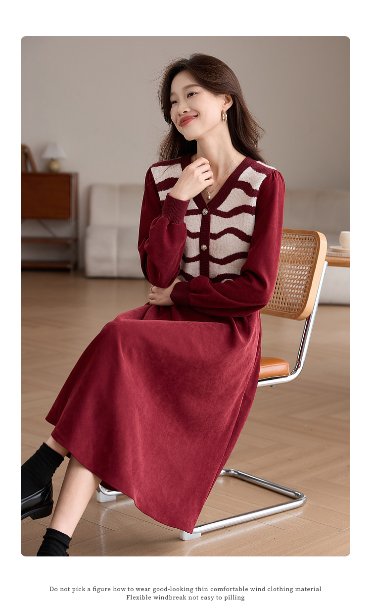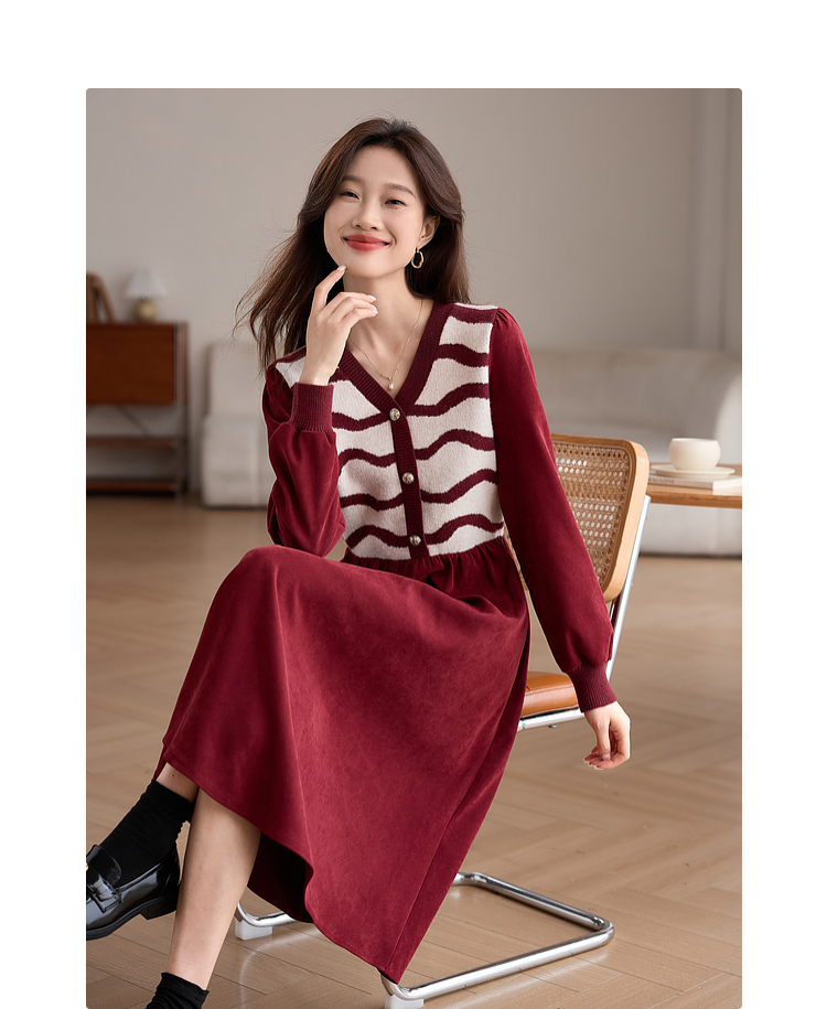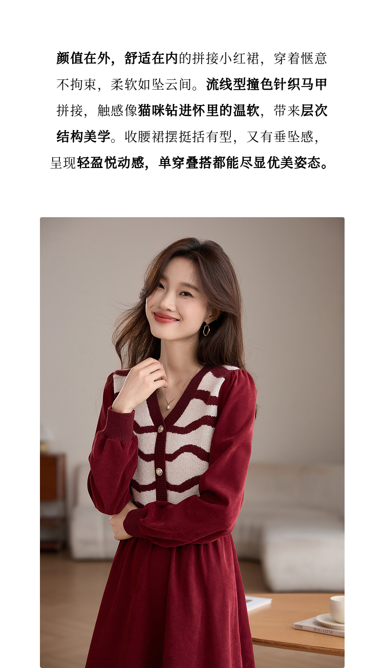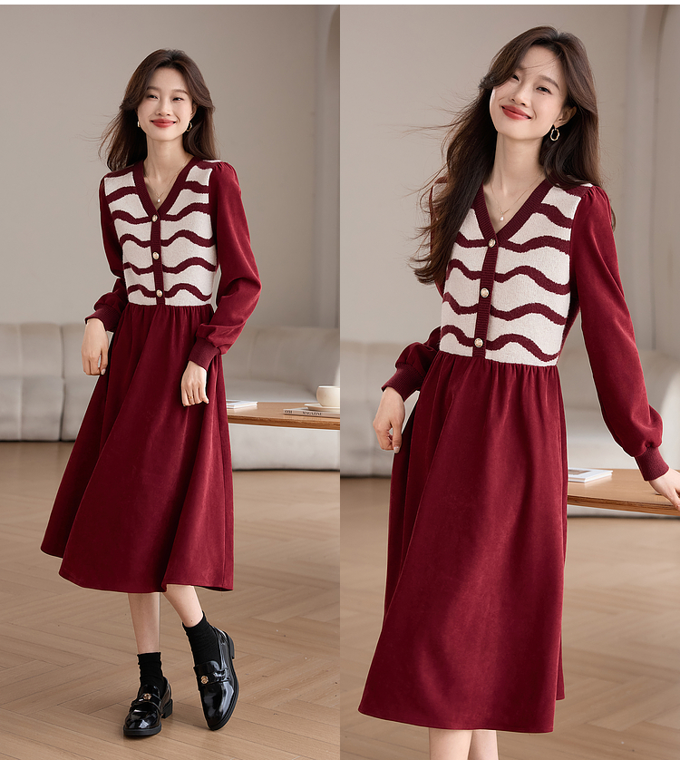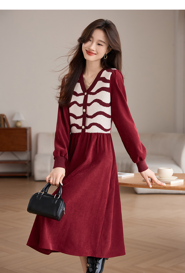【专属特价】熙世界2025冬季新款圣诞穿搭条纹针织拼接假两件V领红色连衣裙女