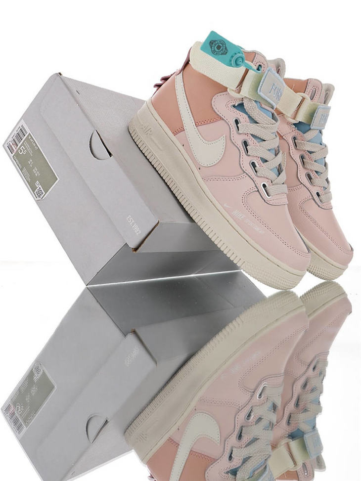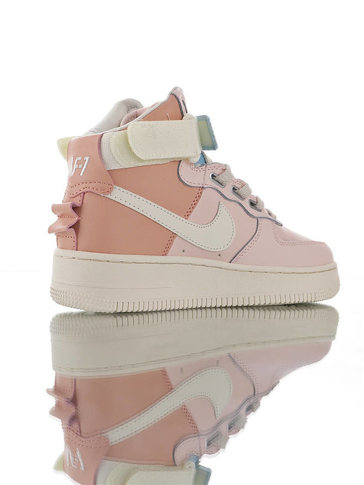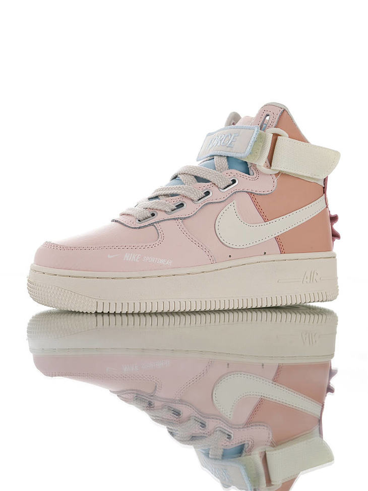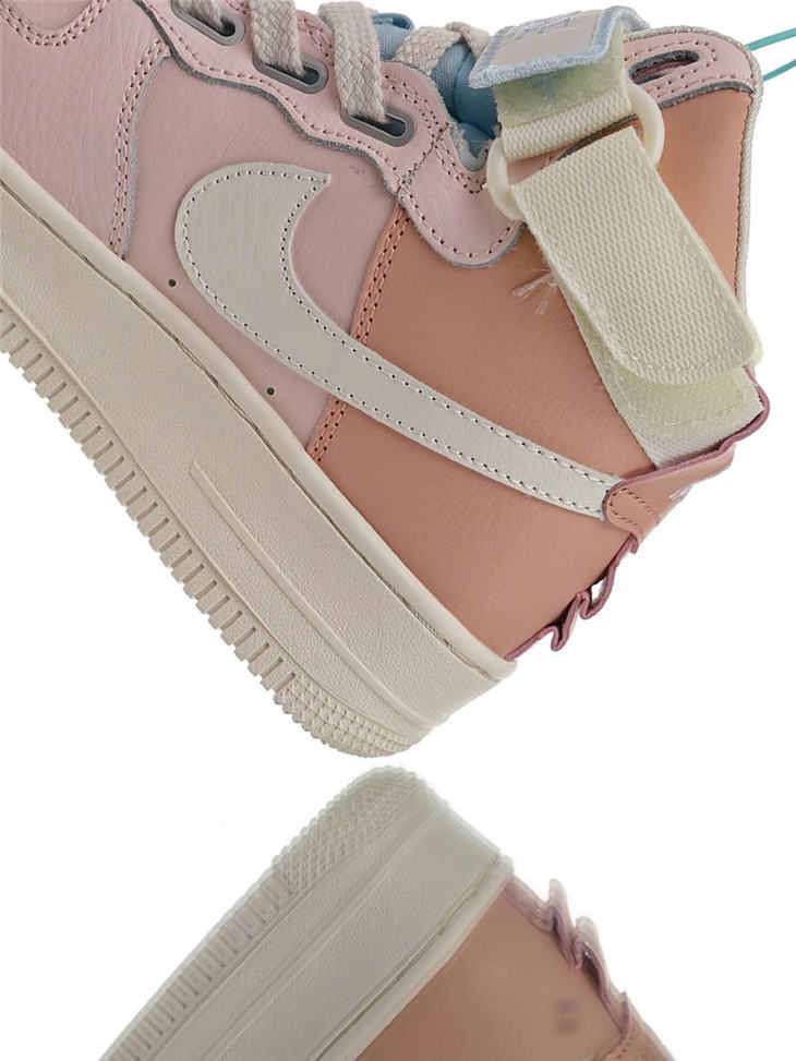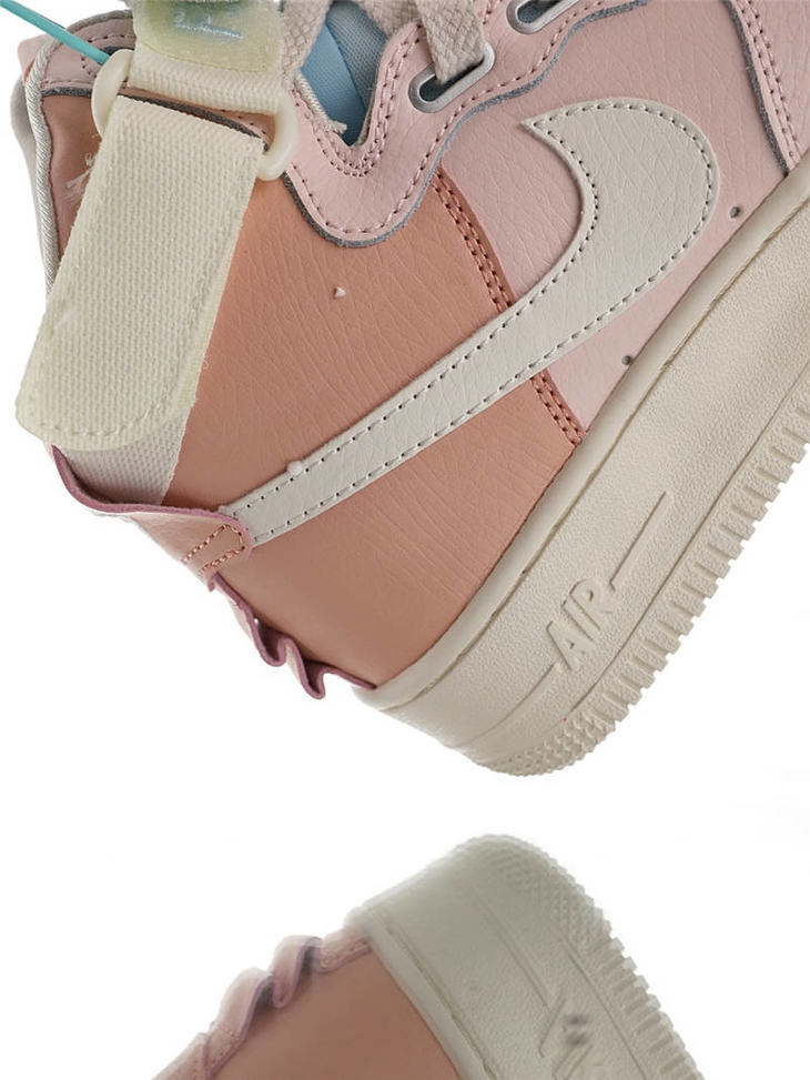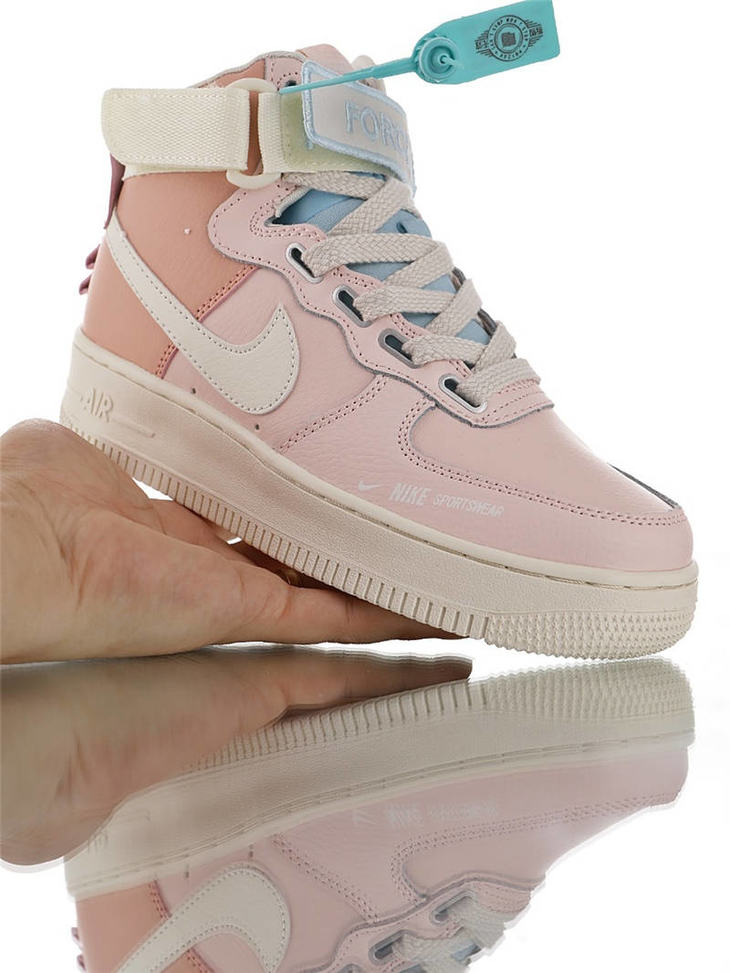 耐克Nike Wmns Air Force 1 High UT 替换LOGO魔术贴 原模具开发打造 采用移膜革荔枝皮材质 内置全掌air sole气垫 皮革樱花粉米白拼接