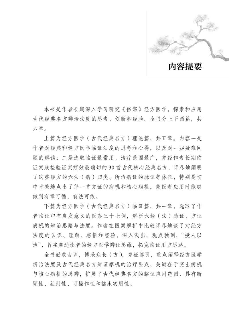 本书是毛进军教授长期深研读《伤寒》经方医学,在临证中不断探索和应用古代经典名方的思考、创新和经验。一是详尽地阐明了临证检验确有疗效的30首古代经典名方的辨治法度,应用时能够做到有章可循,有法可依;二是选取了作者临证中有启发意义的医案进行了详尽解读,深入浅出、旁征博引地阐述了作者应用经典名方临证的认识、理解和经验,特别突出每首方证的病机与核心病机思辨,扩展了临证应用范围。观点独到,授人以渔,旨在启迪读者的经方医学思维,拓宽临证应用经方的思路。有新颖性、独到性、可操作性和临床实用性。