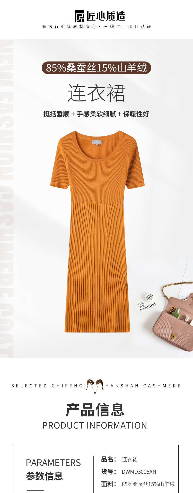 DWMD3005AN 丝绒款 东黎羊绒 女士夏季圆领气质开叉连衣裙春夏氛围感连衣裙