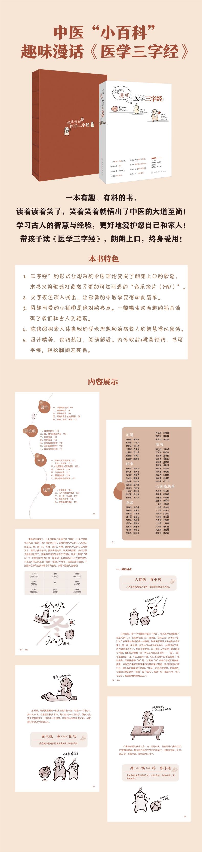 一本有趣、有料的书,读着读着笑了,笑着笑着就悟出了中医的大道至简!学习古人的智慧与经验,更好地爱护您自己和家人!带孩子读《医学三字经》,朗朗上口,终身受用!《医学三字经》是清代有名医家陈修园所著,总结了陈氏的医学经验。全书用三字韵语文体写成,朗朗上口,便于诵读记忆。为了帮助读者更加深入地理解原书内容,本书用生动有趣的语言、简单易懂的漫画,全面系统地讲述了中风、咳嗽、气喘、水肿、眩晕、妇人经产杂病等30多种病症、方药及自我防护细节,以时俗浅近之语道出阴阳、脏腑、四诊等中医基础知识,完备而实用,是初学中医的良好入门读本。