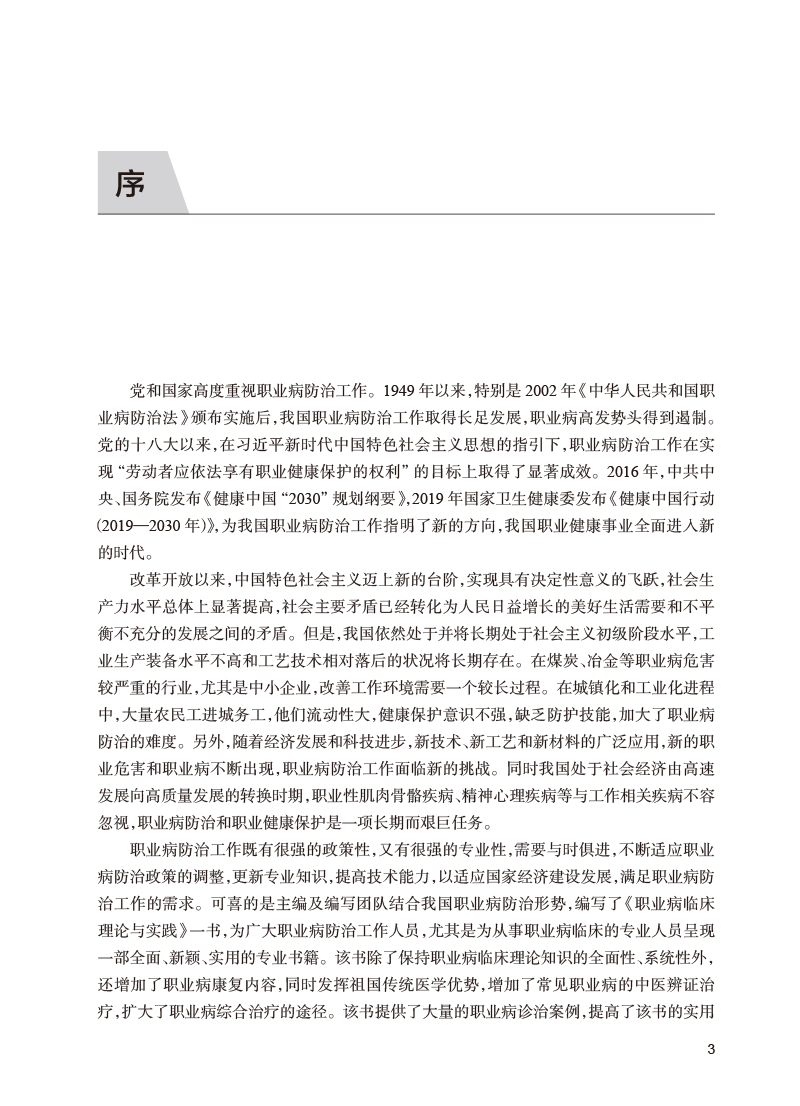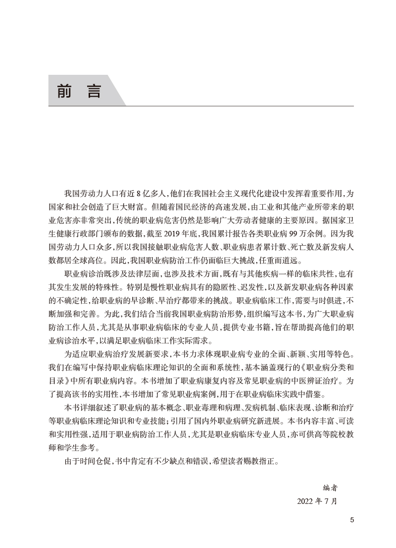 职业病诊治既涉及法律层面,也涉及技术方面,既有与其他疾病一样的临床共性,也有其发生发展的特殊性。特别是慢性职业病具有的隐匿性、迟发性,以及新发职业病各种因素的不确定性,给职业病的早诊断、早治疗都带来的挑战。职业病临床工作,需要与时俱进,不断加强和完善。为此,我们结合当前我国职业病防治形势,组织编写这本书,为广大职业病防治工作人员,尤其是从事职业病临床的专业人员,提供专业书籍,旨在帮助提高他们的职业病诊治水平,以满足职业病临床工作实际需求。本书在编写过程中以实践为落脚点,系统论述职业病基础理论,详细叙述我国法定职业病的防治、康复等临床知识和诊疗技术。本书尽量引用国内外职业病研究新进展、新技术、新方法。本书为读者提供职业病防治临床专业参考,并提供丰富的临床案例,满足读者实践需求。
