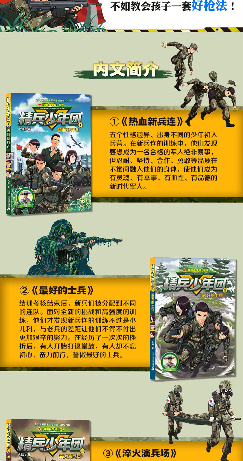 作家八路的军事题材儿童文学作品——《精兵少年团1》以当今大时代的军事变革为背景,讲述几名不同背景的少男少女入伍新一代的红师部队,铸炼成新“四有”军人的故事。该系列以少年儿童喜闻乐见的故事叙述方式,巧妙地书写强军之路,传承红色基因,是一部兼备趣味性、文学性和教育意义的主旋律出版物。