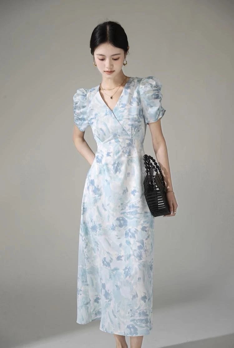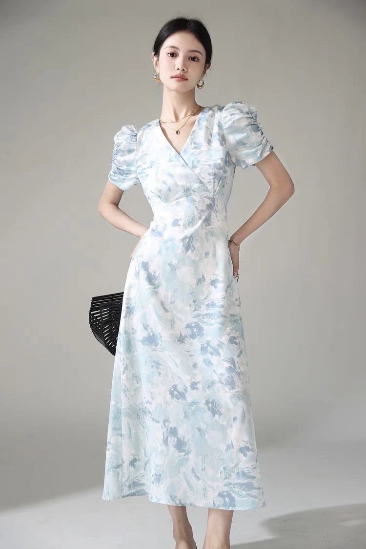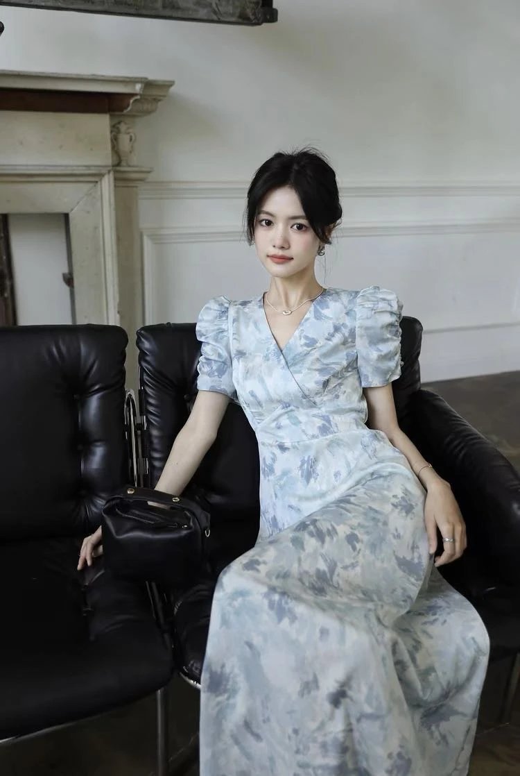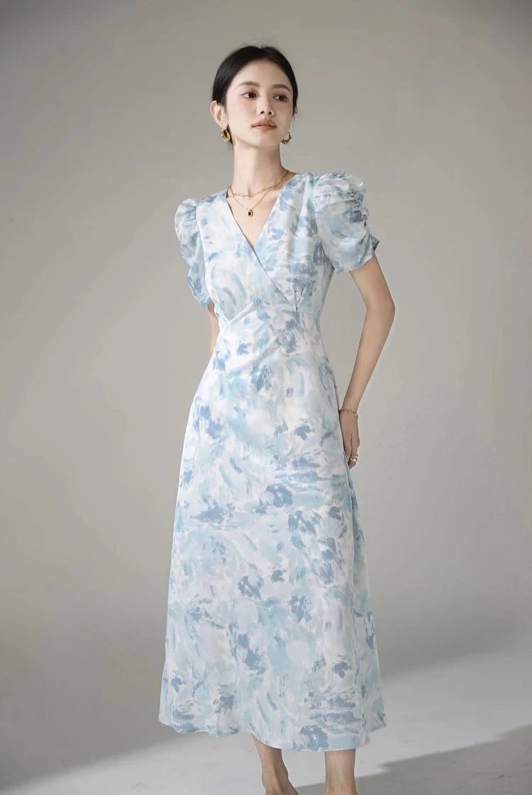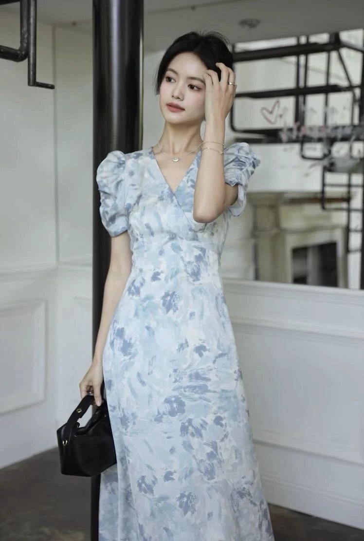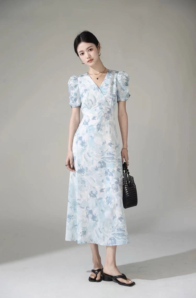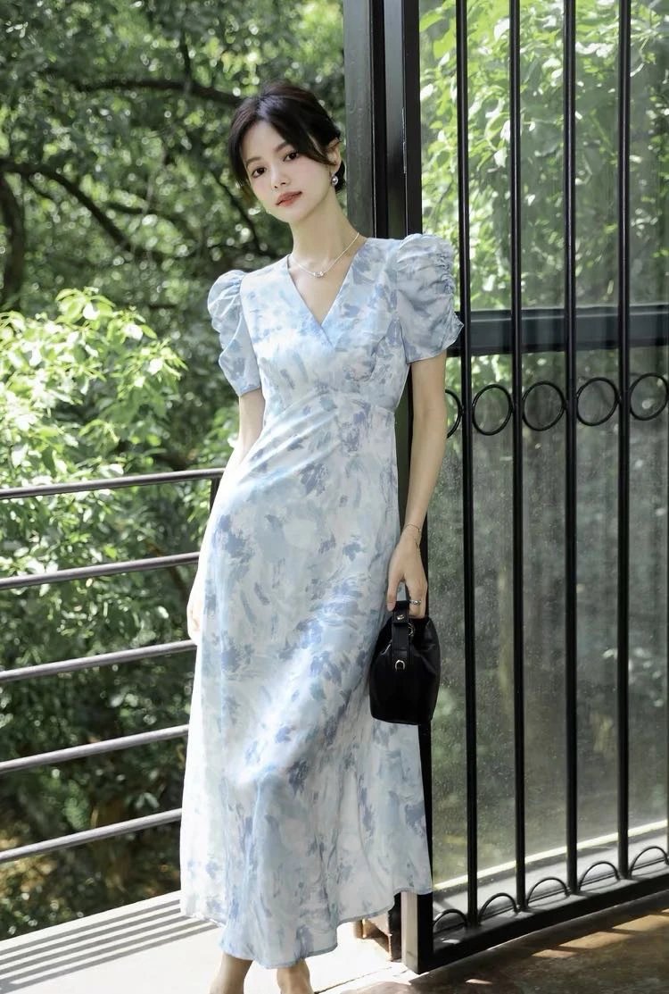 鸢尾漫蓝~手慢无⚠️D*ior 同源印花工艺加持⚠️品牌尾单连衣裙释出❗️浅蓝基底邂逅精美印花!V 领泡泡袖设计,高定质感拉满
