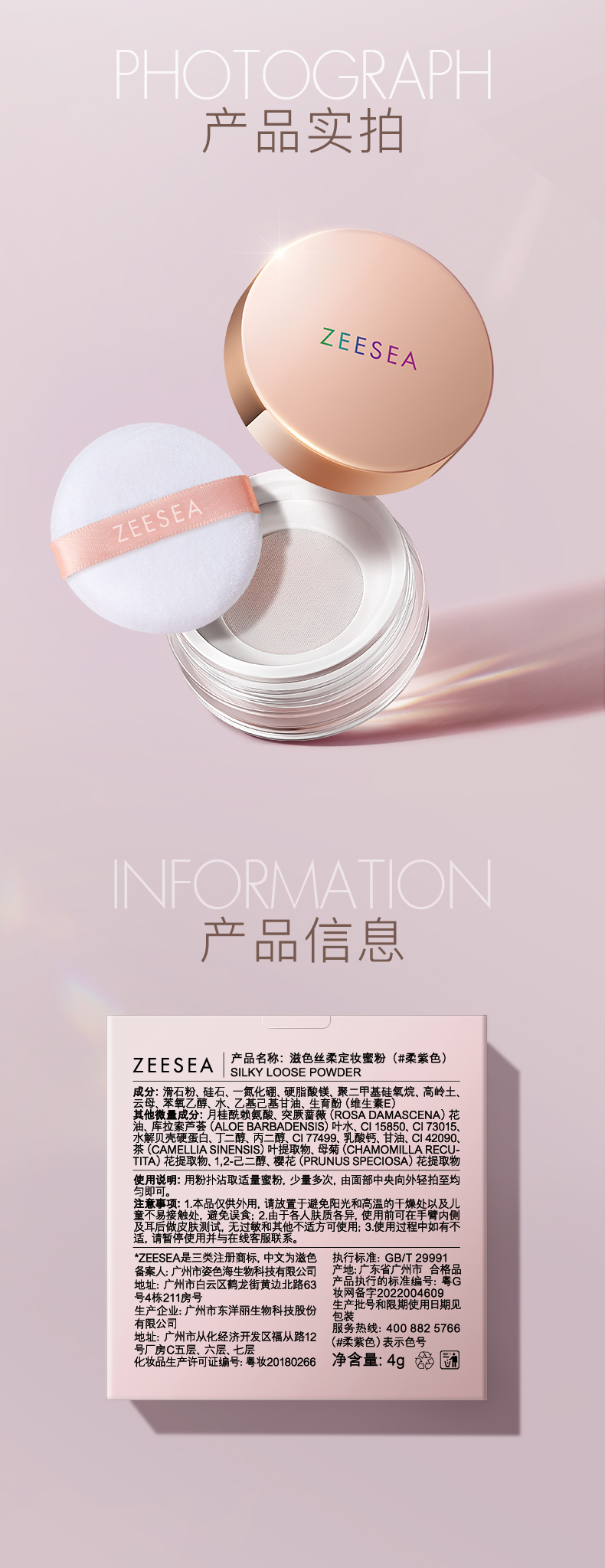 [蜜粉] 【2件5折 | 满3件送水桶包】ZEESEA滋色丝柔定妆蜜粉 玫瑰金盖版4g(新旧版本随机发货)