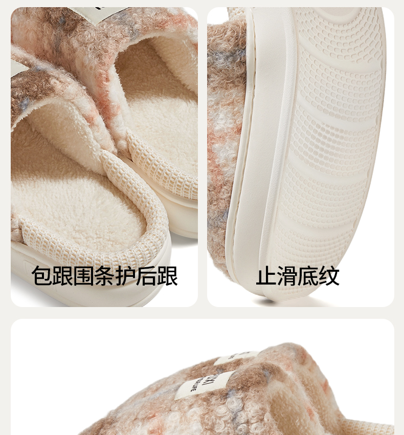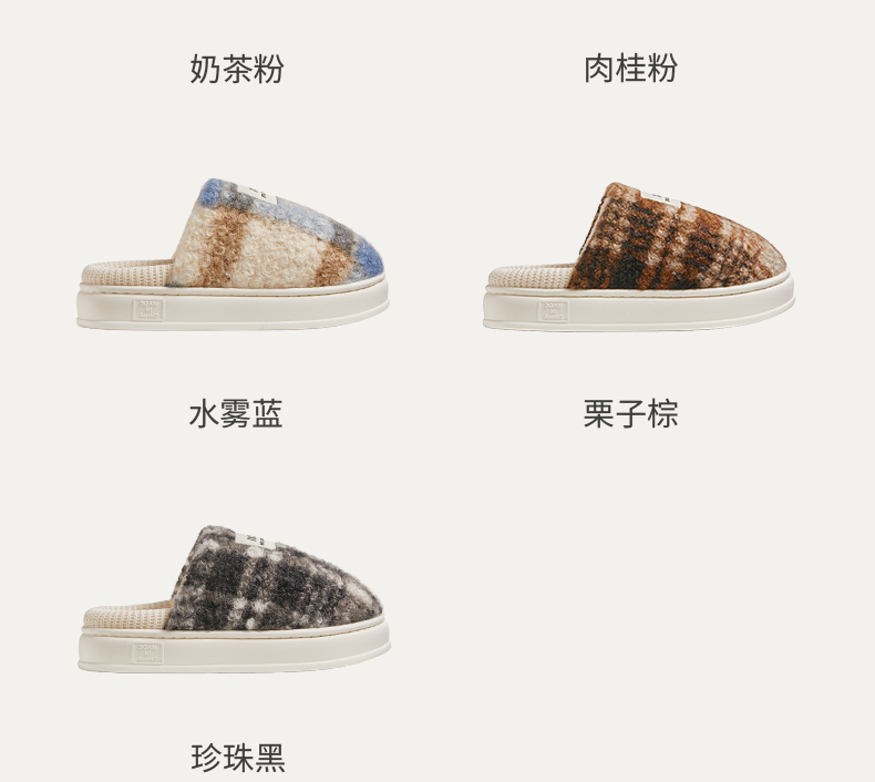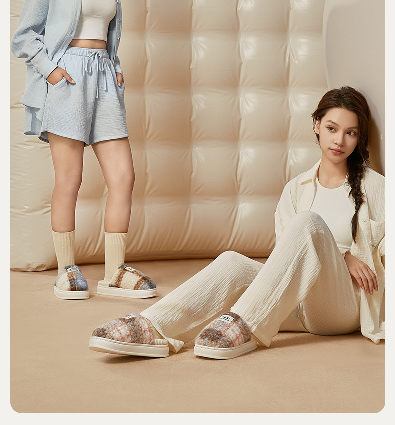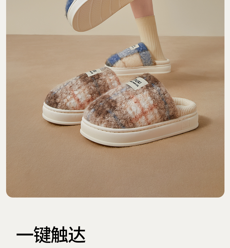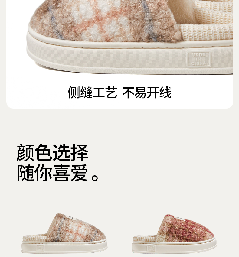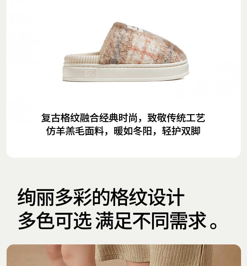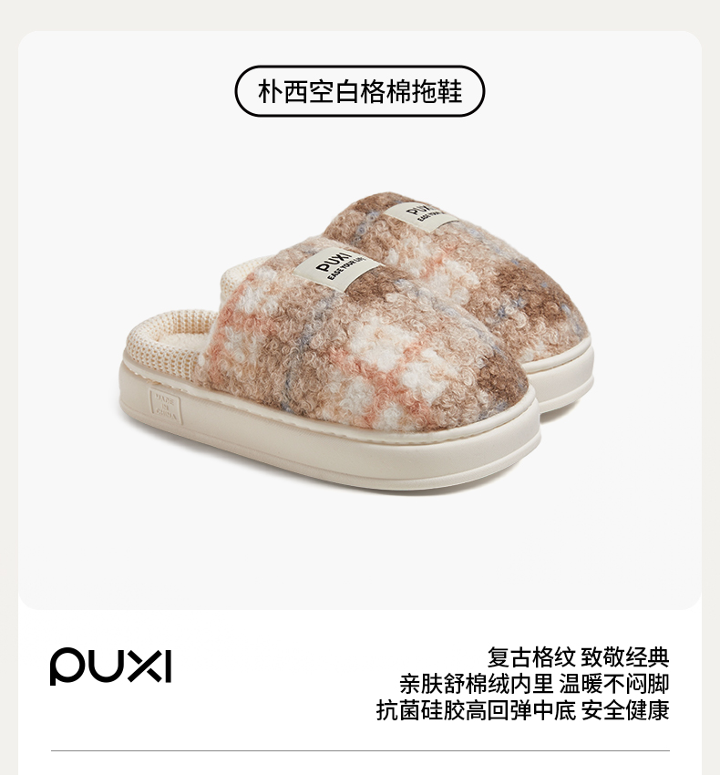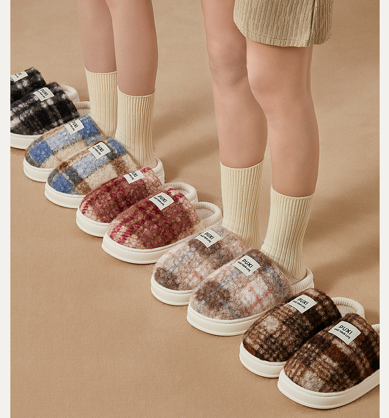 【专享】朴西空白格棉拖鞋女冬季家居保暖抗菌复古格纹加绒加厚拖鞋情侣