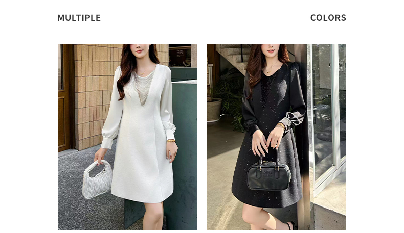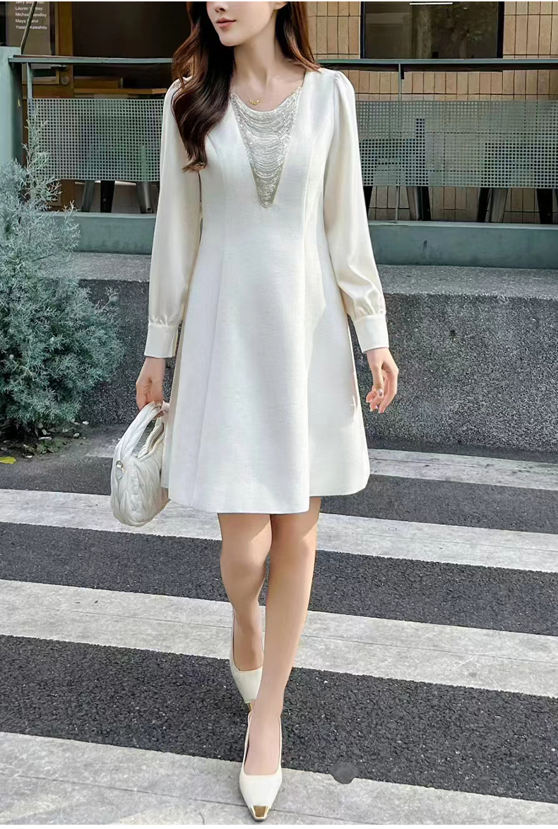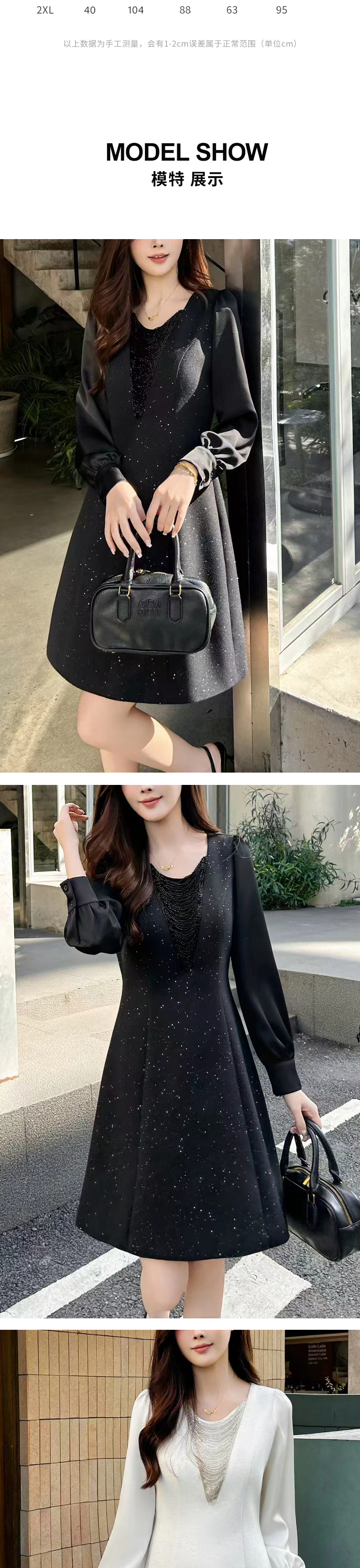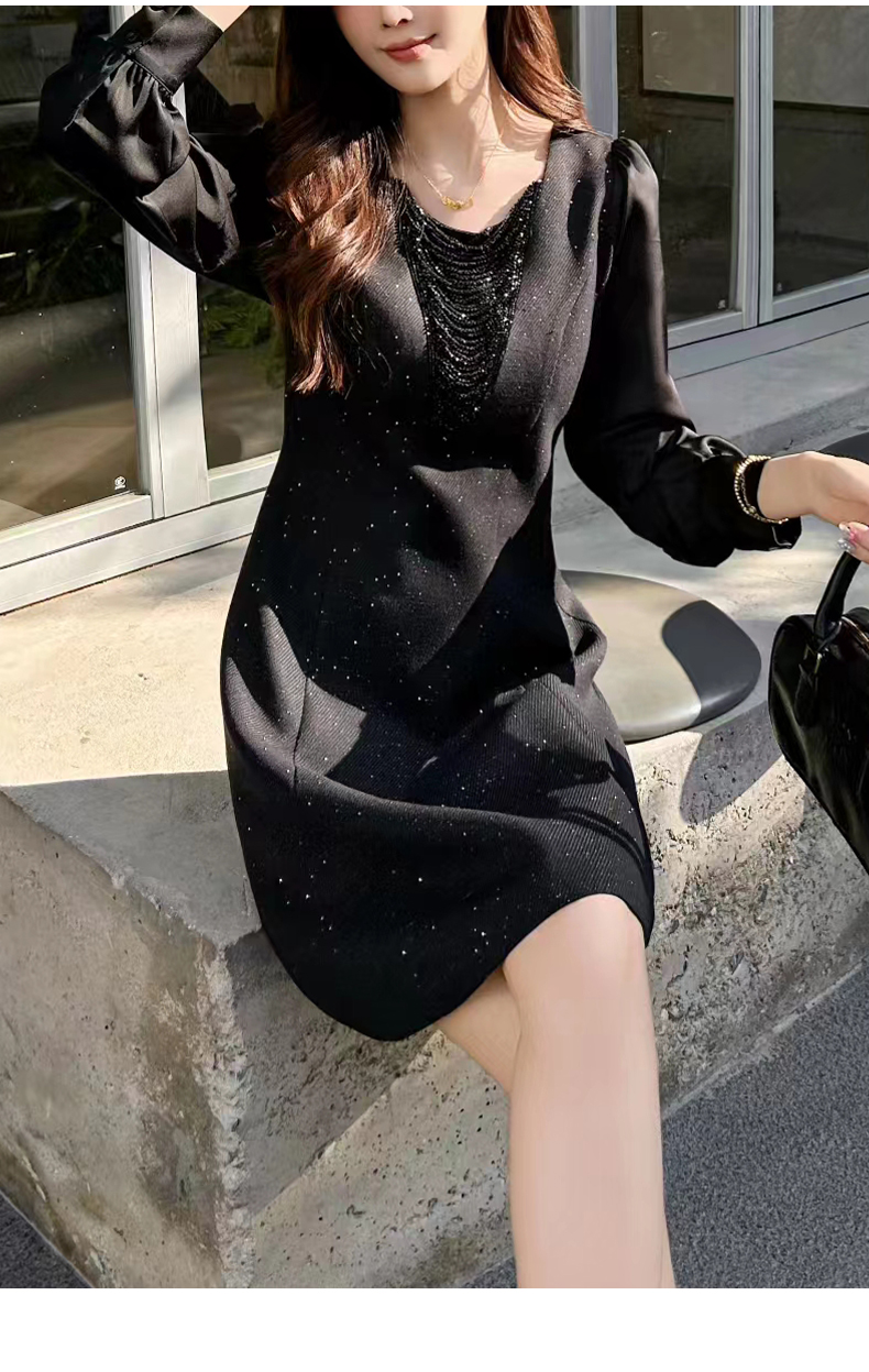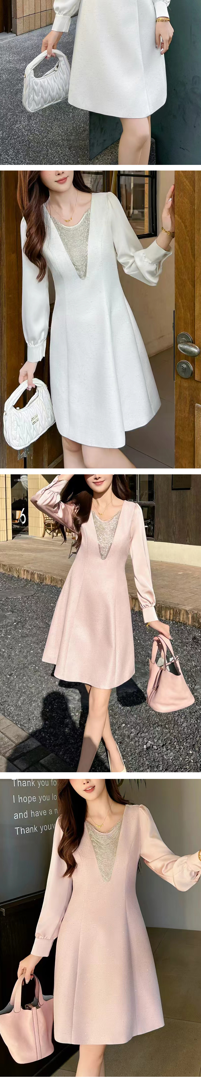 【浪漫轻奢】阿菁娜春季新款设计感钻链连衣裙V领修饰脸型拼接泡泡袖浪漫轻奢F31C212005
