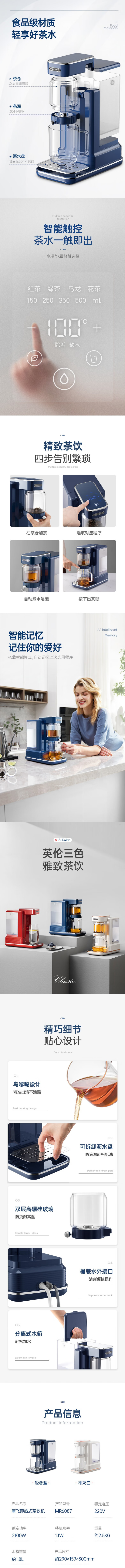 摩飞(13539)(一体式泡茶饮水2合1) 1.8L即热家用饮水机智能办公茶吧机一体式多段控温定量出水泡茶机MR6087