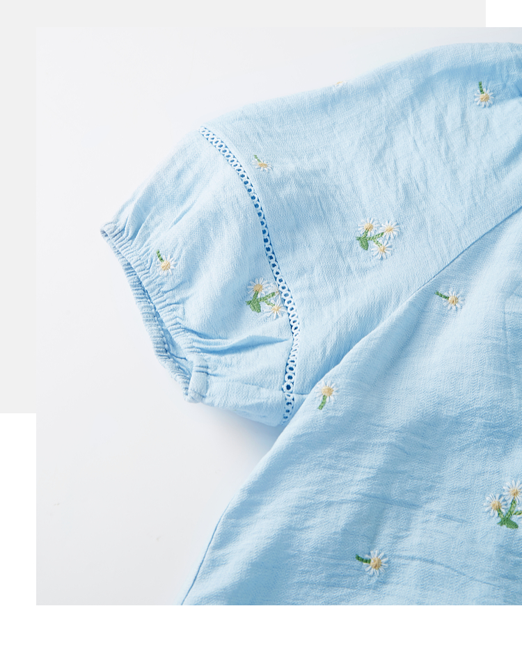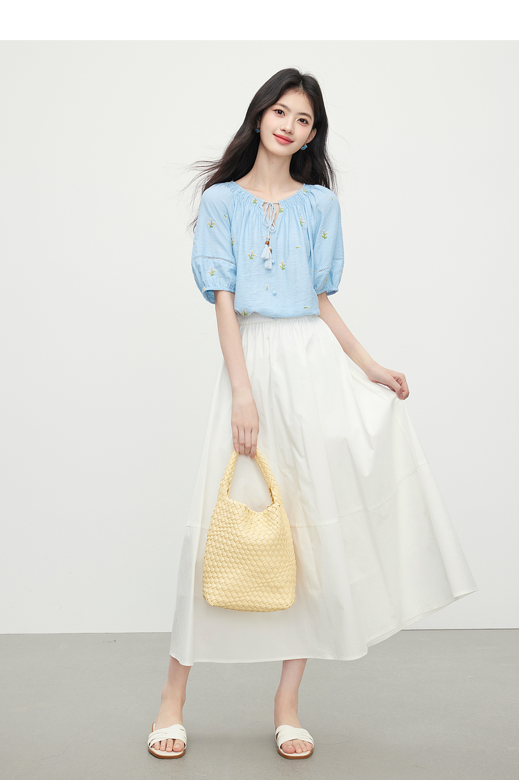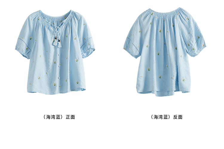 【周末秒杀】熙世界小清新植物刺绣衬衫女夏季新款宽松显瘦流苏系带泡泡袖上衣