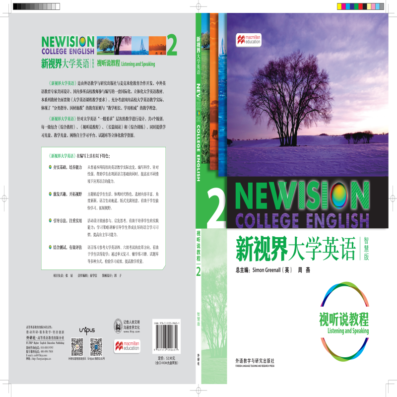 《新视界大学英语 视听说教程》语言真实生动。其视频、音频材料展现真实生动的交际场景,使学生感受世界多元文化,学习地道鲜活的语言。该教程视听素材多样,包括短对话、长对话、新闻、演讲、采访、辩论、故事等多种形式的视听材料为学生提供原汁原味的语料,提高听力,增强语感。该教程练习形式丰富,既有单项选择、填空等基础听力练习,提高学生泛听与精听能力,又有记笔记、问答、讨论等提高练习,进一步训练学生的听力技能。口语活动循序渐进,从发音训练、对话模仿到不同形式的自由表达,帮助学生逐步提高口头表达能力。该教程教学模式多维,教材、光盘、网络三位一体,为教学提供生动鲜活的材料,满足学生课堂学习与课外自主学习的需要;教学课件与试题库辅助教师教学。