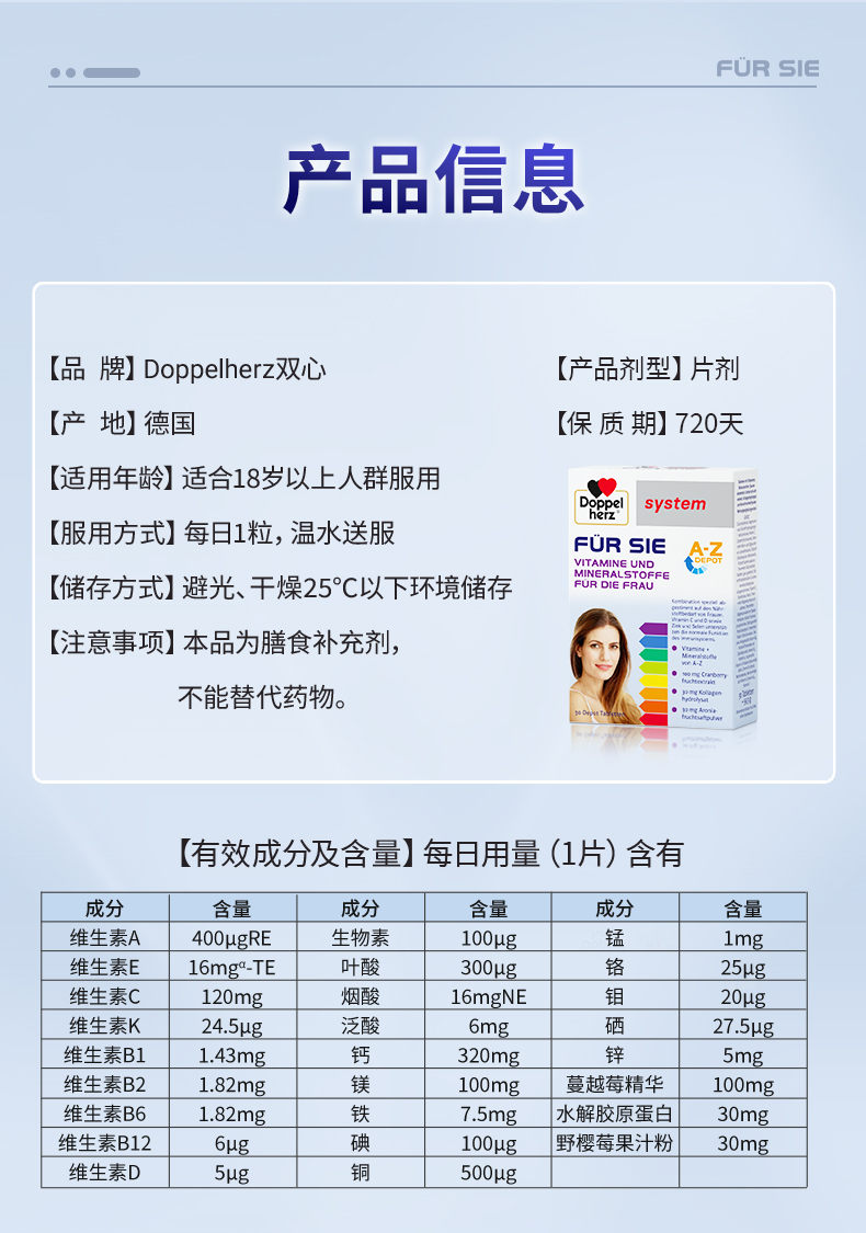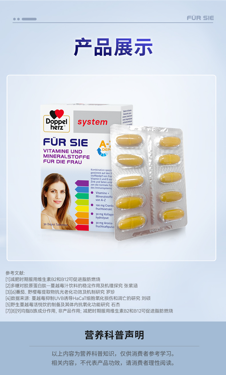 【德国双心】 女士复合维生素30片胶原蛋白活力精华缓释片 3盒装