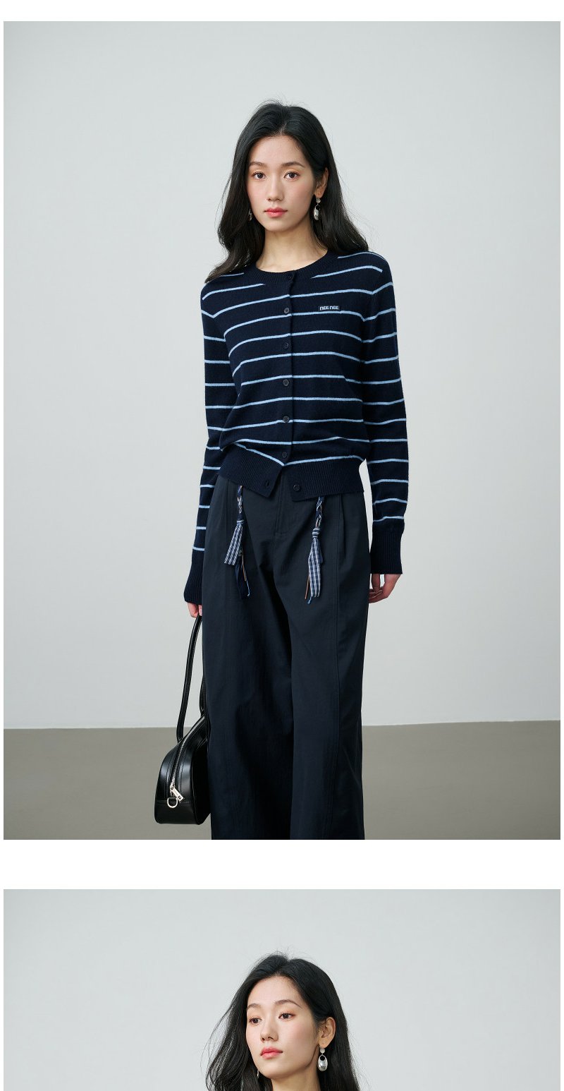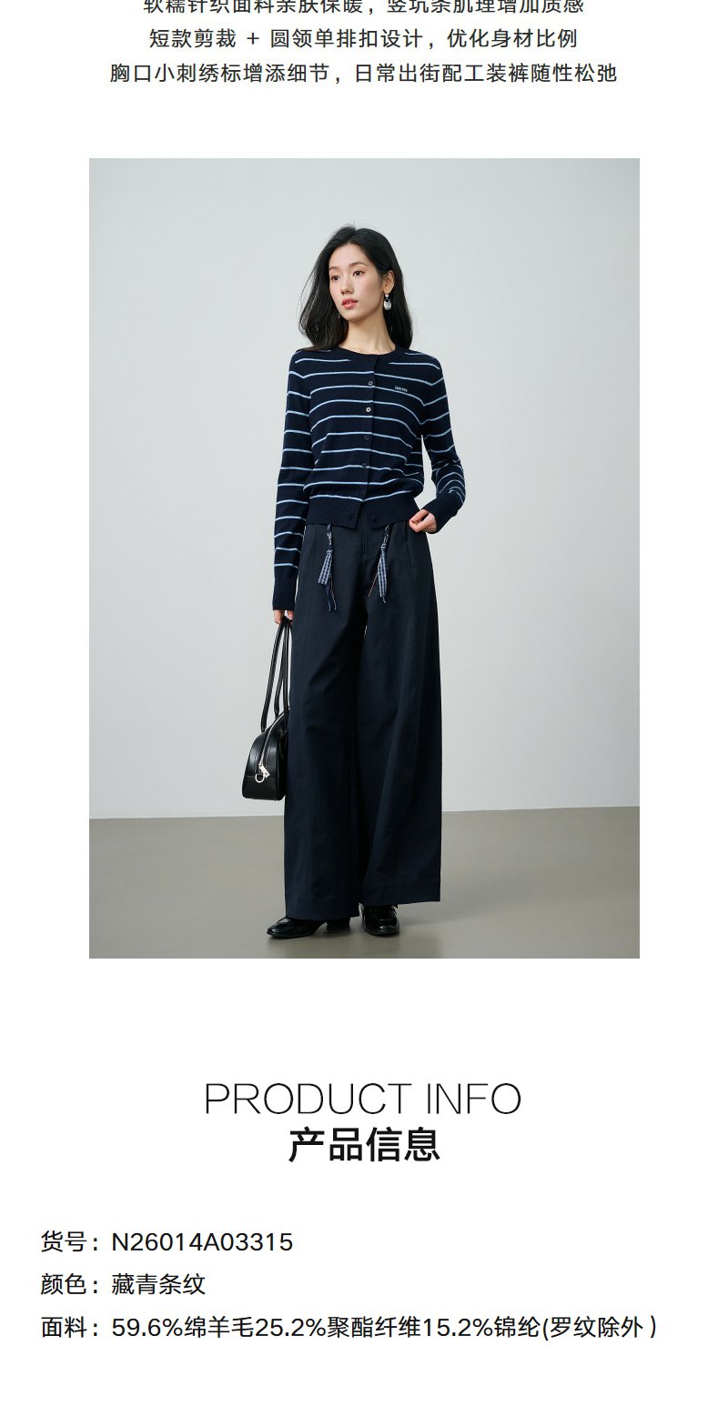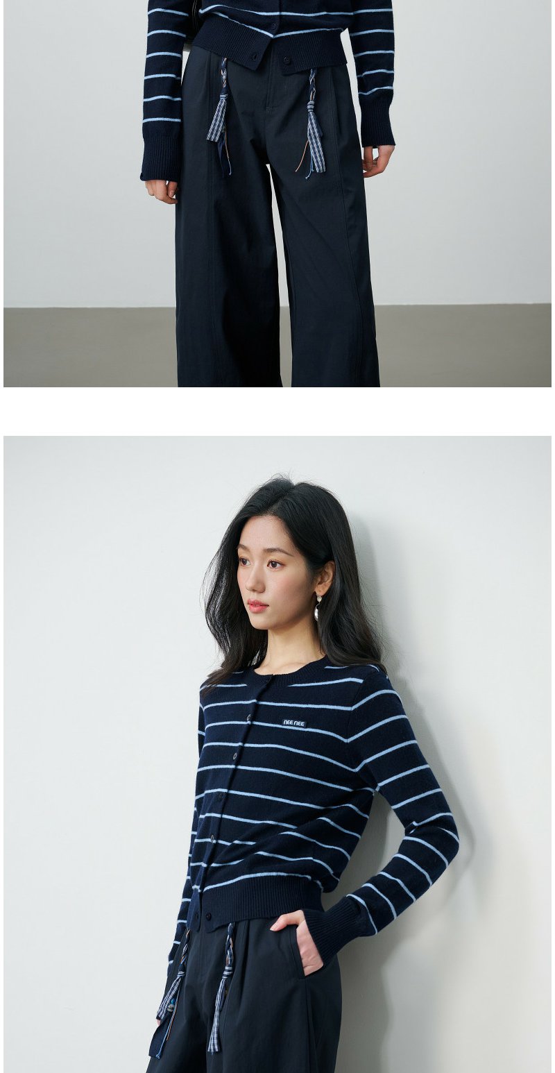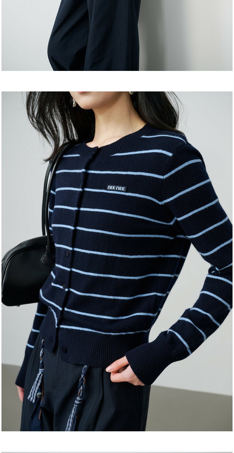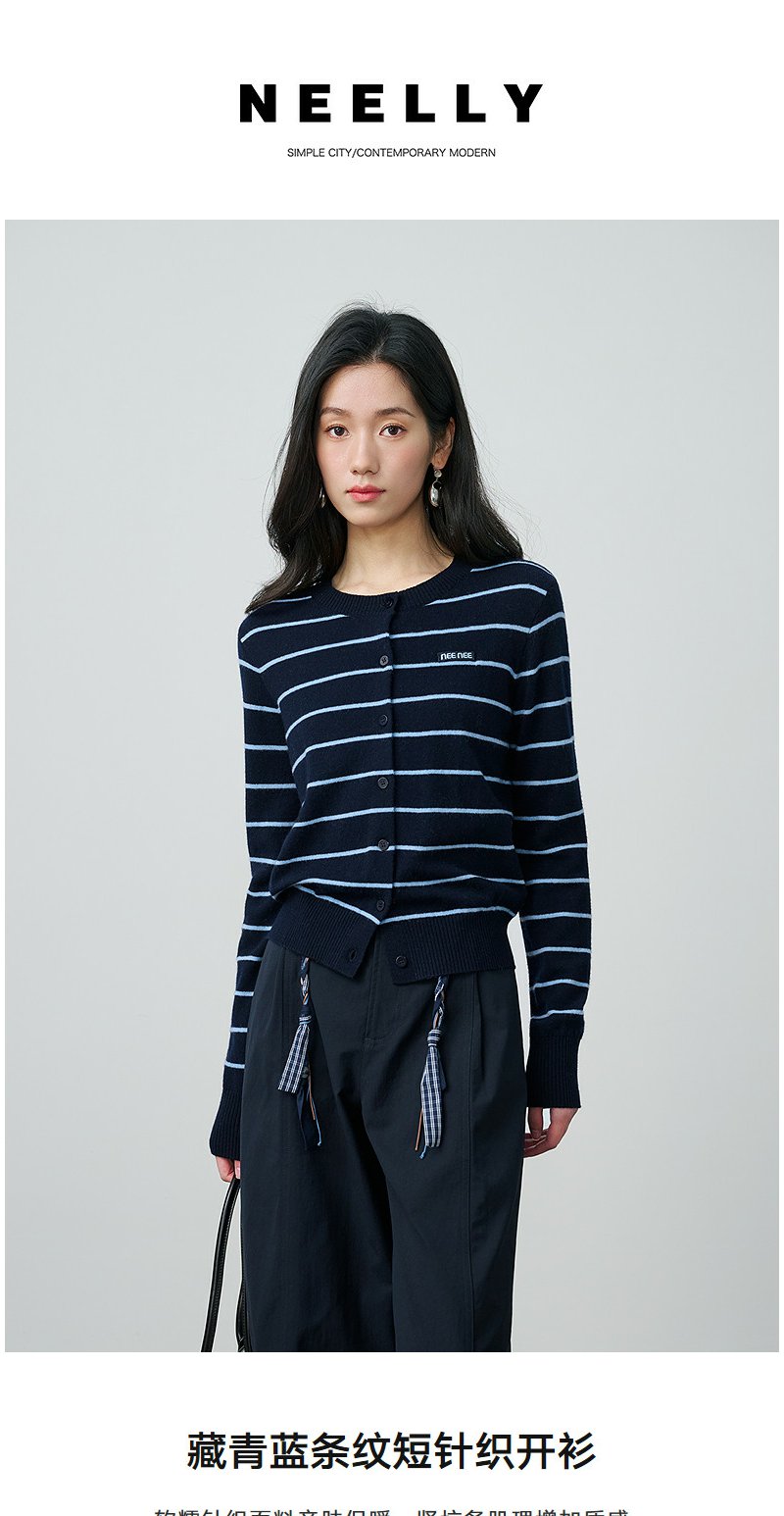 NEELLY纳俪商场同款春季新款藏青蓝条纹短针织开衫女显白休闲上衣N26014A03315