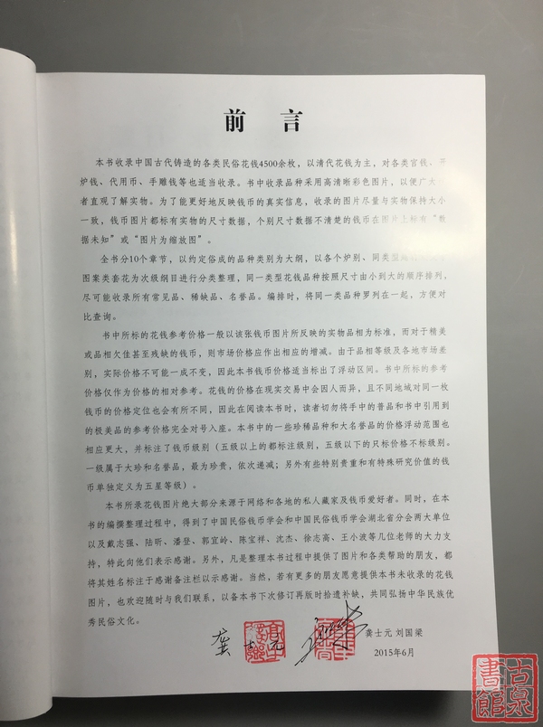 全书收集5800余枚历朝历代民俗花钱,采用高清晰彩色实物图片。全书分10个章节,以约定俗成的品种类别为大纲,以各个炉别,同类题材或文字图案类套花为次级纲目,同一类型品种尺寸由小到大摆列,对绝大部分钱币标有具体尺寸和价格或等级。该书印刷精美,采用硬封面烫银工艺,铜版纸精装印刷,厚度6厘米,总计856面,16开纸张大小,每本均有作者龚士元、刘国梁两人签名,钤印。