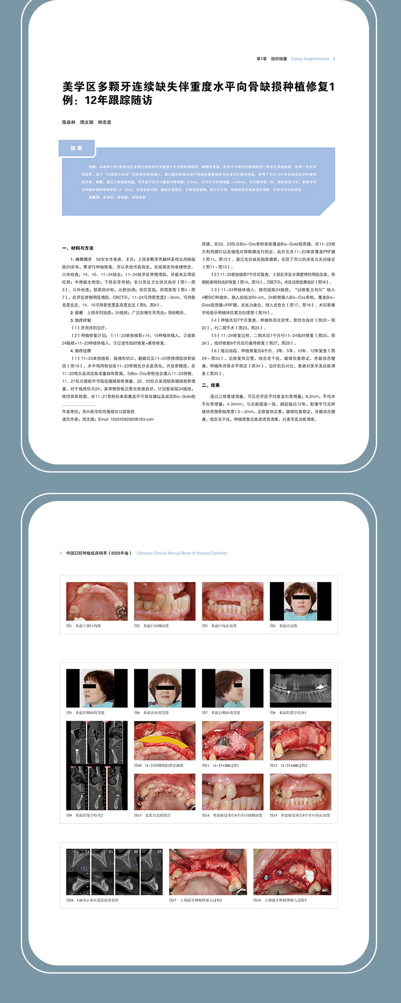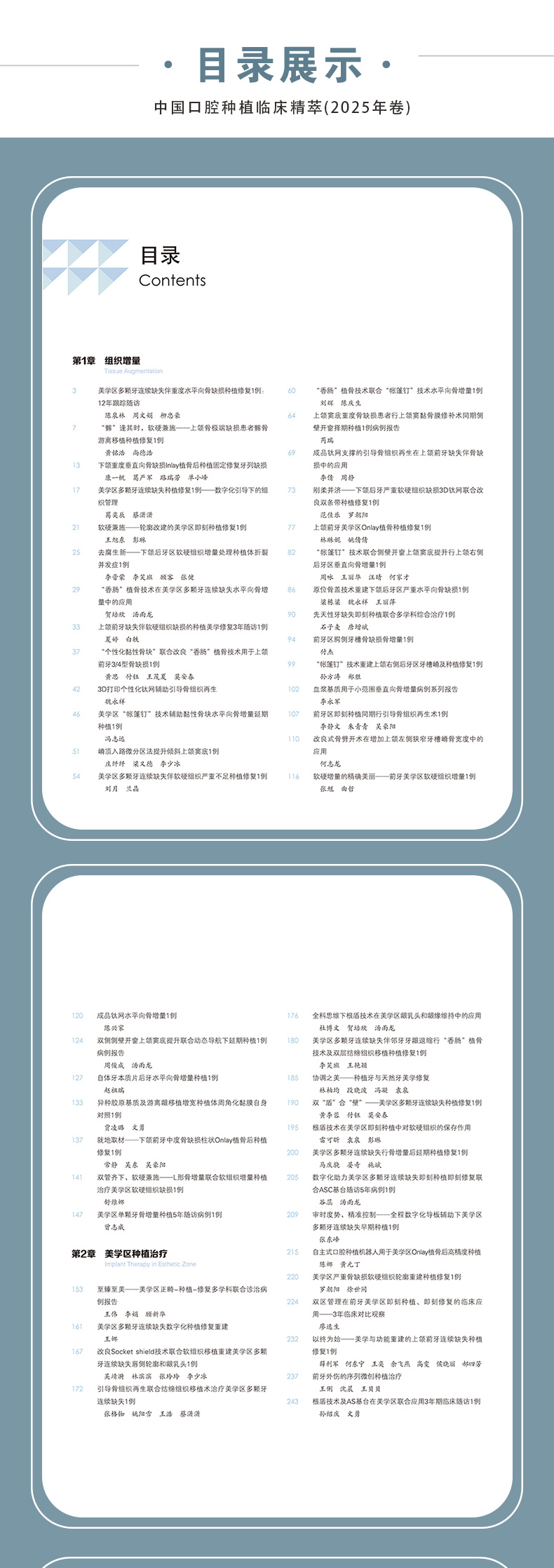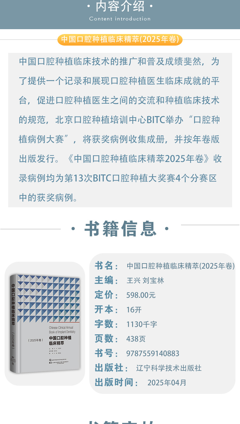 中国口腔种植临床技术的推广和普及成绩斐然,为了提供一个记录和展现口腔种植医生临床成就的平台,促进口腔种植医生之间的交流和种植临床技术的规范,北京口腔种植培训中心BITC举办“口腔种植病例大赛”,将获奖病例收集成册,并按年卷版出版发行。《中国口腔种植临床精萃2025年卷》收录病例均为第13次BITC口腔种植大奖赛4个分赛区中的获奖病例。