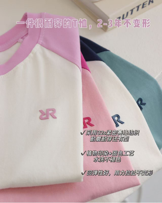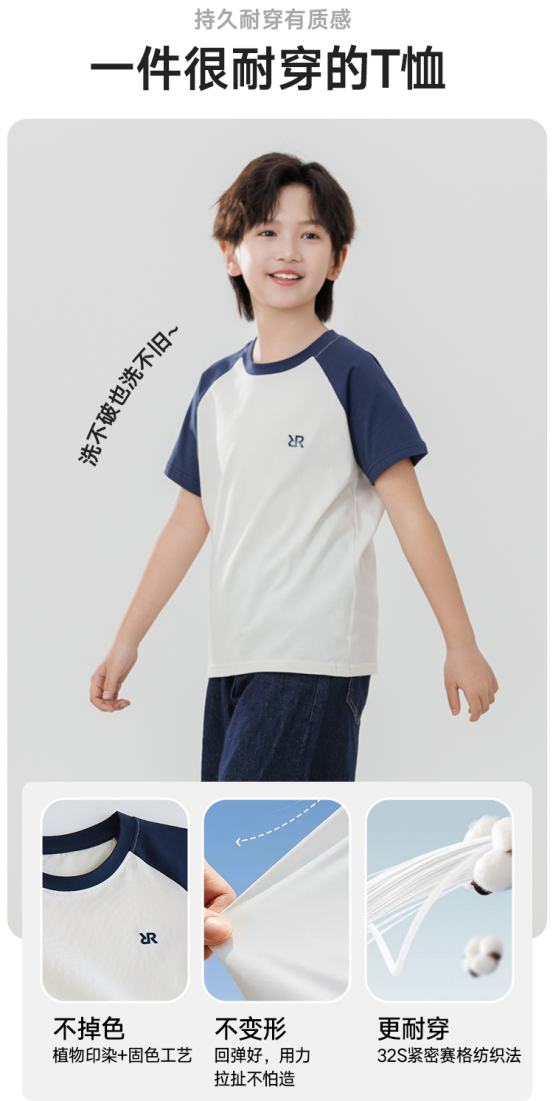 采用32S紧密赛络纺织法 紧实细密,耐磨耐穿 植物印染+固色工艺 水洗不易褪色 回弹性好,用力拉扯不变形 一件很耐穿的T恤,小朋友穿衣再费也不怕