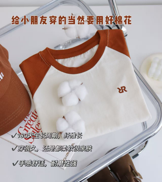 给小朋友穿的当然得用好棉花 高克重定染的精梳棉 每一朵棉花晒过日光浴 经过180天的生长周期 每一根纤维长度都≥35mm 穿很久还是很柔软 亲肤挺括,手感舒适,耐磨性强