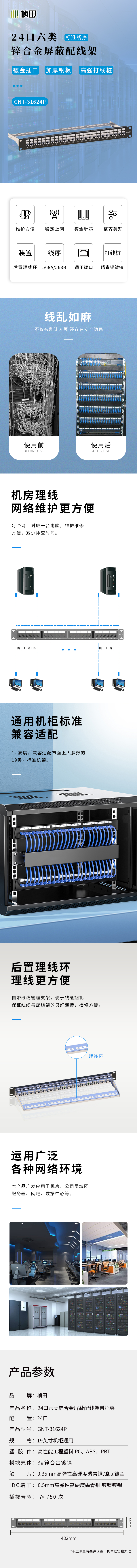 24口六类锌合金屏蔽配线架带托架带模块31624P