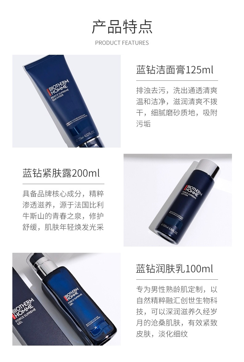 【加量版】法国 Biotherm碧欧泉 男士御尊蓝钻紧肤三件套 套盒(洁面125ml+水200ml+乳液100ml)