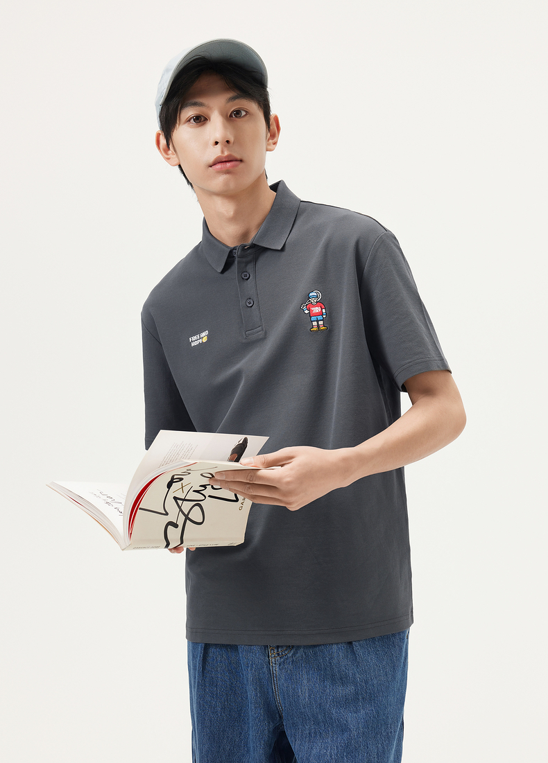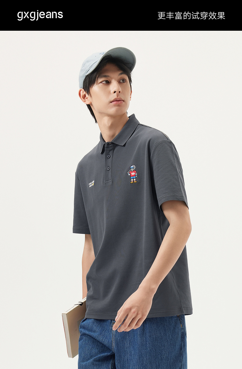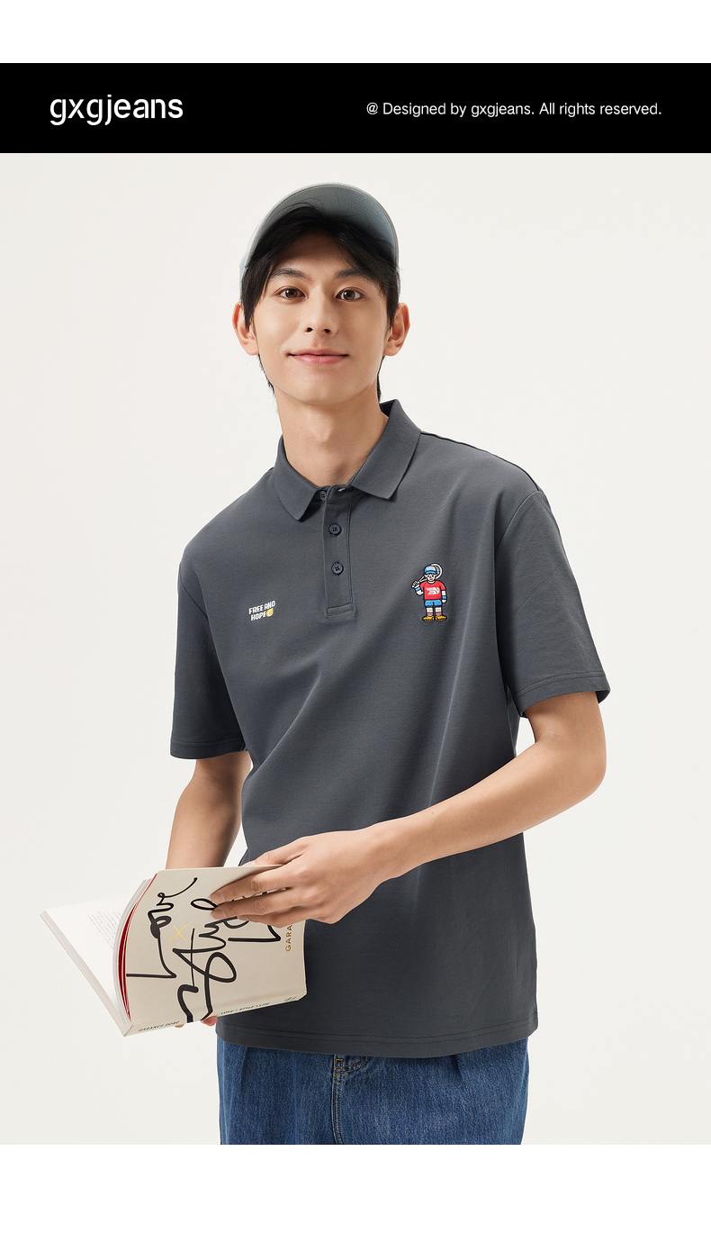 gxg.jeans男装 灰色趣味绣花商务翻领短袖polo衫男 25年夏热卖