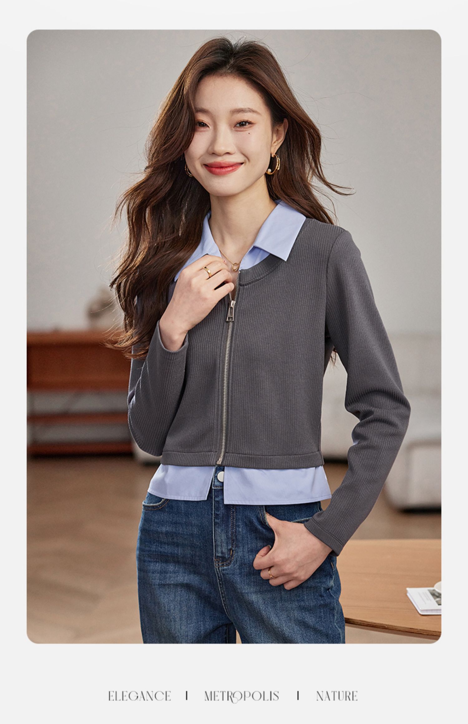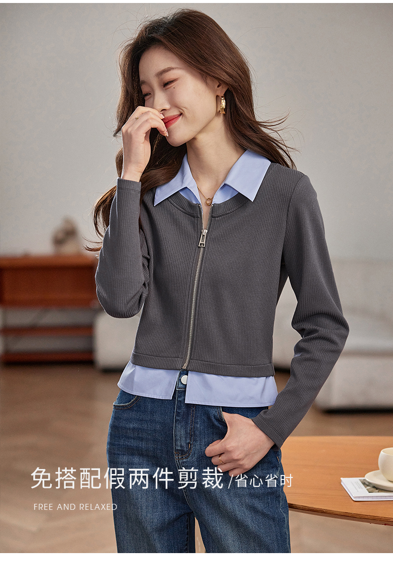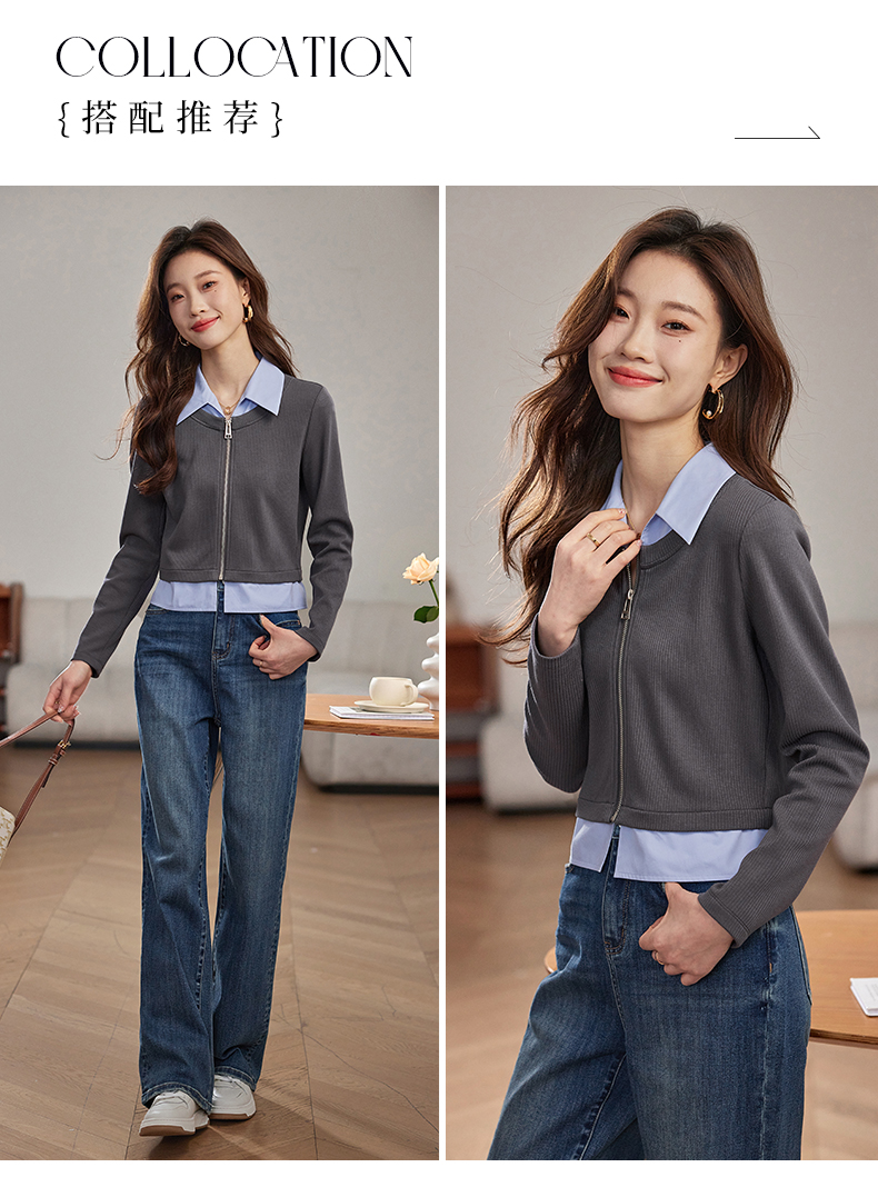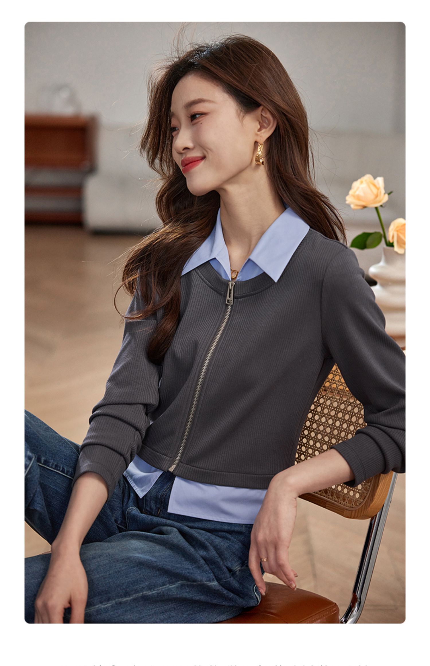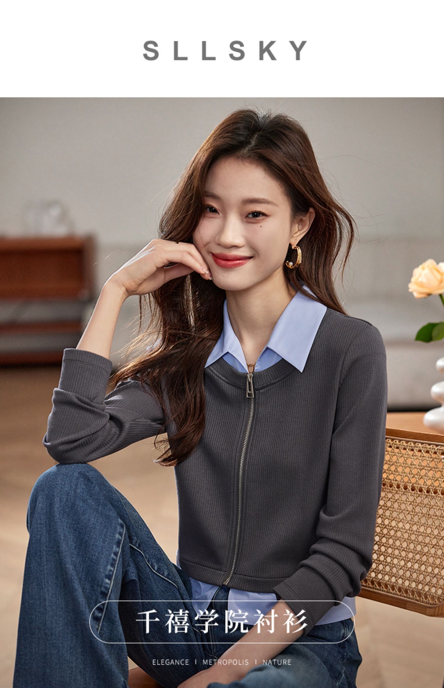 【年终特卖】熙世界设计感假两件polo领衬衫女2025秋款拉链针织拼接别致衬衣