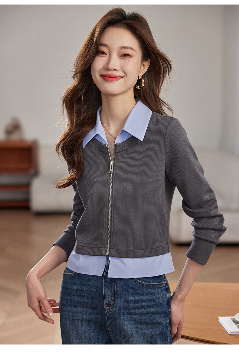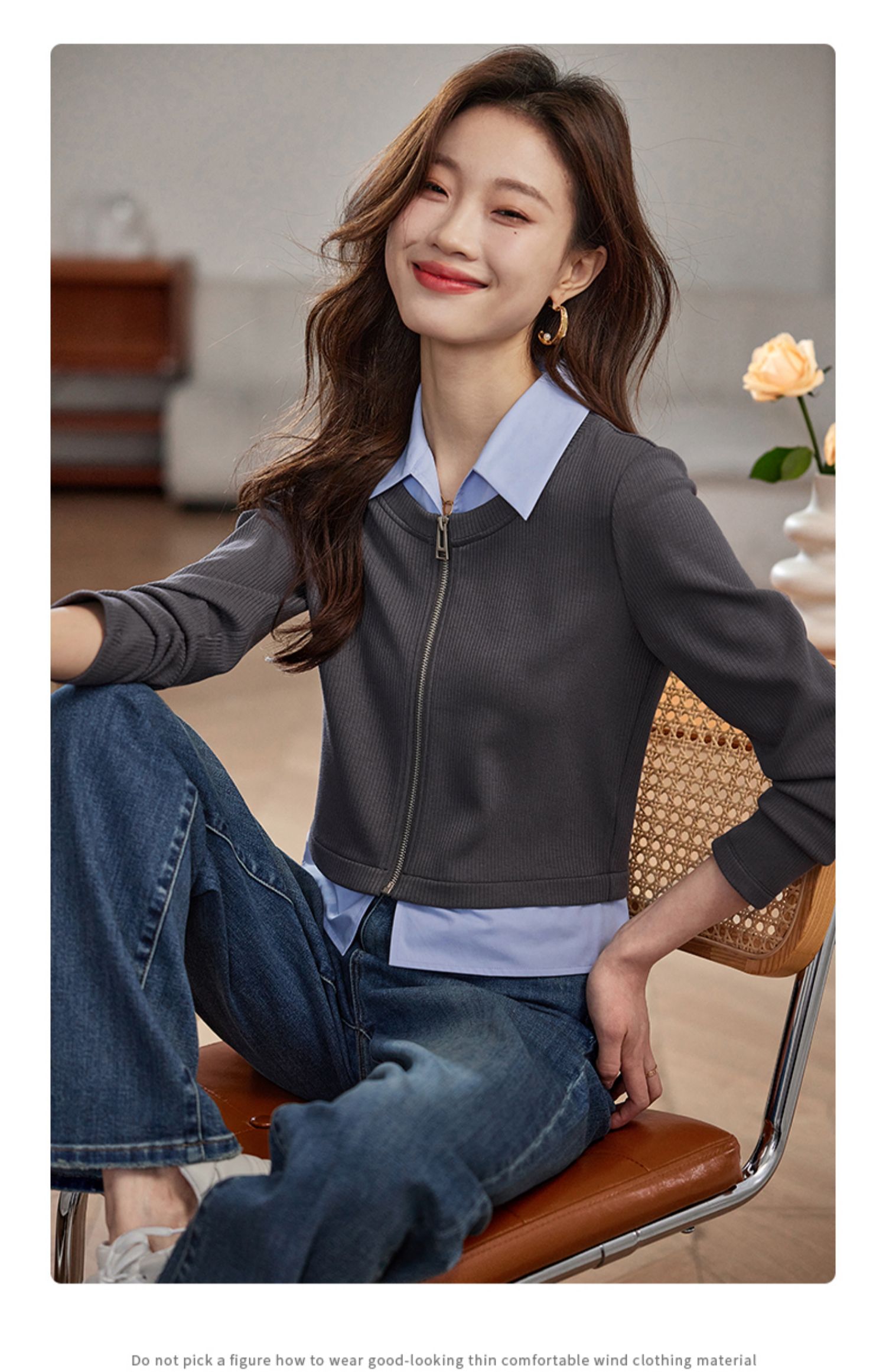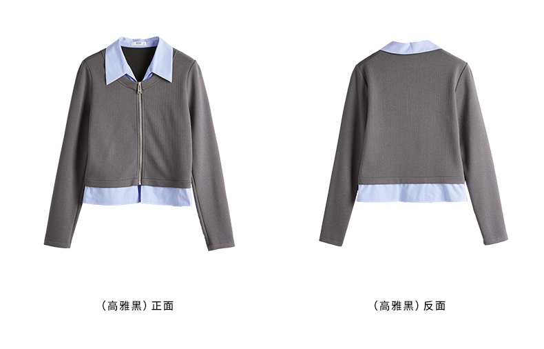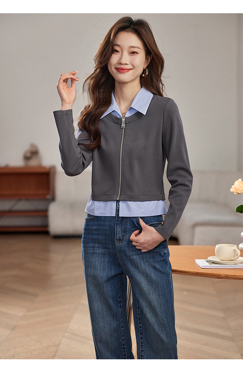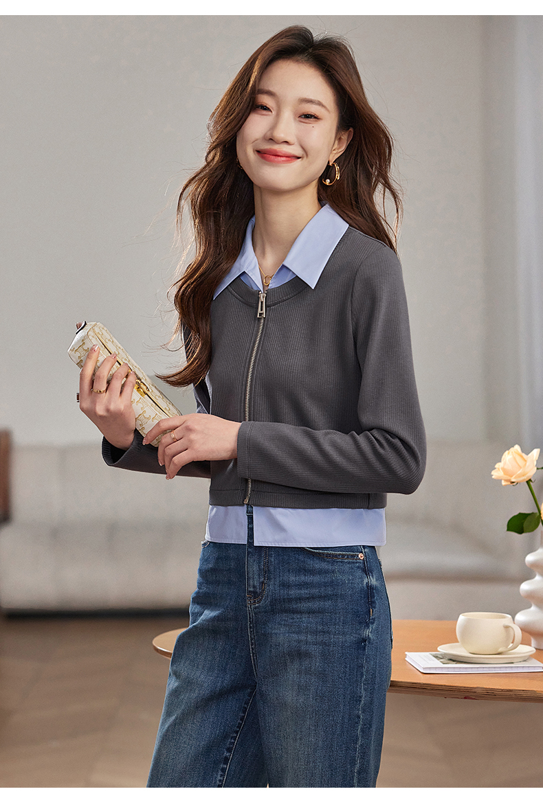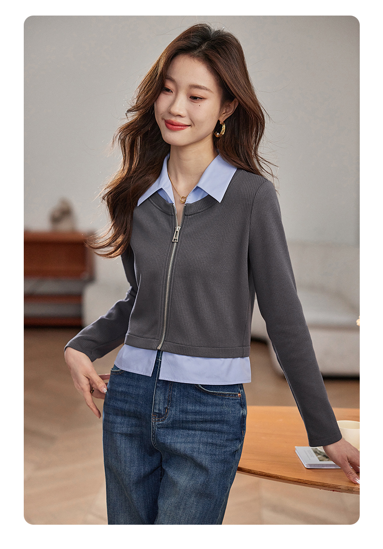 【年终特卖】熙世界设计感假两件polo领衬衫女2025秋款拉链针织拼接别致衬衣