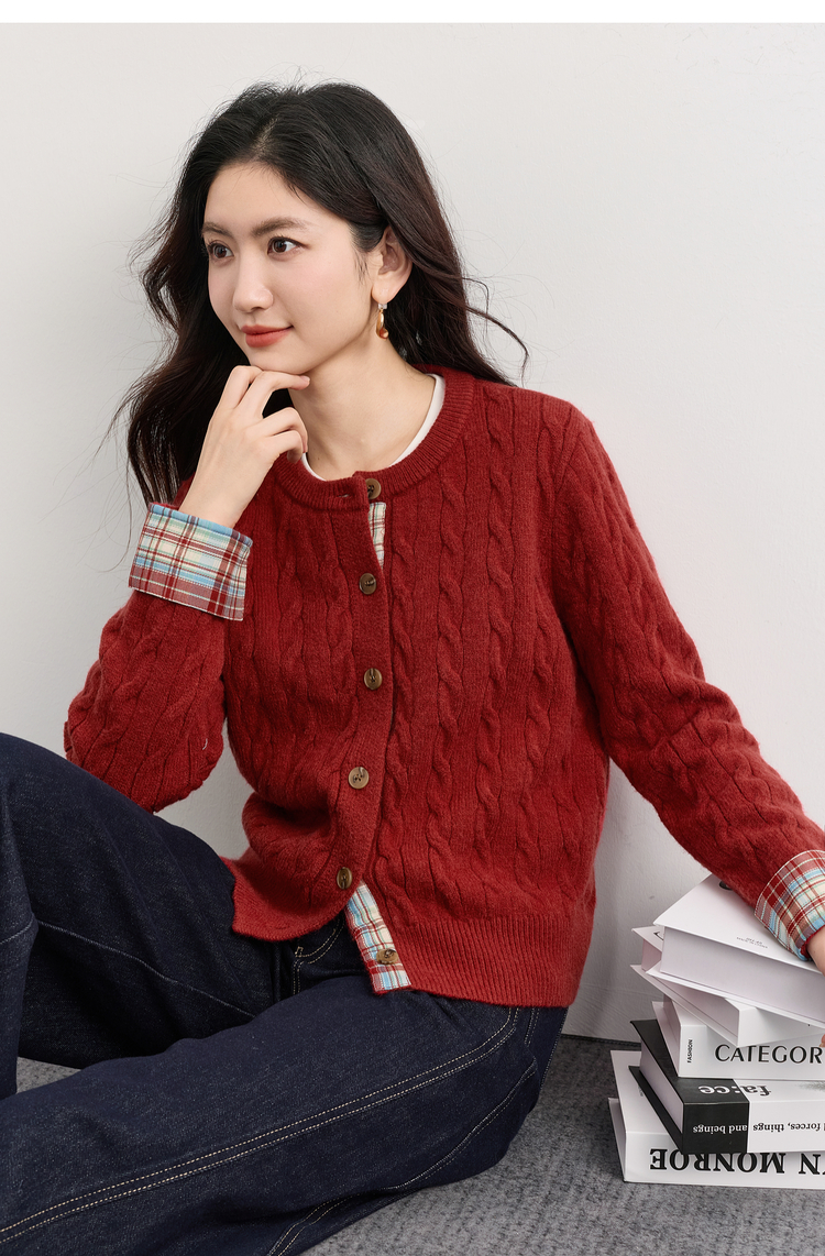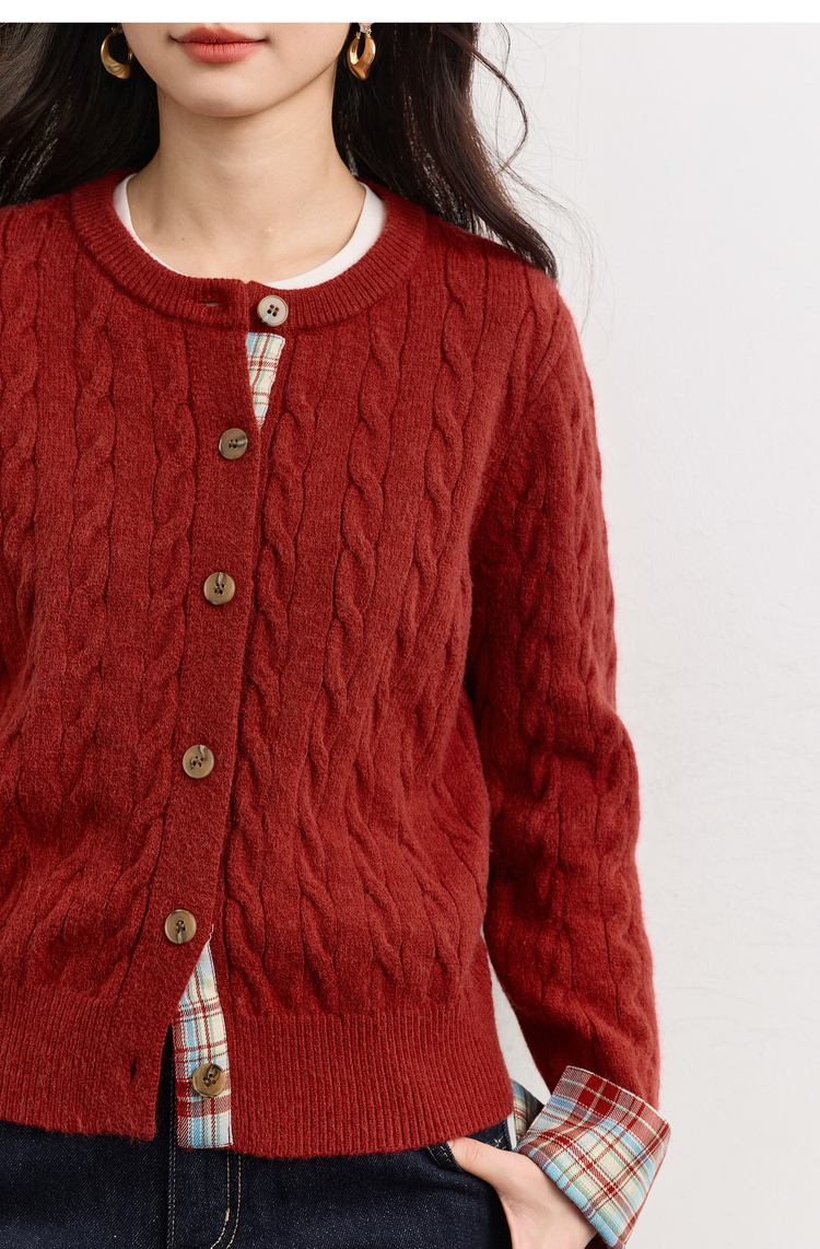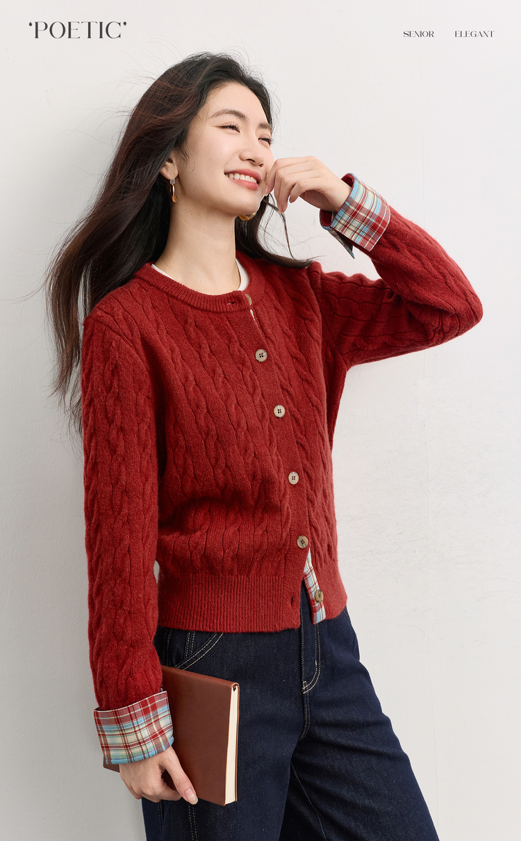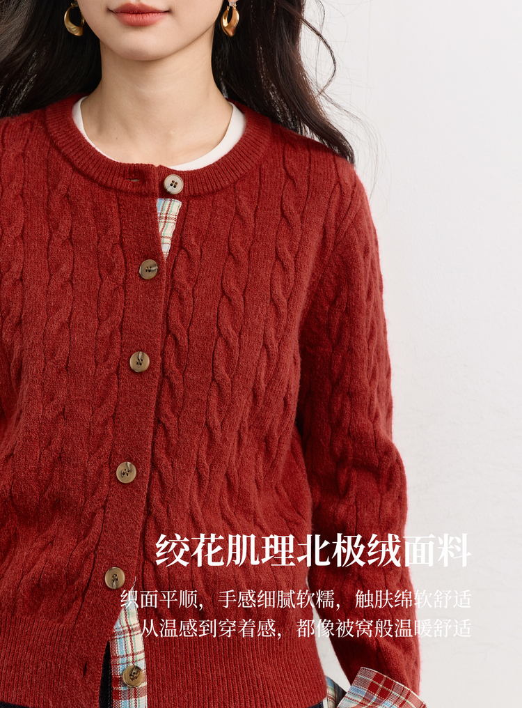 【周末秒杀】熙世界北极绒复古红色麻花毛衣短外套女秋冬格纹拼接长袖针织开衫