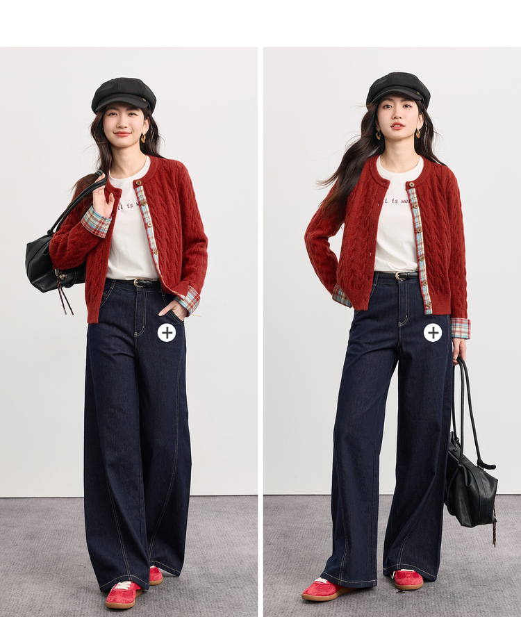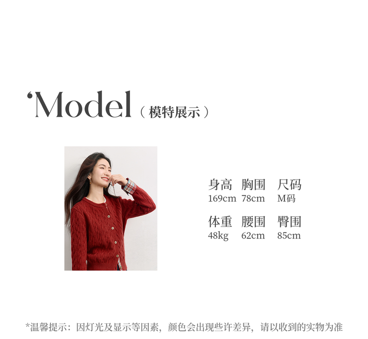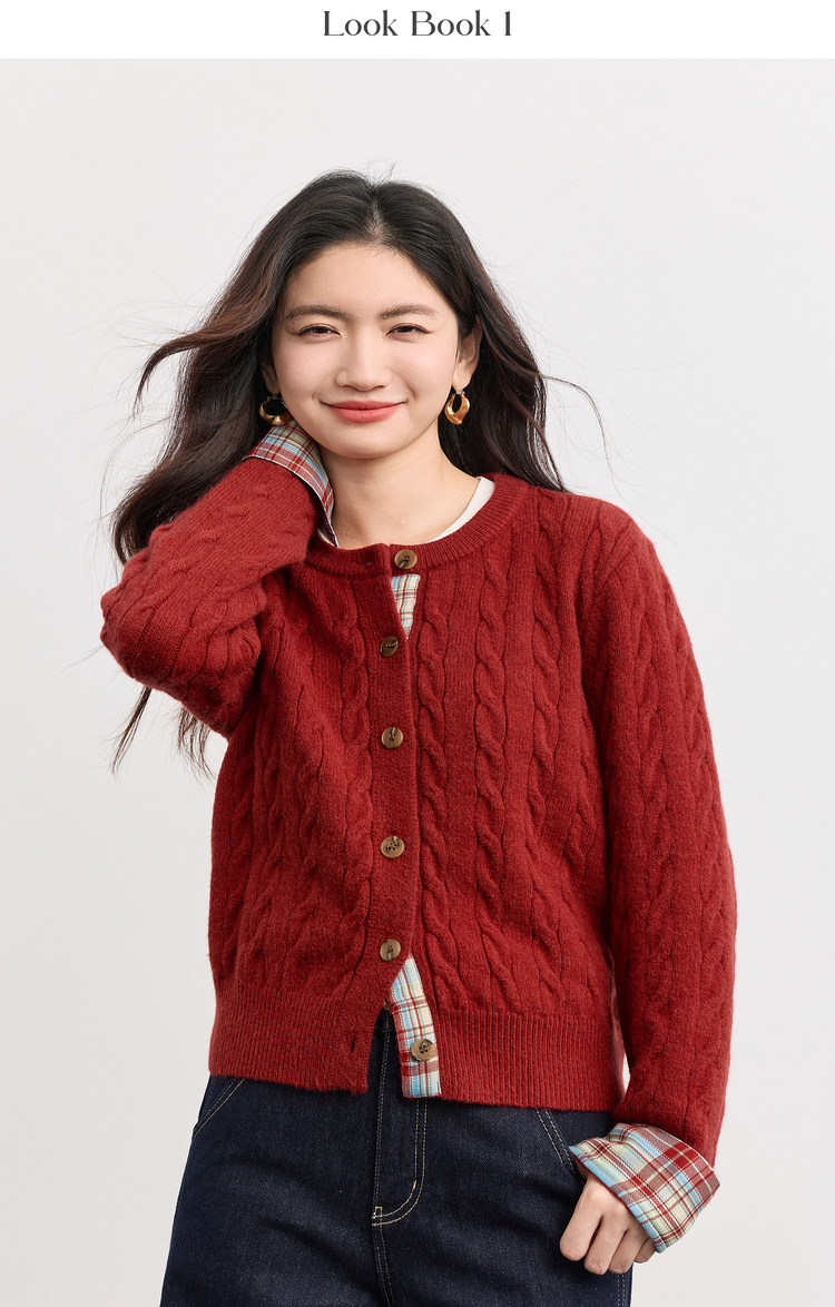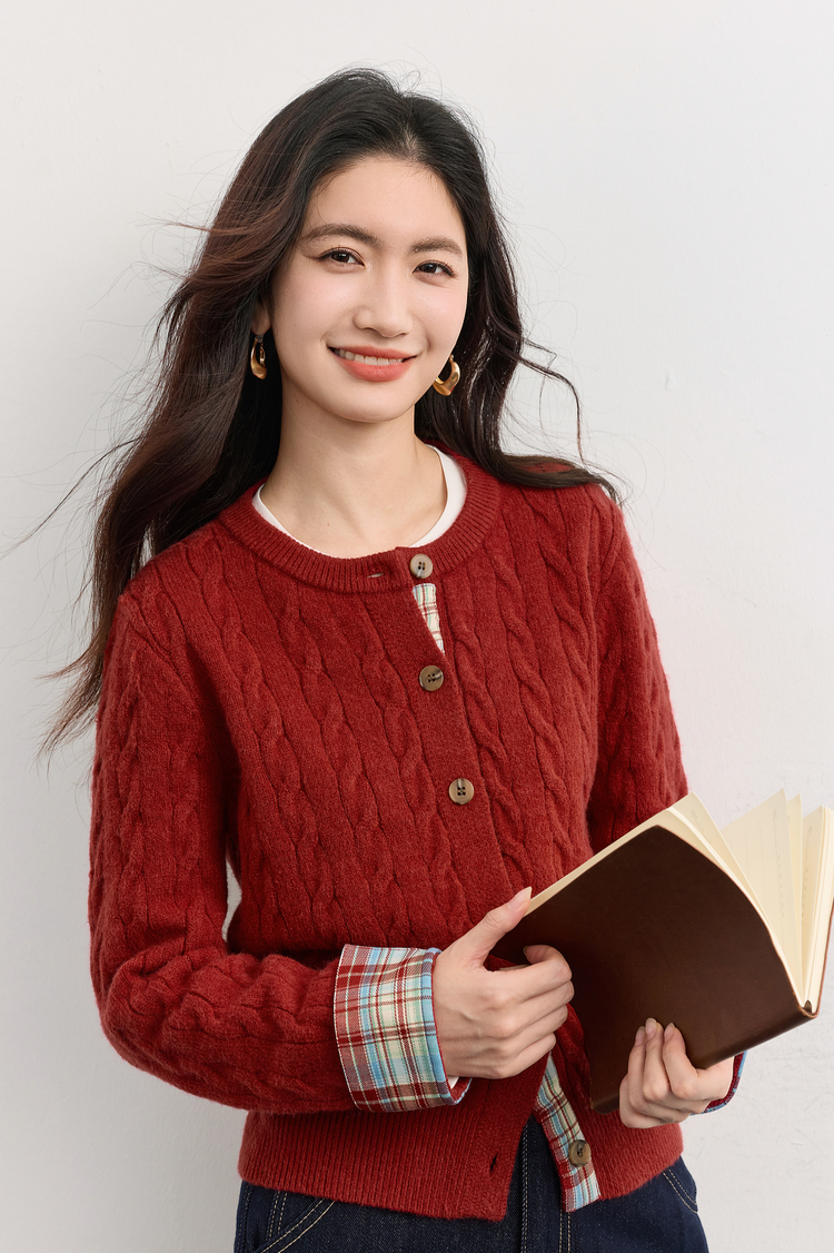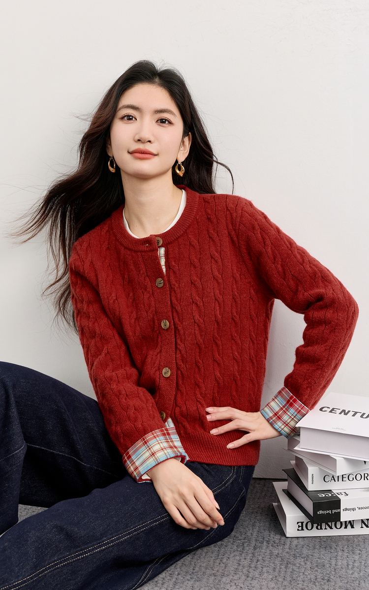 【周末秒杀】熙世界北极绒复古红色麻花毛衣短外套女秋冬格纹拼接长袖针织开衫