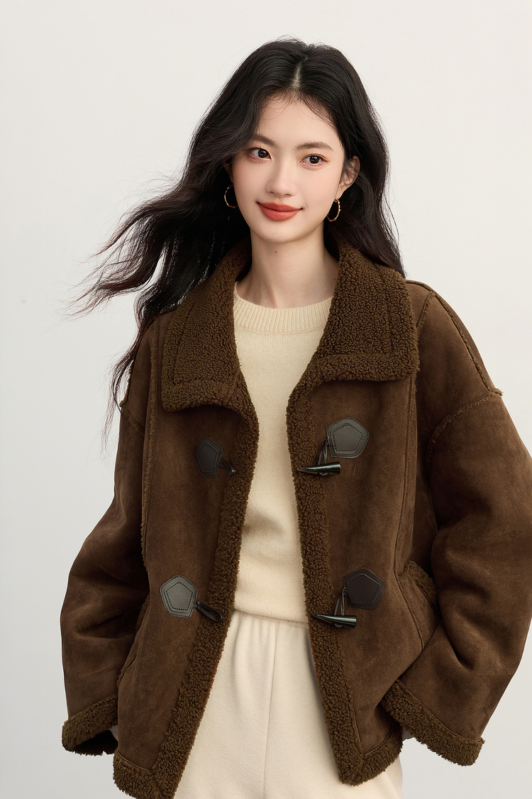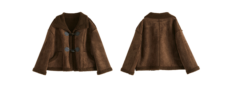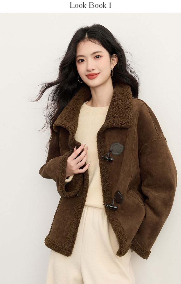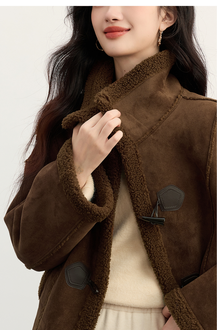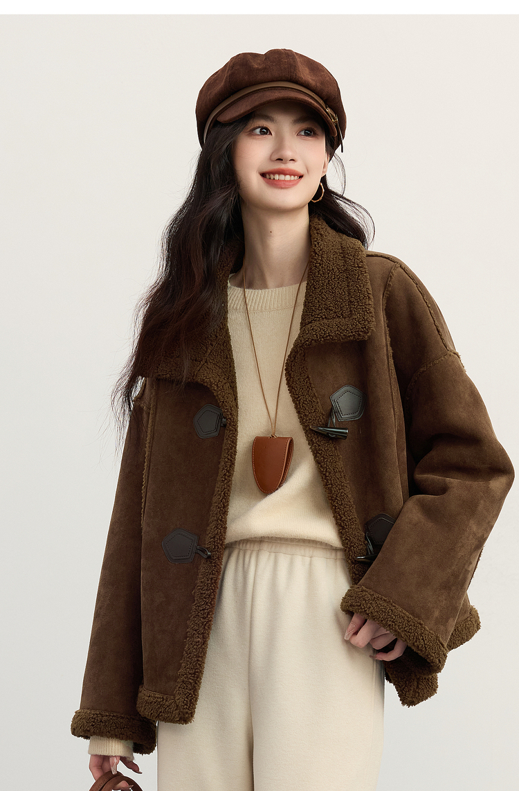 【11/26新品】熙世界仿麂皮绒皮毛一体短外套女2025冬季新款保暖牛角扣毛绒上衣