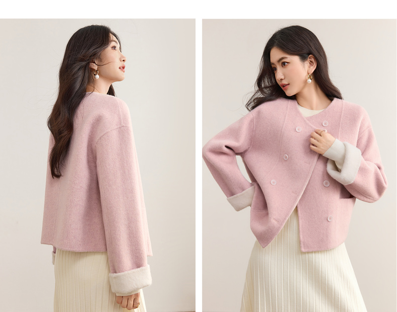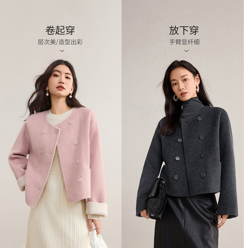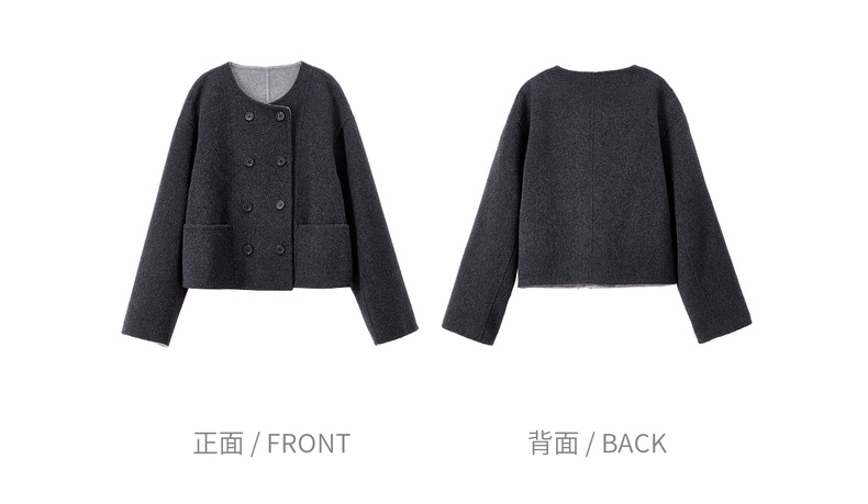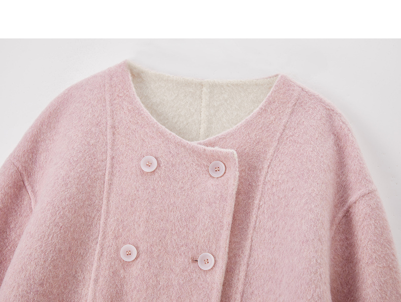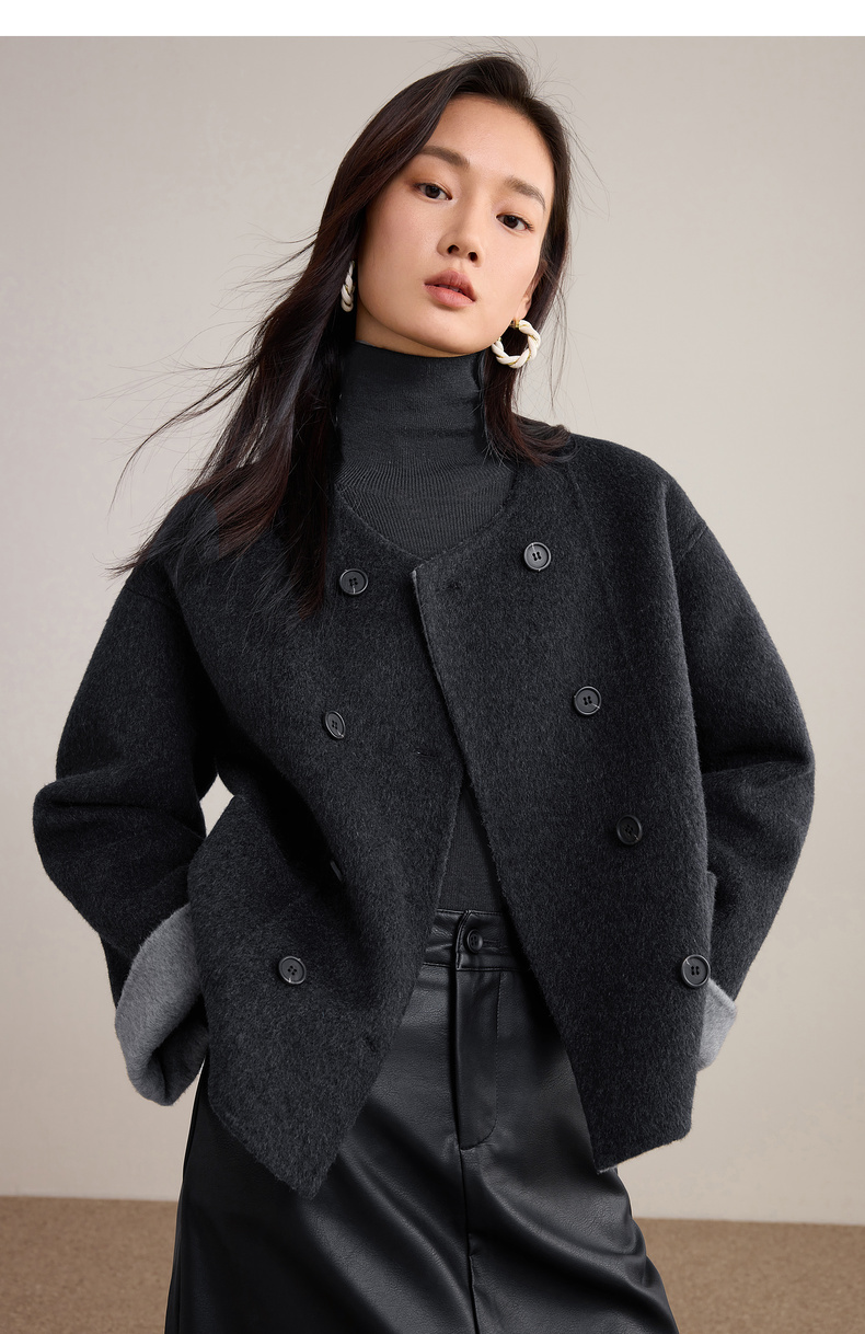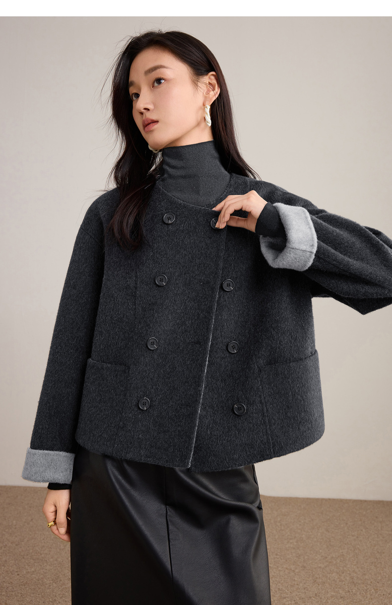 【内购】【两穿袖】圆领双排扣撞色设计宽松落肩袖保暖厚绵羊毛双面呢外套-W54OG2436
