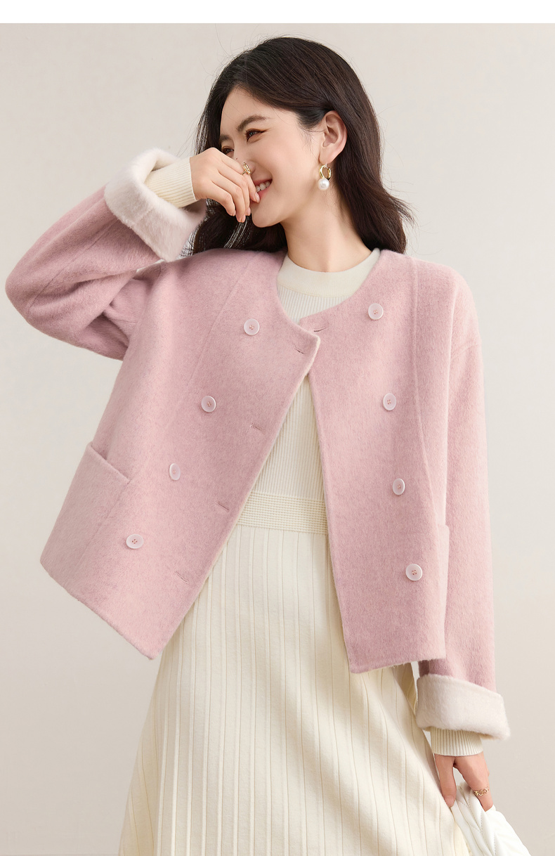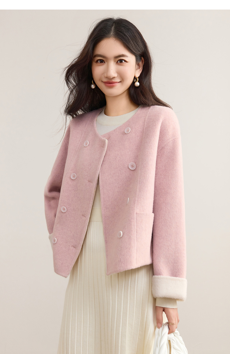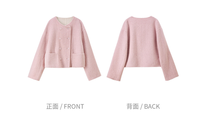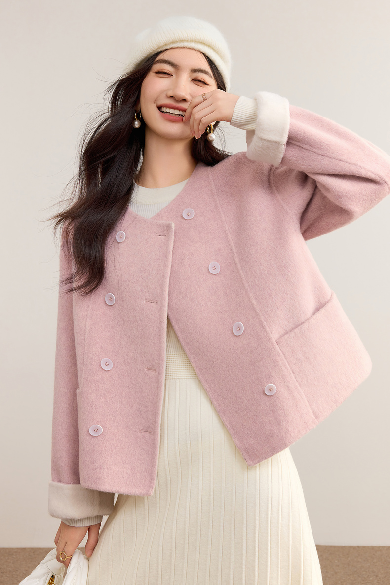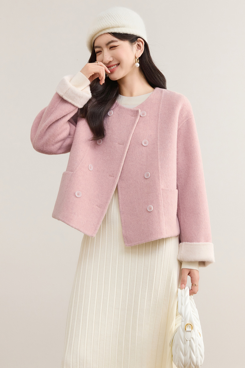 【内购】【两穿袖】圆领双排扣撞色设计宽松落肩袖保暖厚绵羊毛双面呢外套-W54OG2436