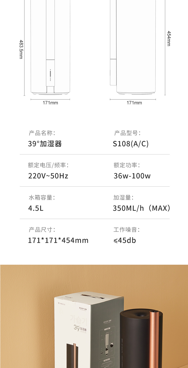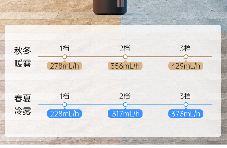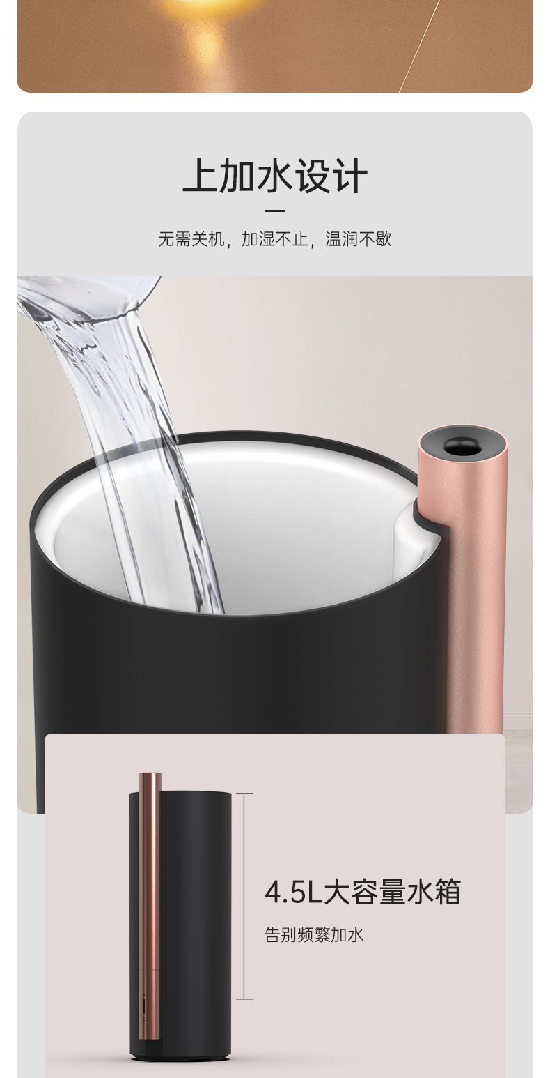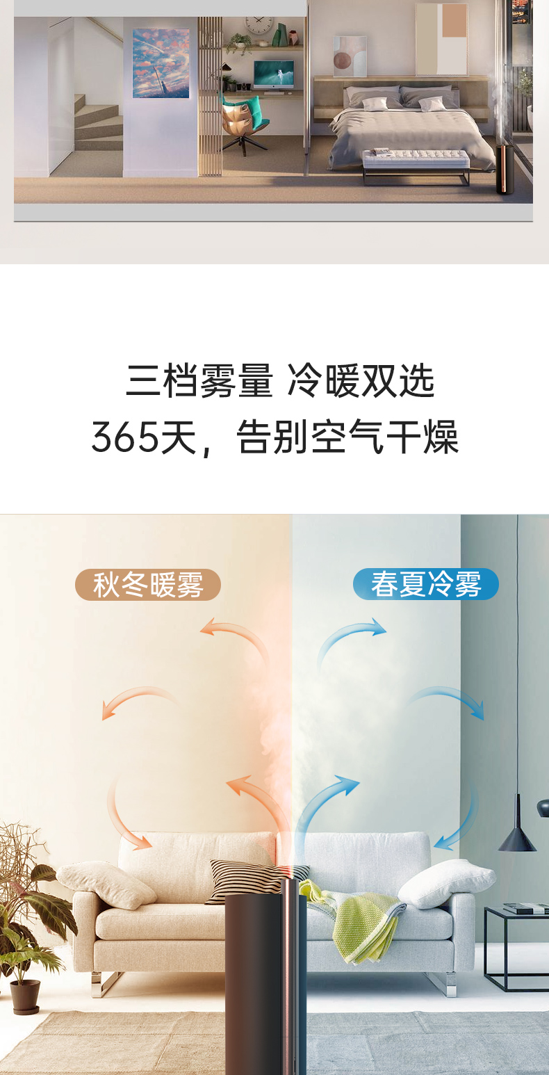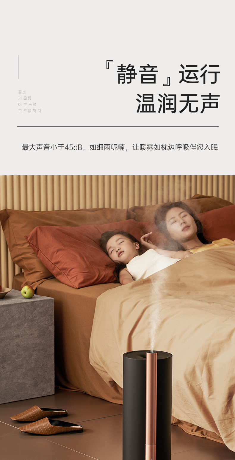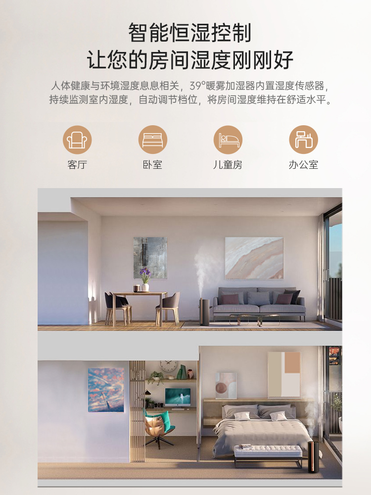 39°暖雾加湿器内置湿度传感器,维持室内湿度舒适水平;秋冬暖雾,春夏冷雾