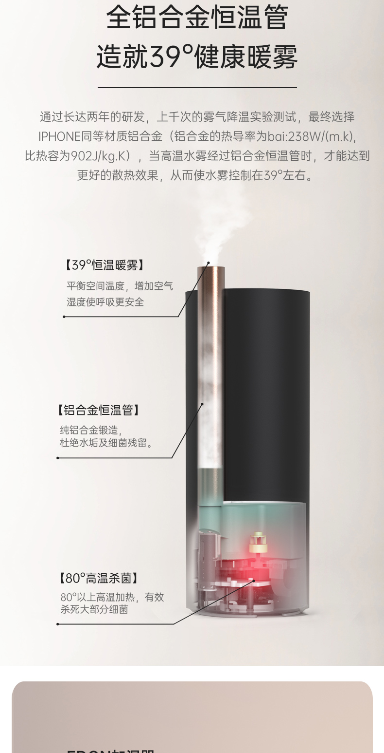 底部80°高温杀菌,侧边选用铝合金温管,加热散热,控制出水雾39°左右,平衡冬季室内温度