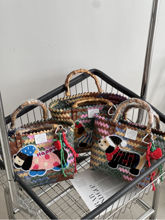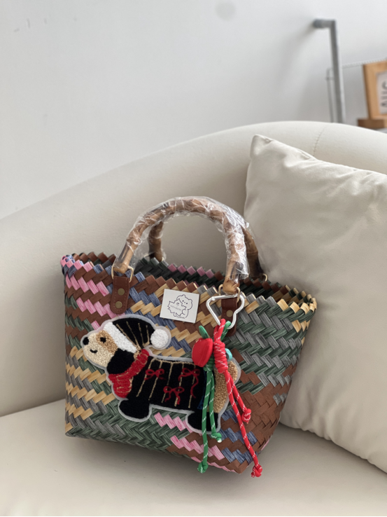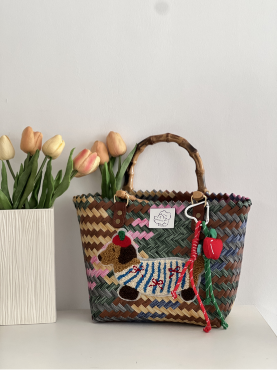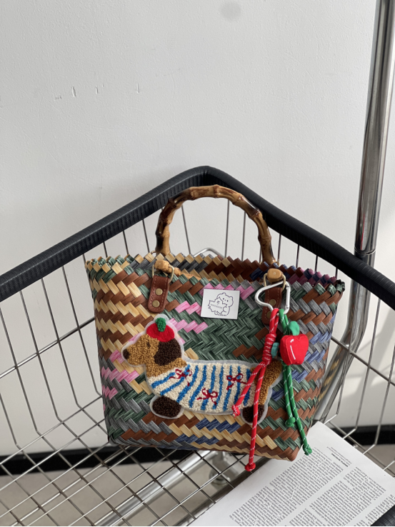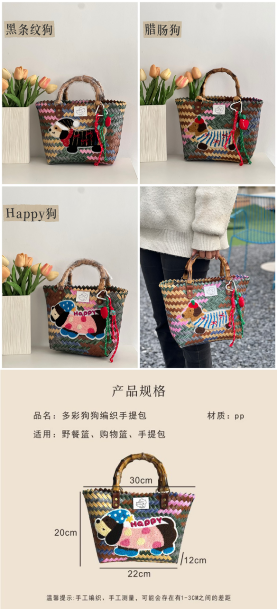 ✅环保PP仿藤材质 不说真猜不到是仿藤的 摸不出来区别,手感和藤条一模一样 但是又避免藤条采摘,更环保,更耐用 拿到手物便知它绝对超所值 每一个包包都是全手工编织! 包面有竹节把手柄、卡通狗狗,赠送苹果挂饰 一摸就知道是超级好质感 入夏必备,耐撞耐磨,挤压也不变形! 🤩多巴胺配色靓丽 又小清新可爱 出门被疯狅要链接 几十块钱带来一整年的快乐