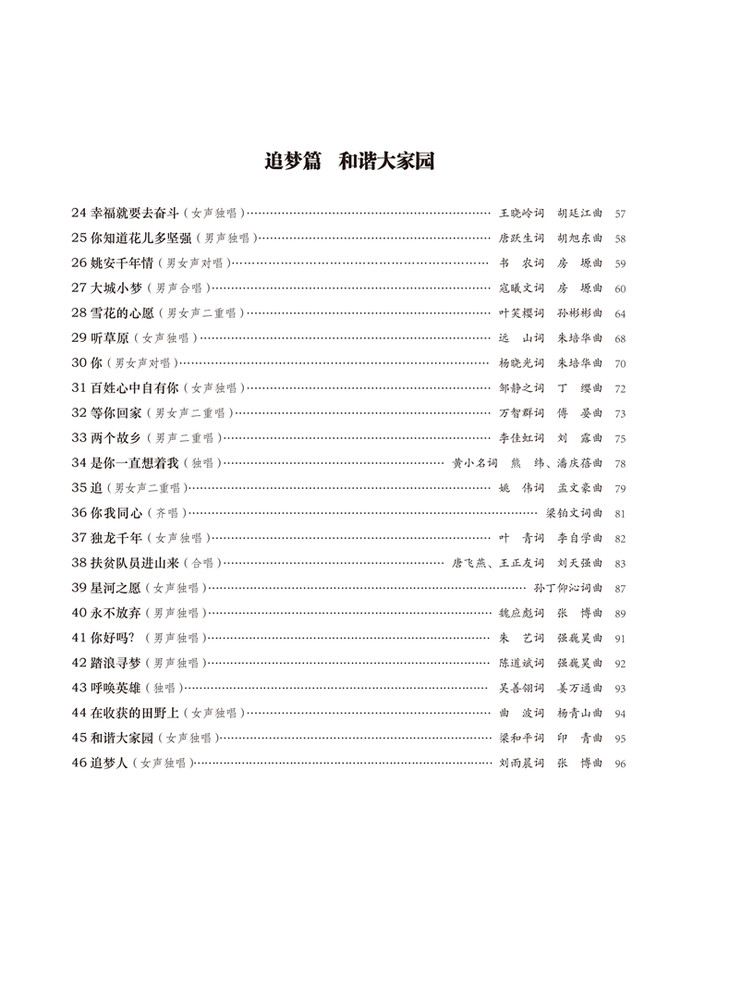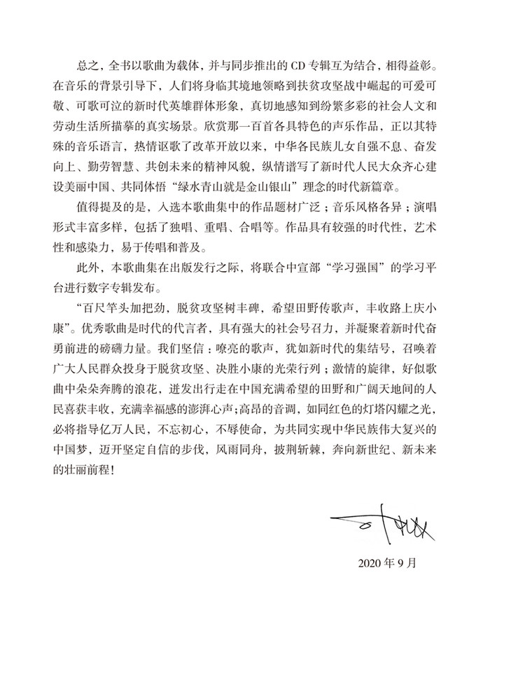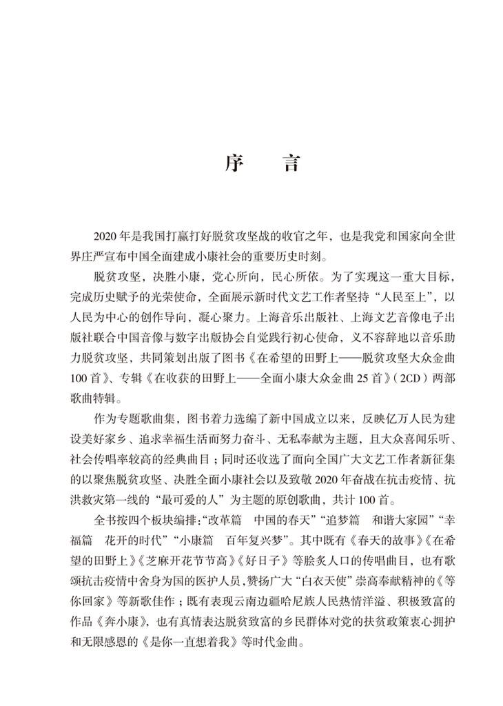 为深入学习贯彻习近平新时代中国特色社会主义思想和党的十九大精神,展示新时代文艺工作者坚持以人民为中心的创作导向,上海音乐出版社联合中国音像与数字出版协会,自觉践行初心使命,共同组织编选《在希望的田野上——脱贫攻坚大众金曲100首》专题歌曲集(附二维码音频)。书中不仅收录了大众喜闻乐见、流传广泛的40首经典歌曲,还收录了“以音乐助力脱贫攻坚决战胜利,用歌声赞颂全面建成小康社会”为主题的新征歌曲60首,这些歌曲随书附赠二维码音频供读者欣赏。本书选编的歌曲多以人民群众为建设家乡、追求幸福生活付出努力为题,富有浓郁的民间风格和民族特色,展现了人民群众在热情的土地上播种希望、在党的领导下脱贫致富的坚定信念。本书已入选中宣部2020年主题出版重点出版物,同时,上海音乐出版社在“学习强国”学习平台同步推出了与本书相关的《在希望的田野上奋斗 在收获的田野上歌唱》数字歌曲专辑。