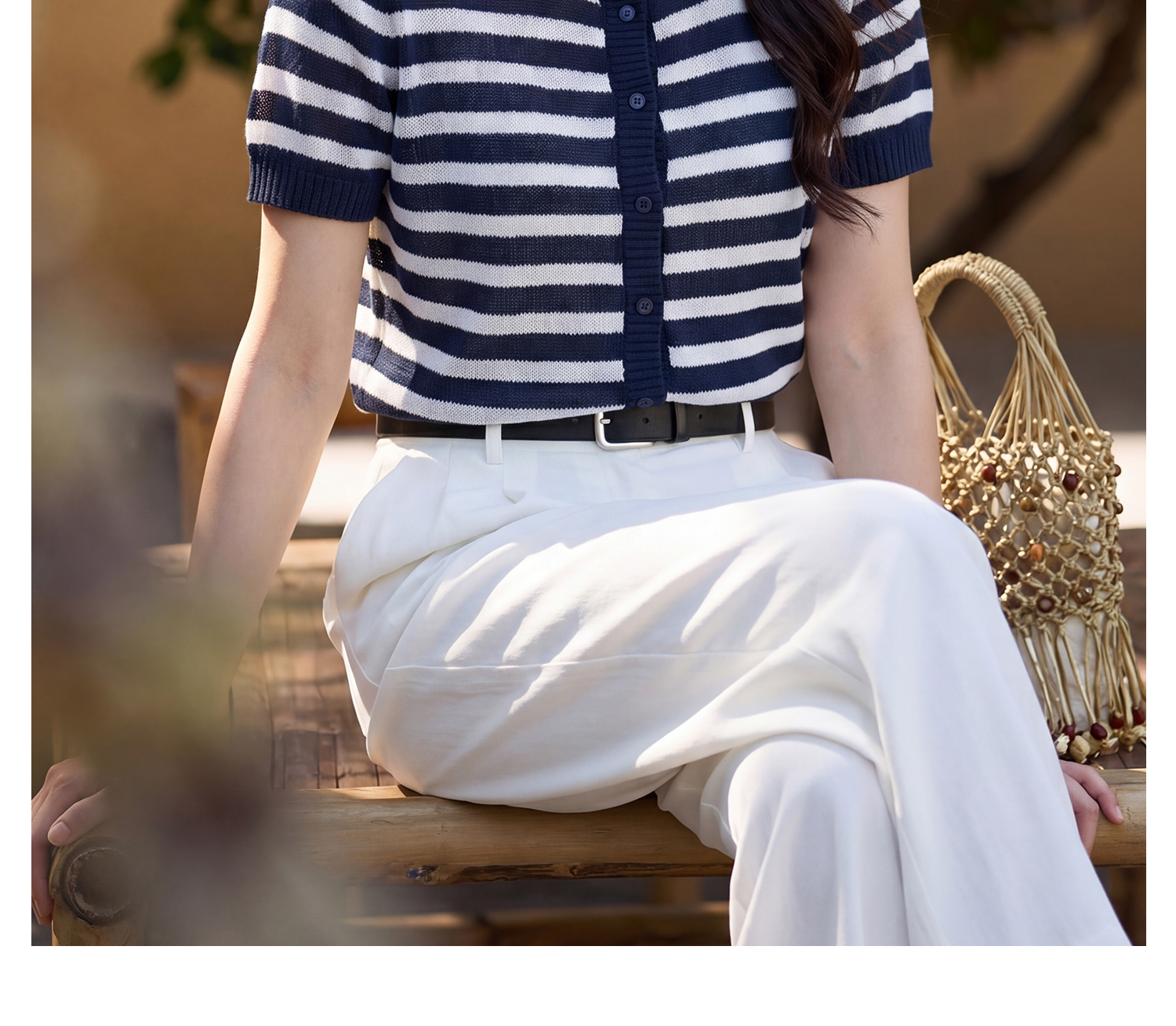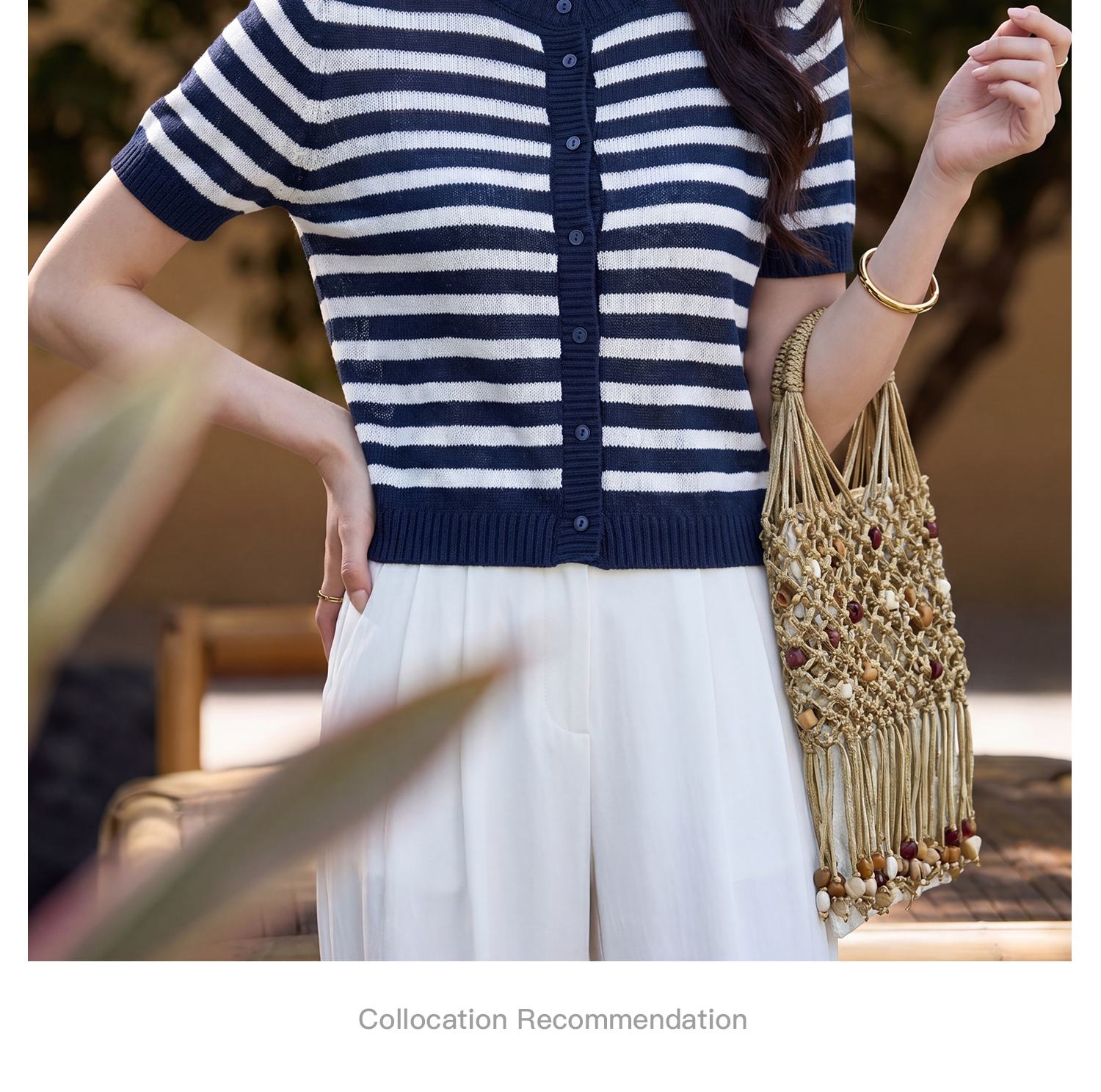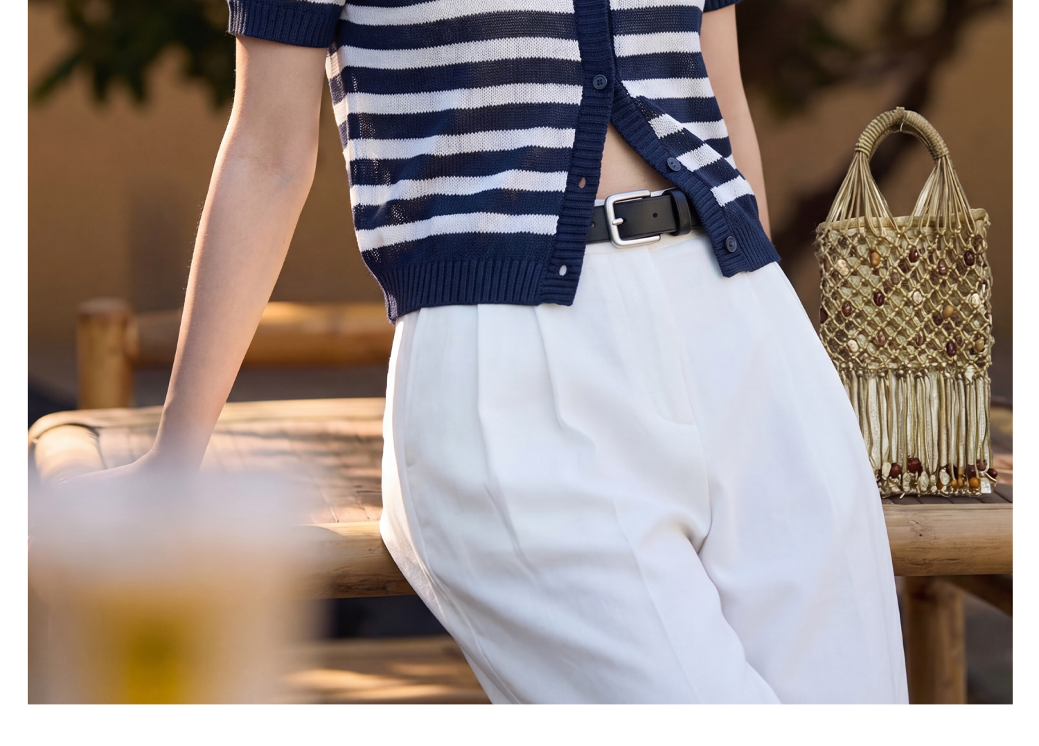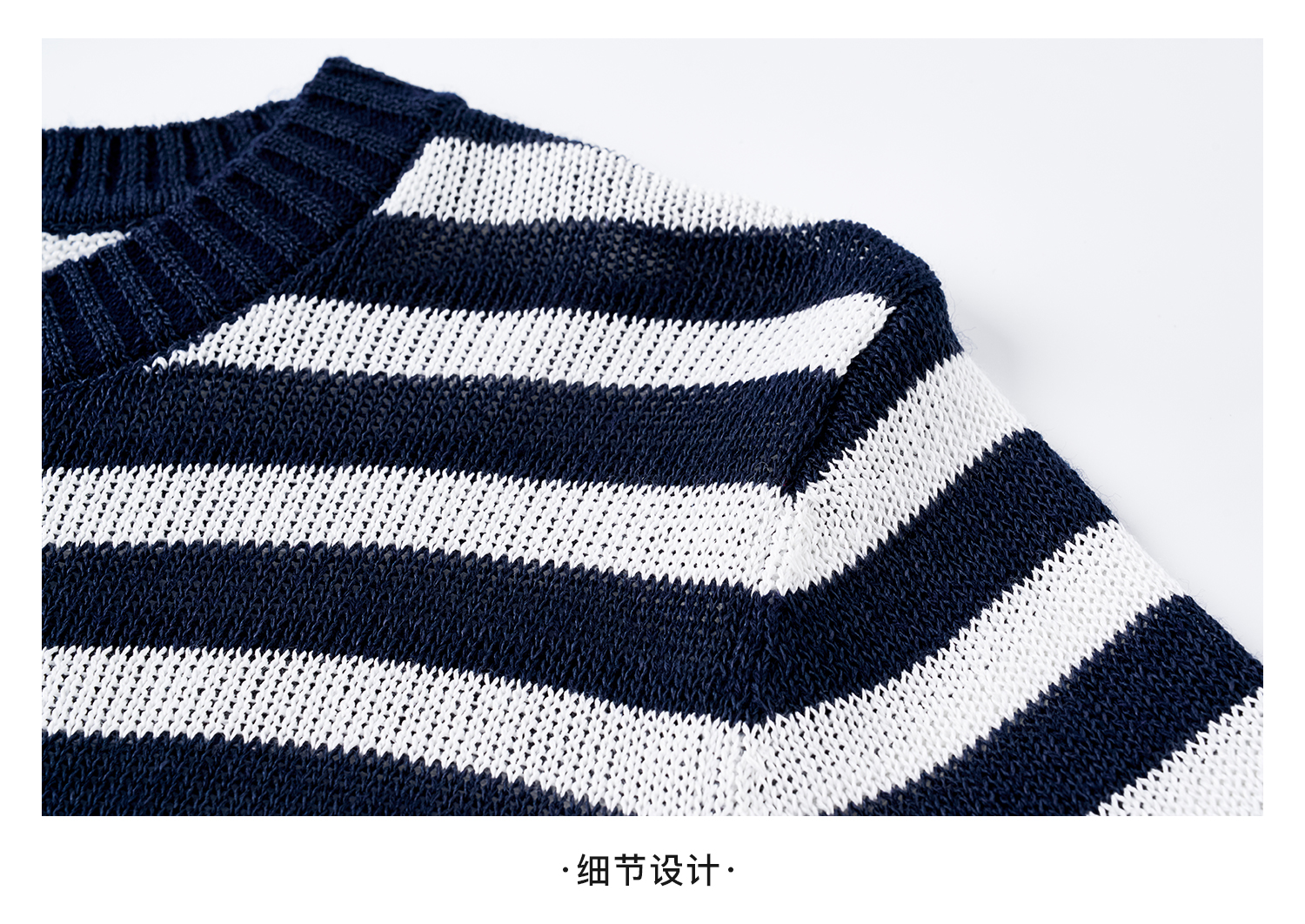 航海蓝条纹针织T 复古撞色 米思阳2026夏季复古风条纹含羊毛短袖针织开衫上衣1310