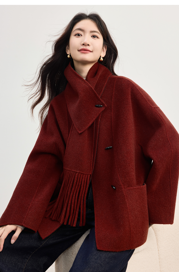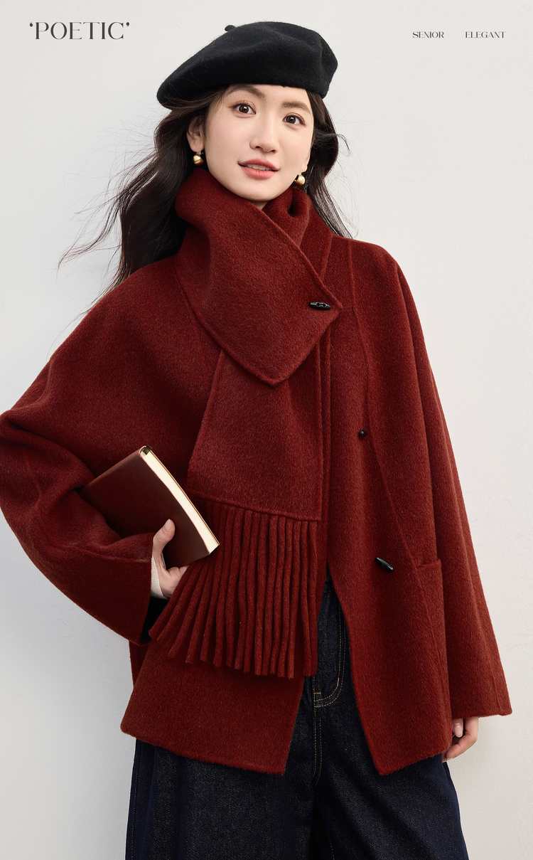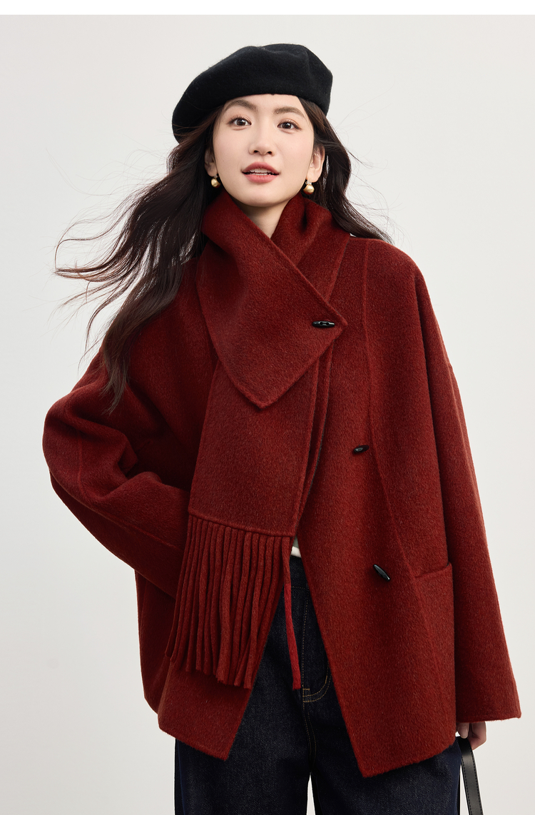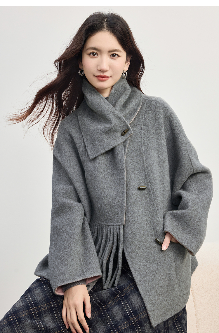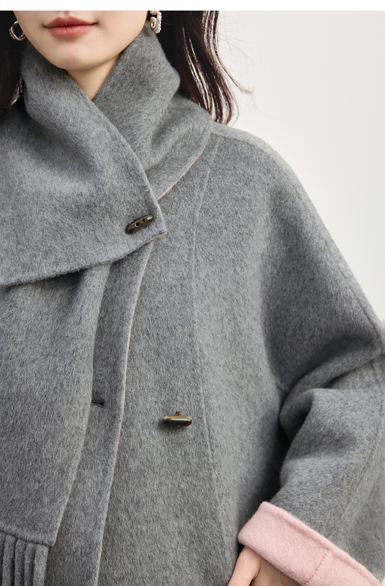 【10/15新品】熙世界两穿配围巾全羊毛双面呢大衣女秋冬设计感牛角扣毛呢短外套