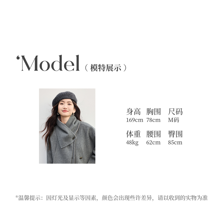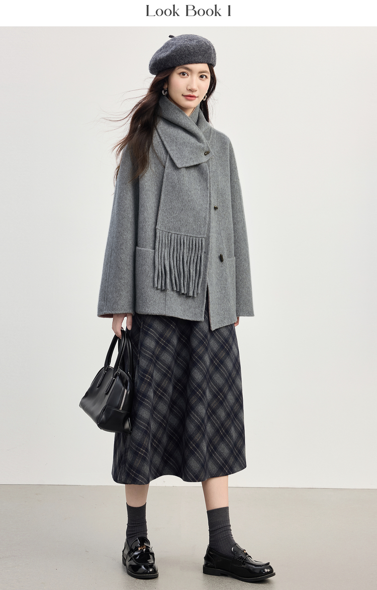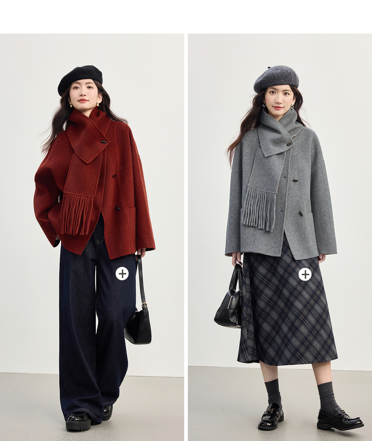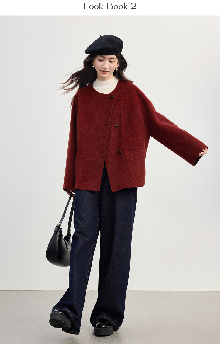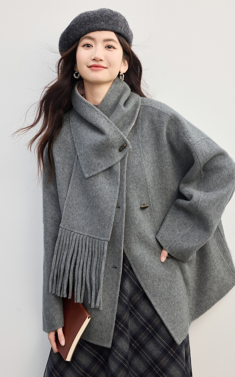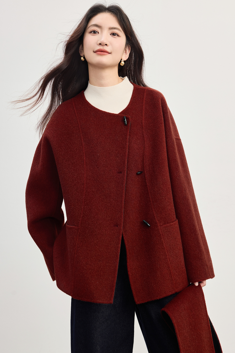 【10/15新品】熙世界两穿配围巾全羊毛双面呢大衣女秋冬设计感牛角扣毛呢短外套