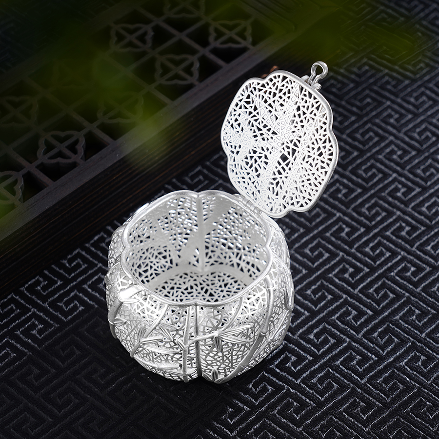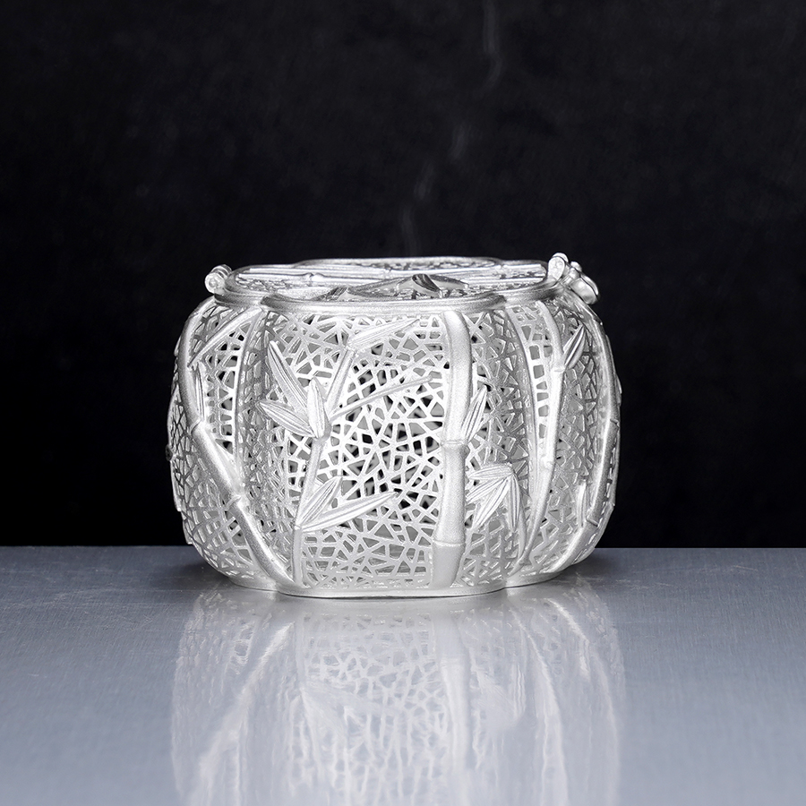 【寓意】:茶包灵感源自竹叶,采用银花丝工艺编织,开合设计暗藏巧思,风格清雅,趣味独特。足银材质,泡/煮高温下释放银离子,消毒杀菌、养生保健。