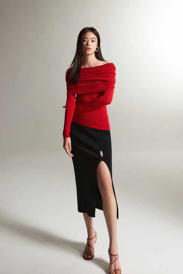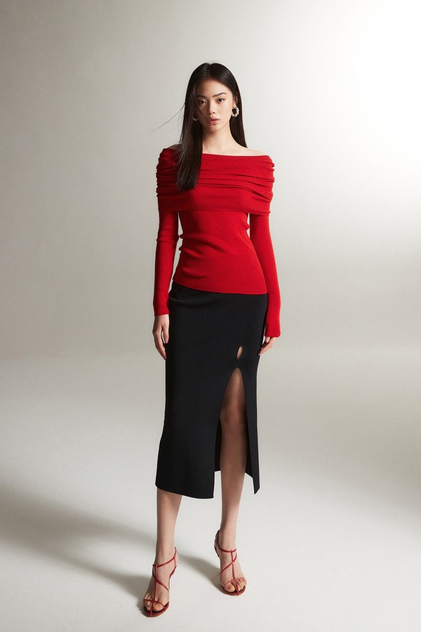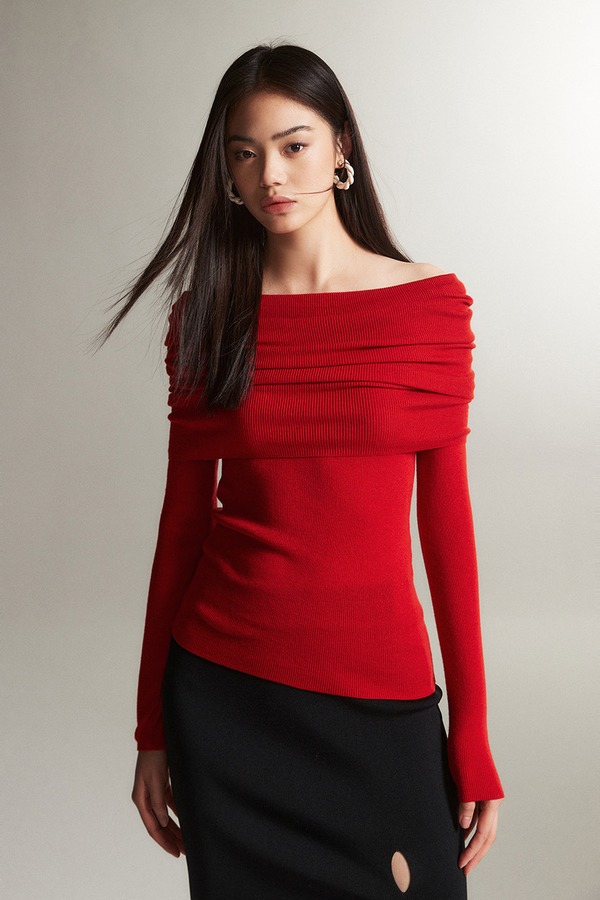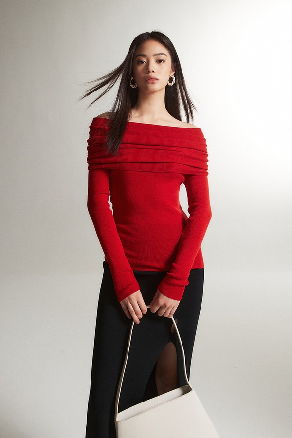 ELLA JADE 高级感红色一字肩针织上衣 21452
