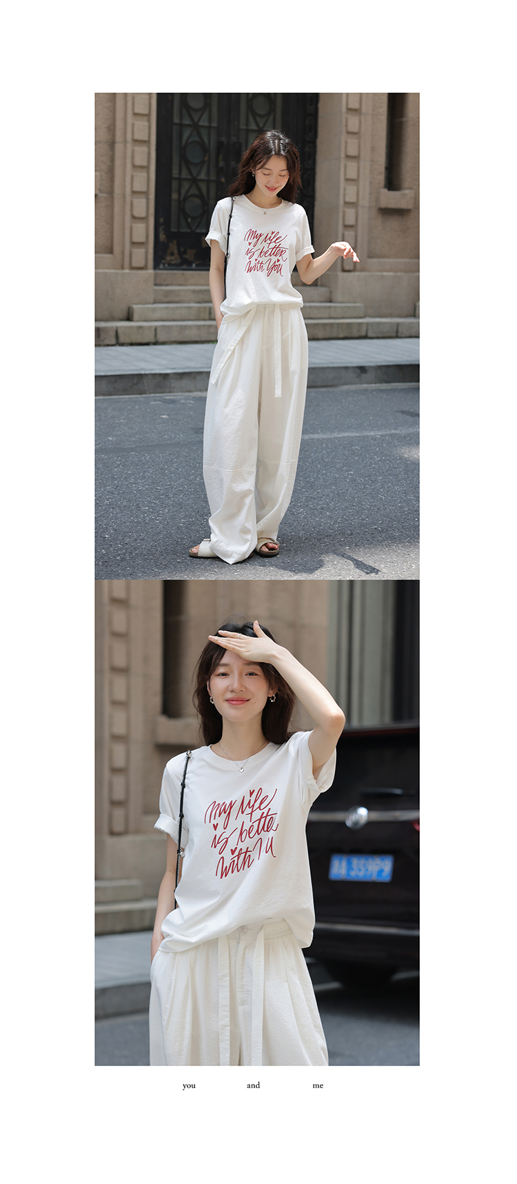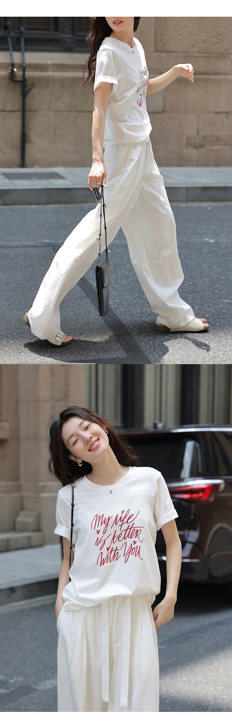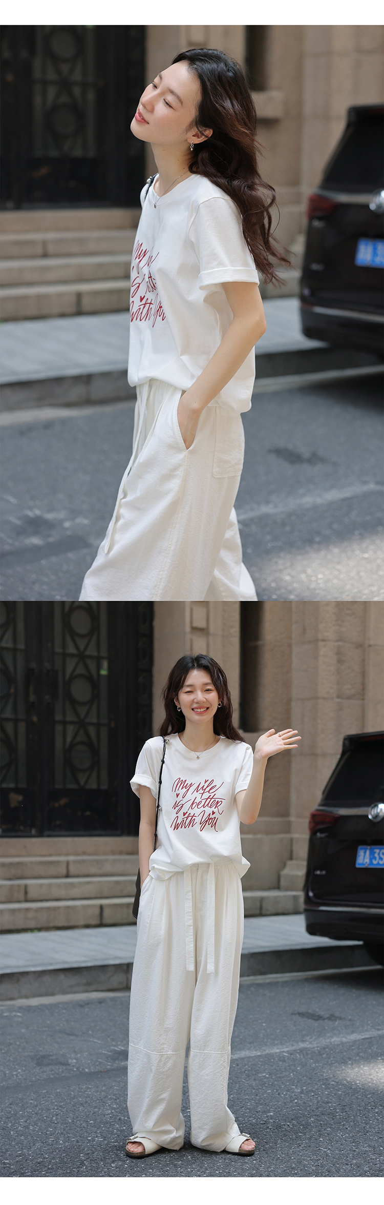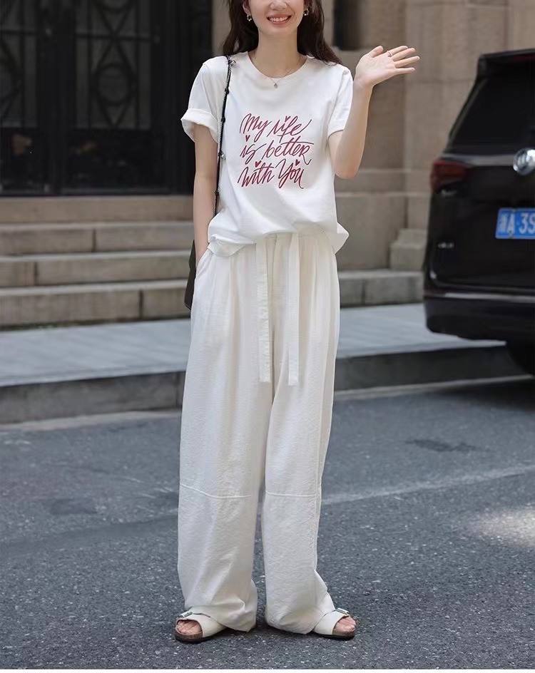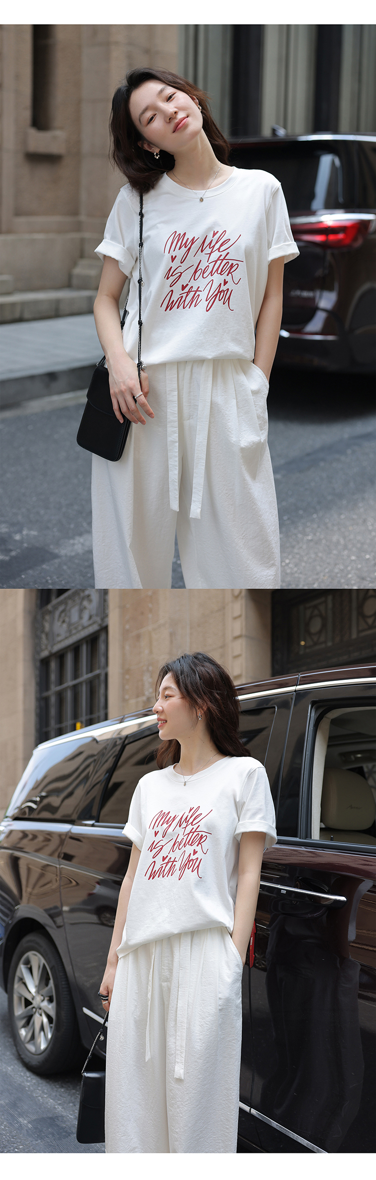 【休闲百搭 舒适面料】红色字母印花短袖T恤/薄款垂感阔腿裤 夏季女款短袖休闲显瘦上衣 松紧高腰显瘦裤子夏季必备阔腿长裤