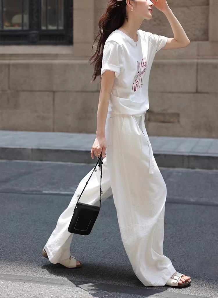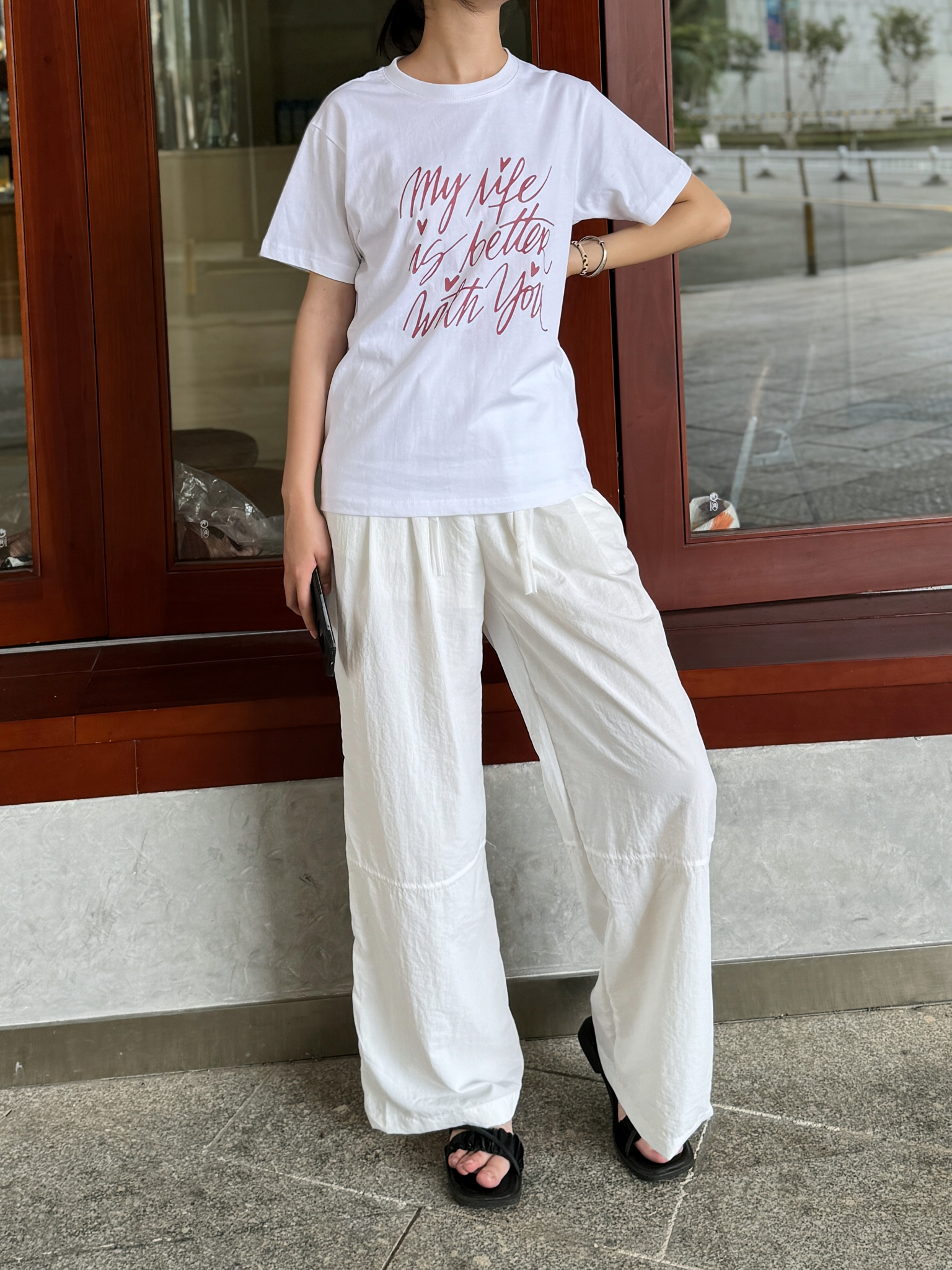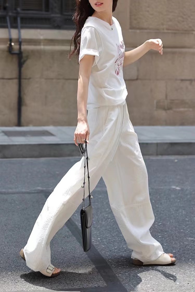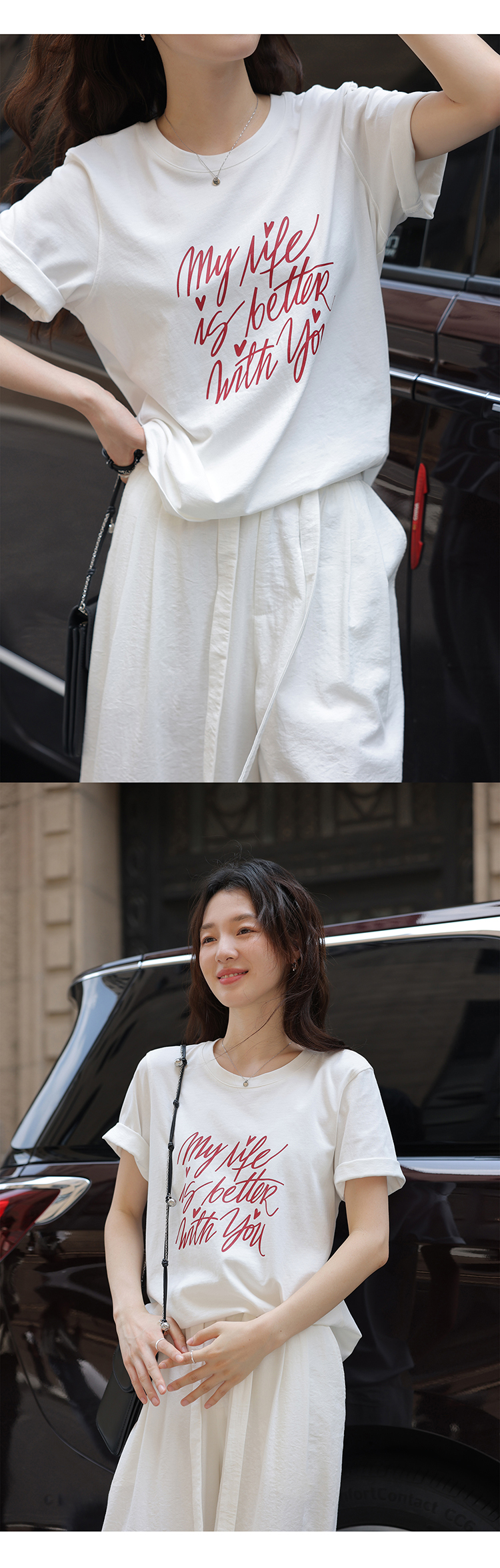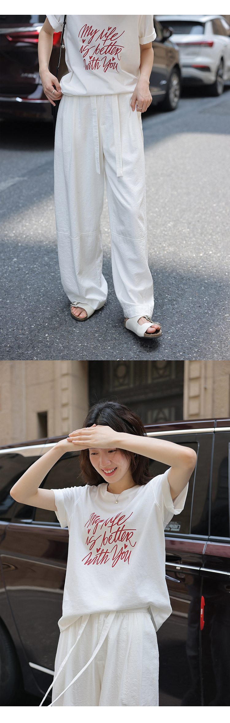 【休闲百搭 舒适面料】红色字母印花短袖T恤/薄款垂感阔腿裤 夏季女款短袖休闲显瘦上衣 松紧高腰显瘦裤子夏季必备阔腿长裤