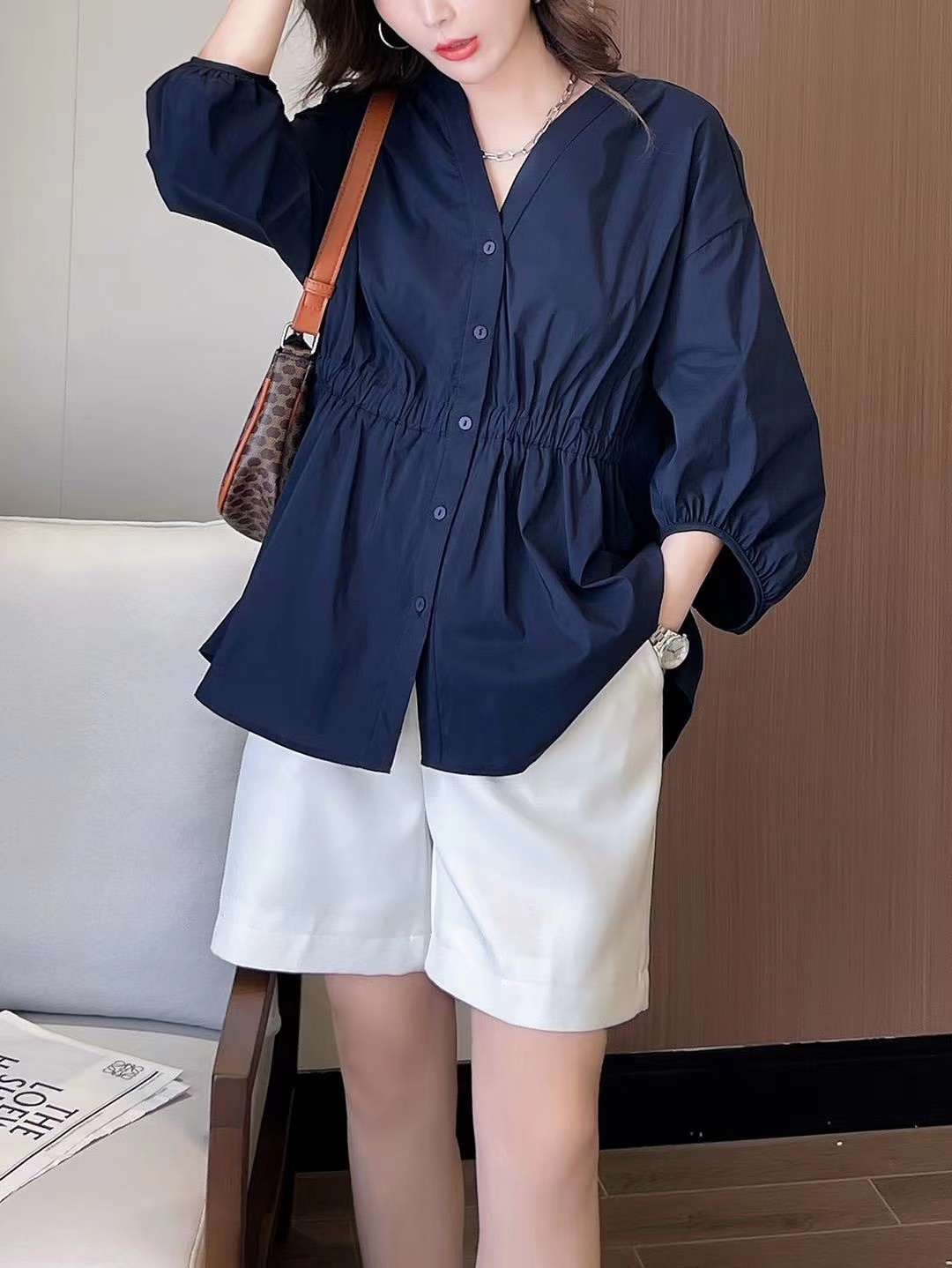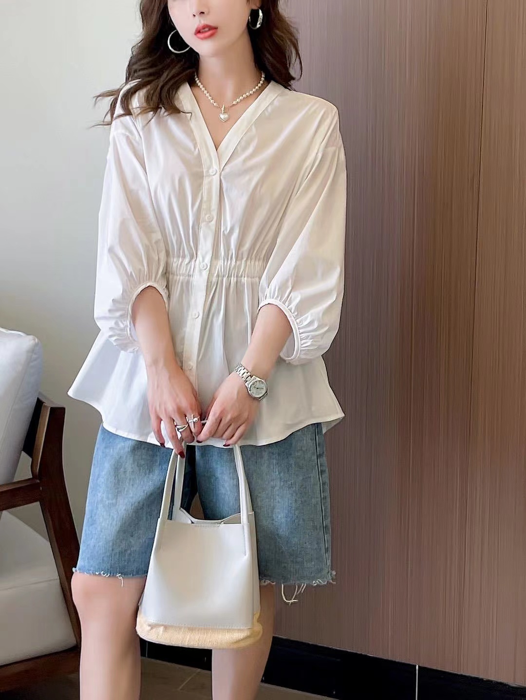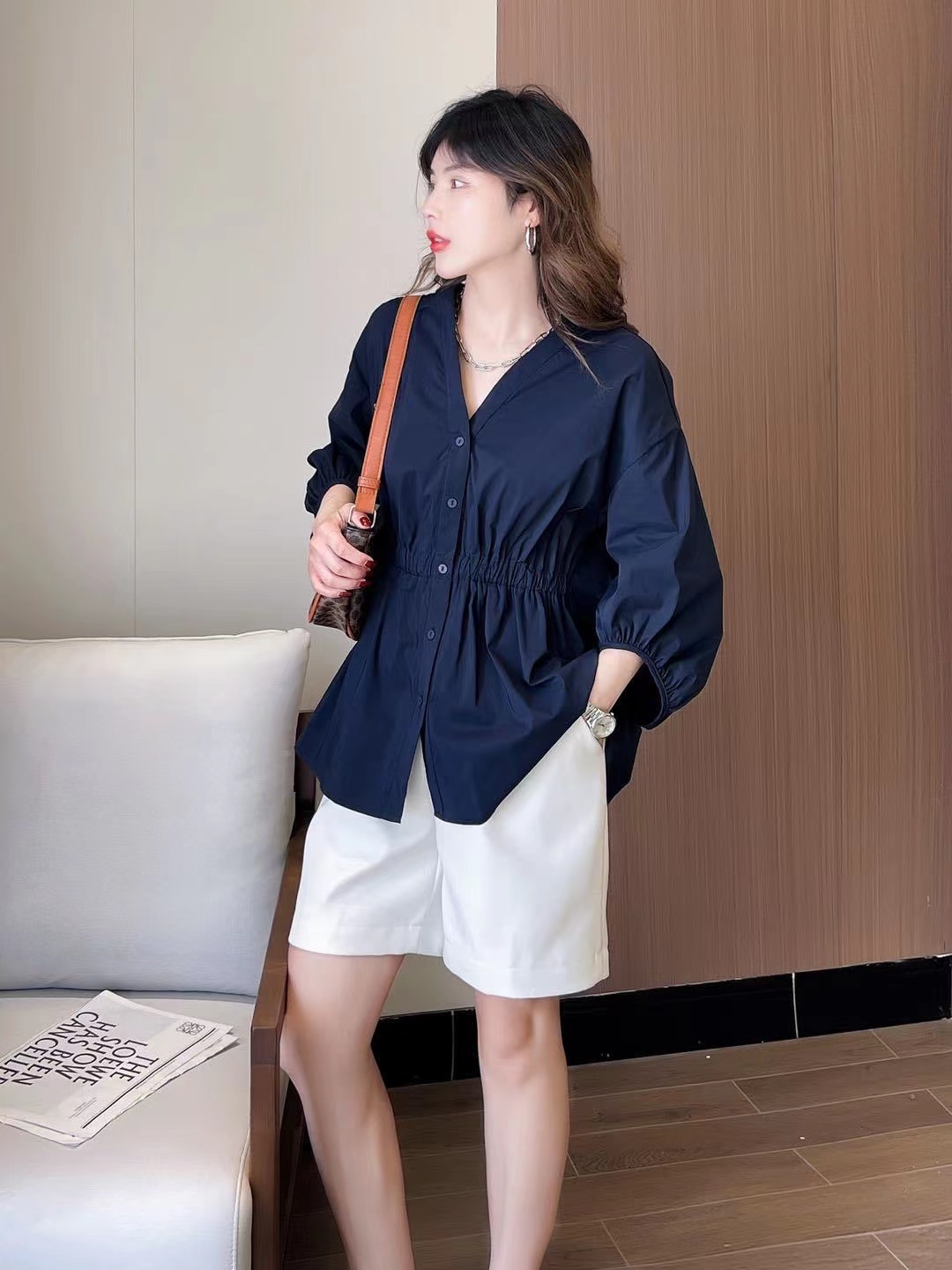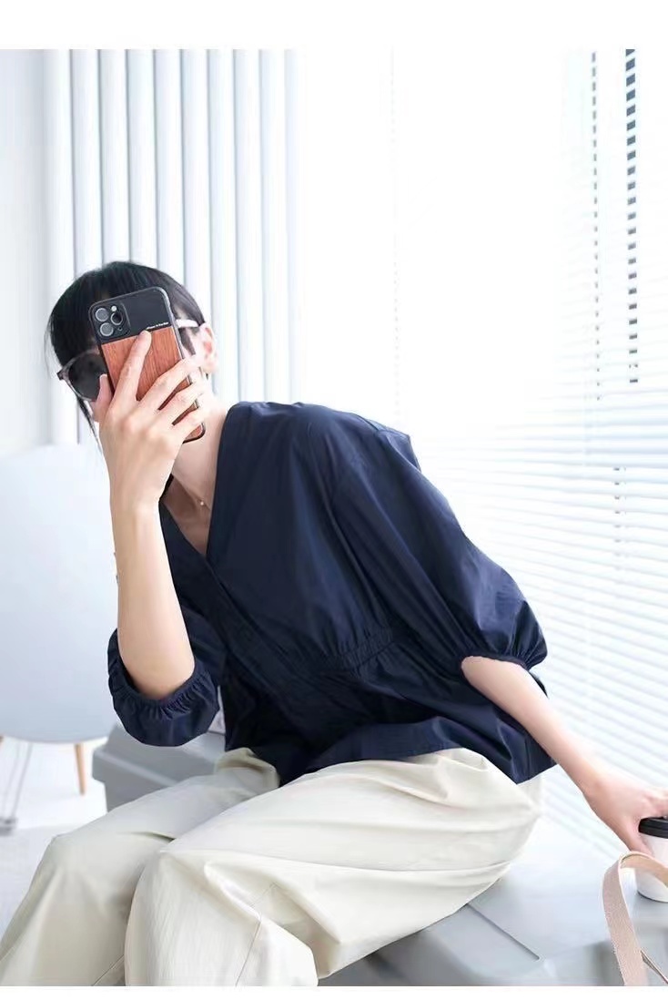 V领灯笼袖娃娃衫减龄纯色显瘦设计感衬衫上衣