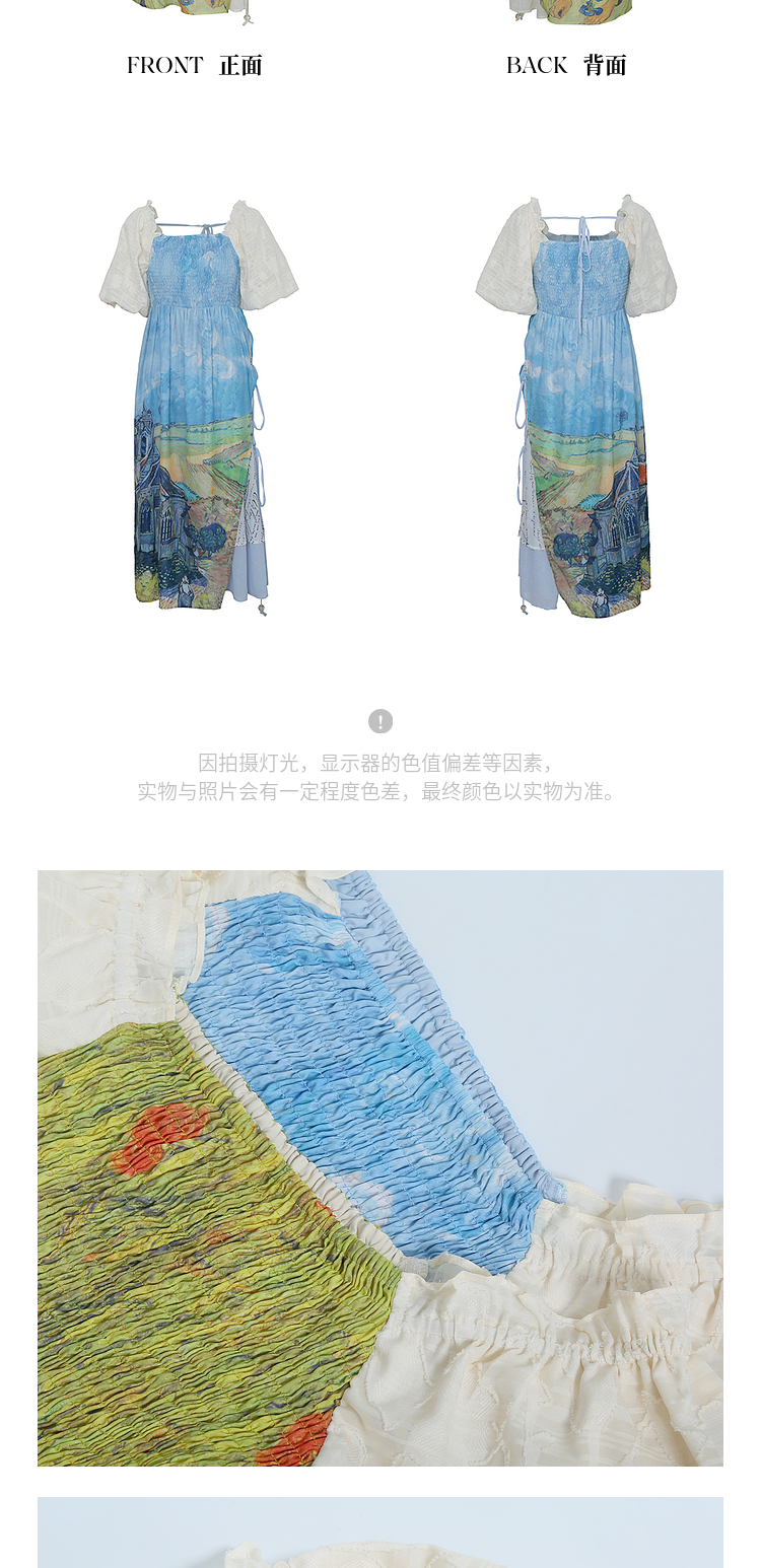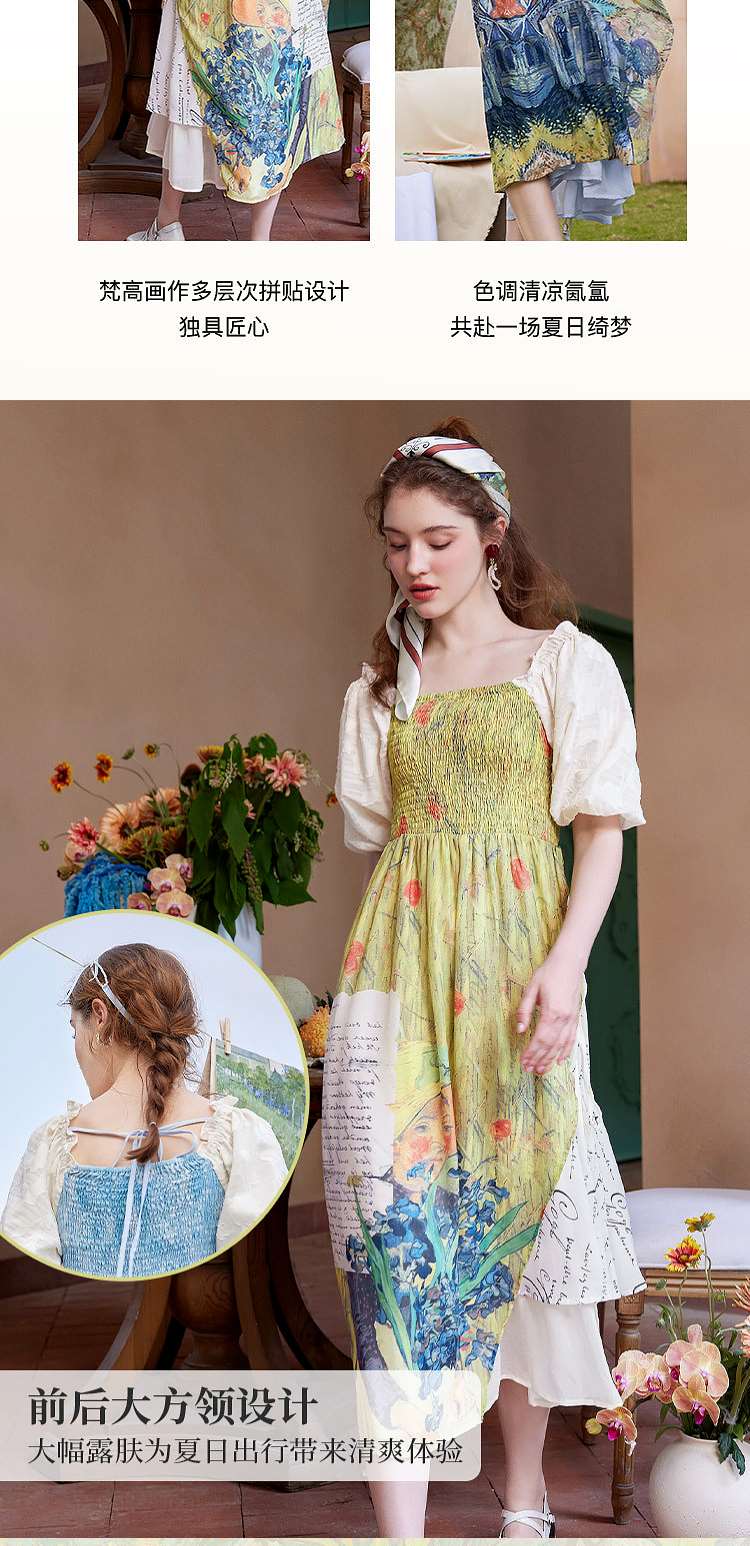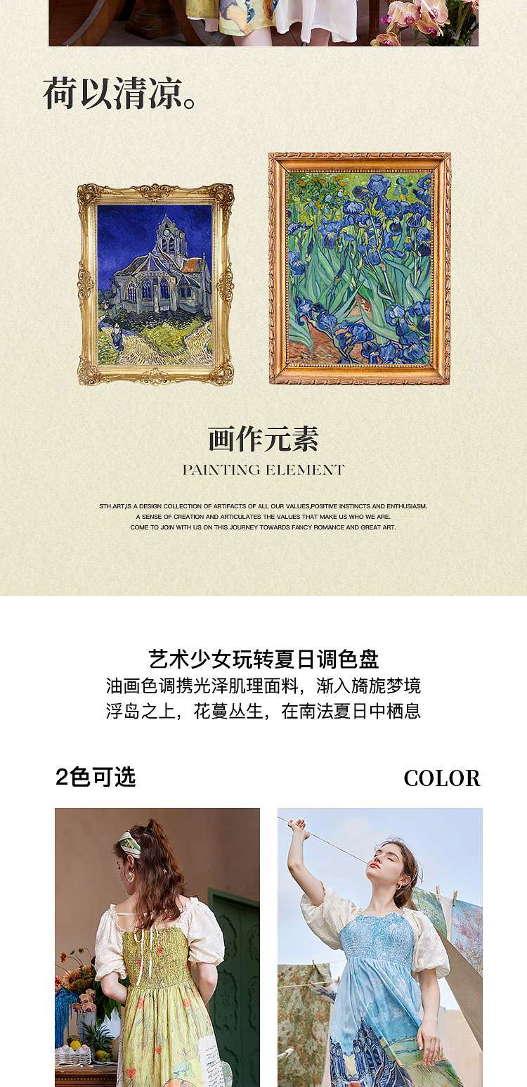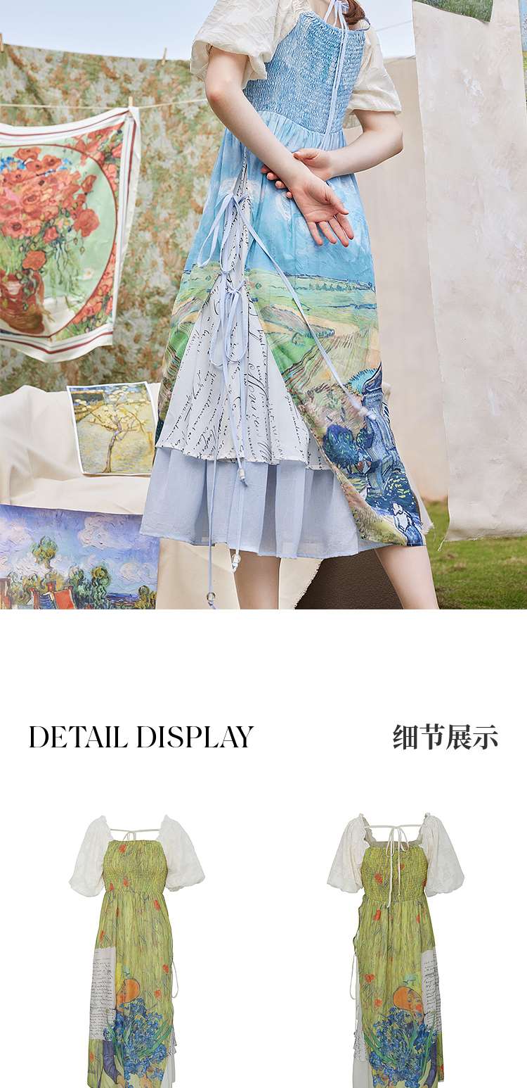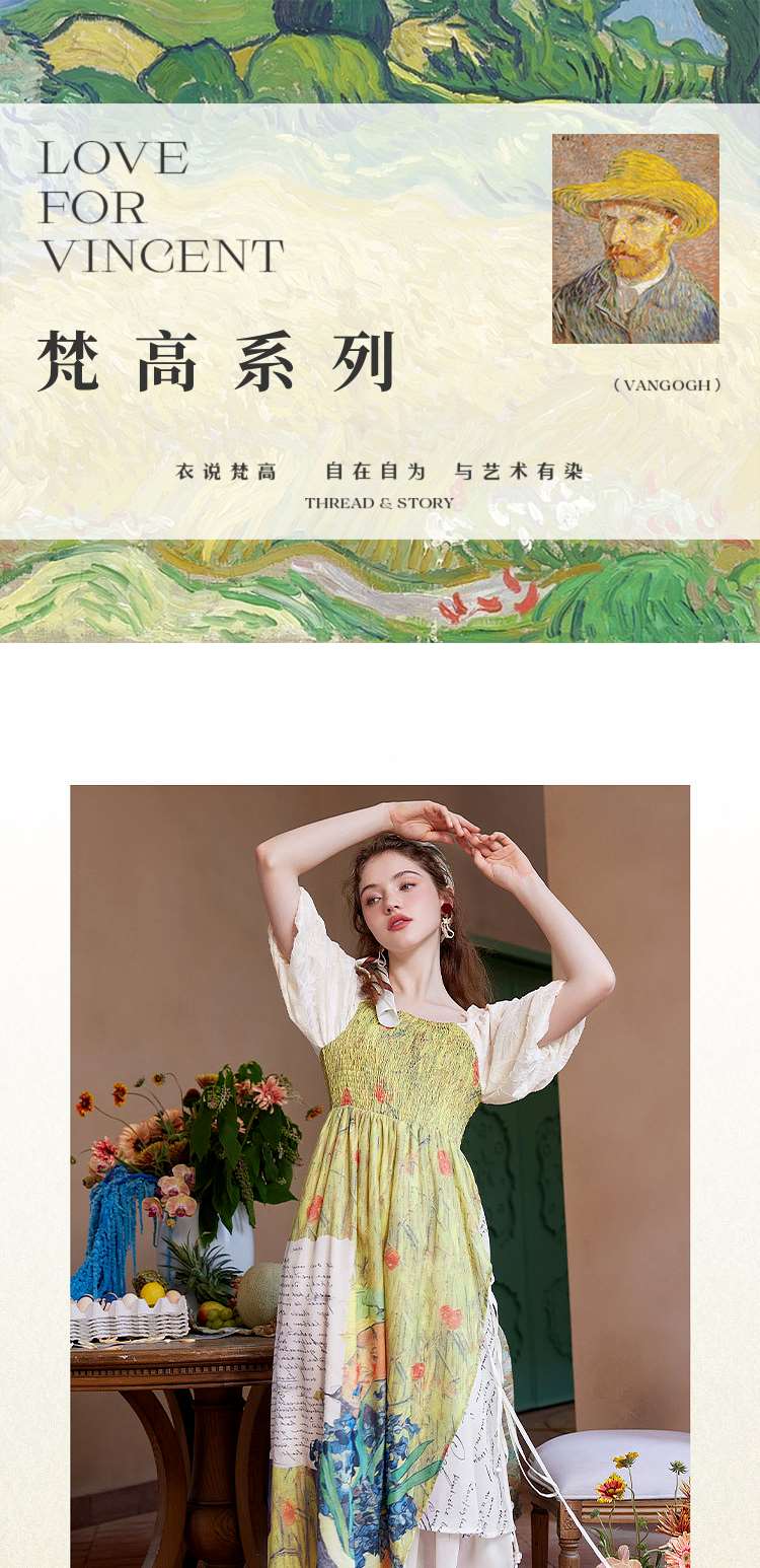 两三事梵高艺术荷以清凉夏季田园风泡泡袖印花绑带连衣裙