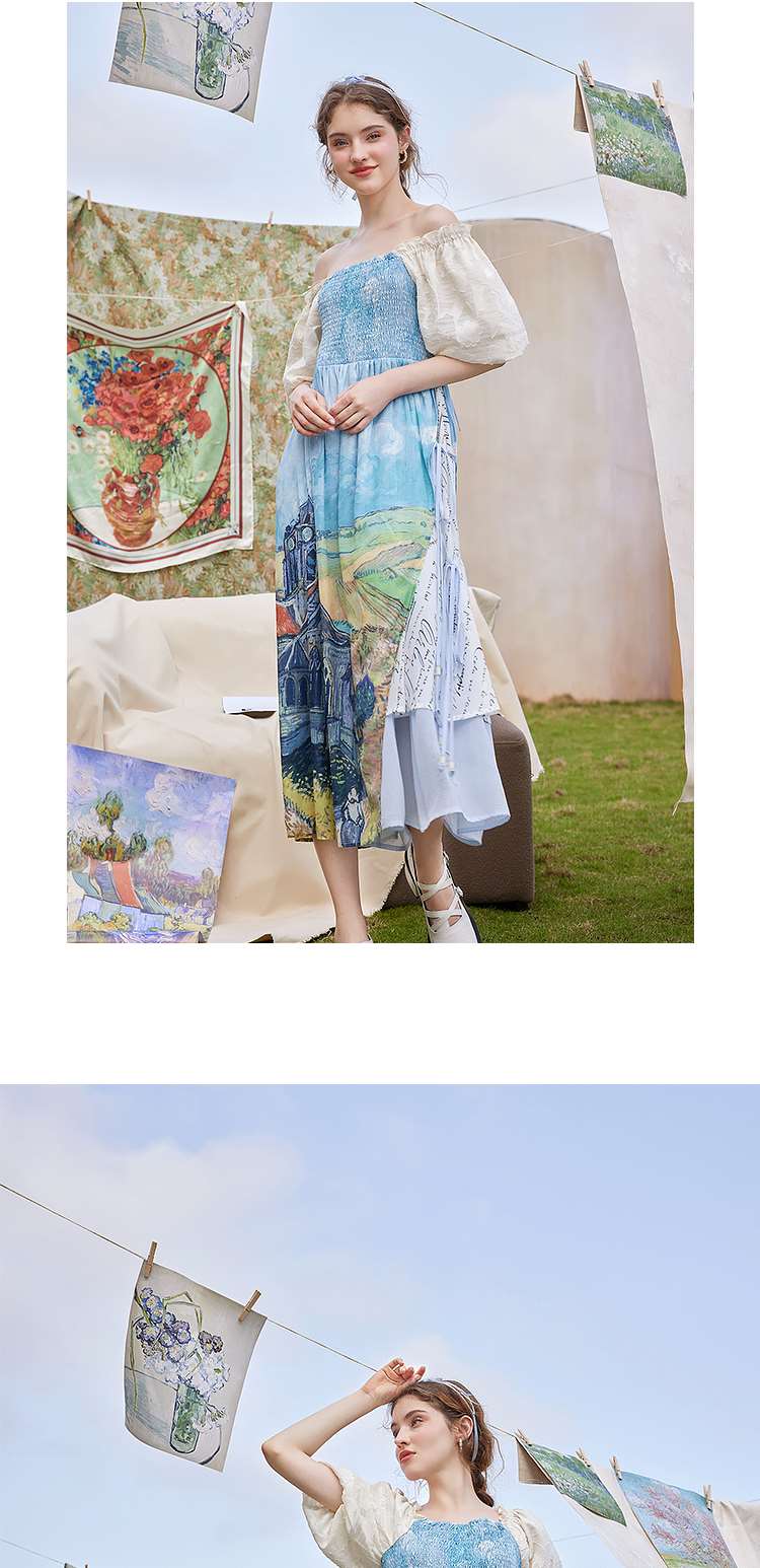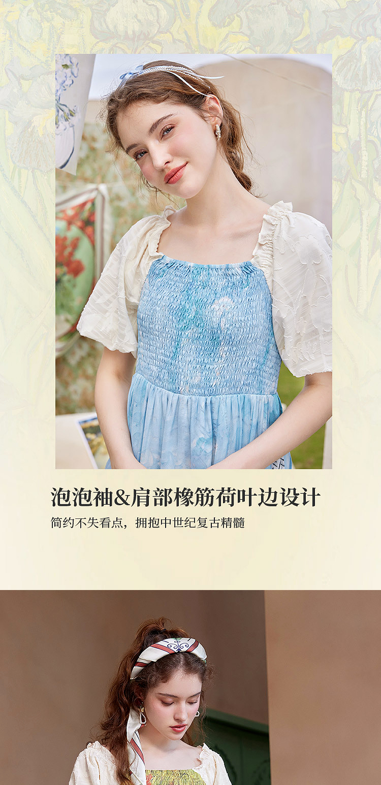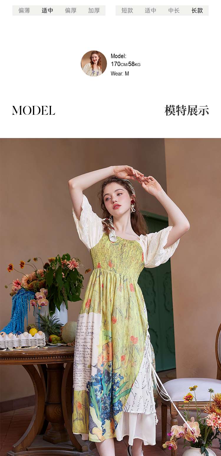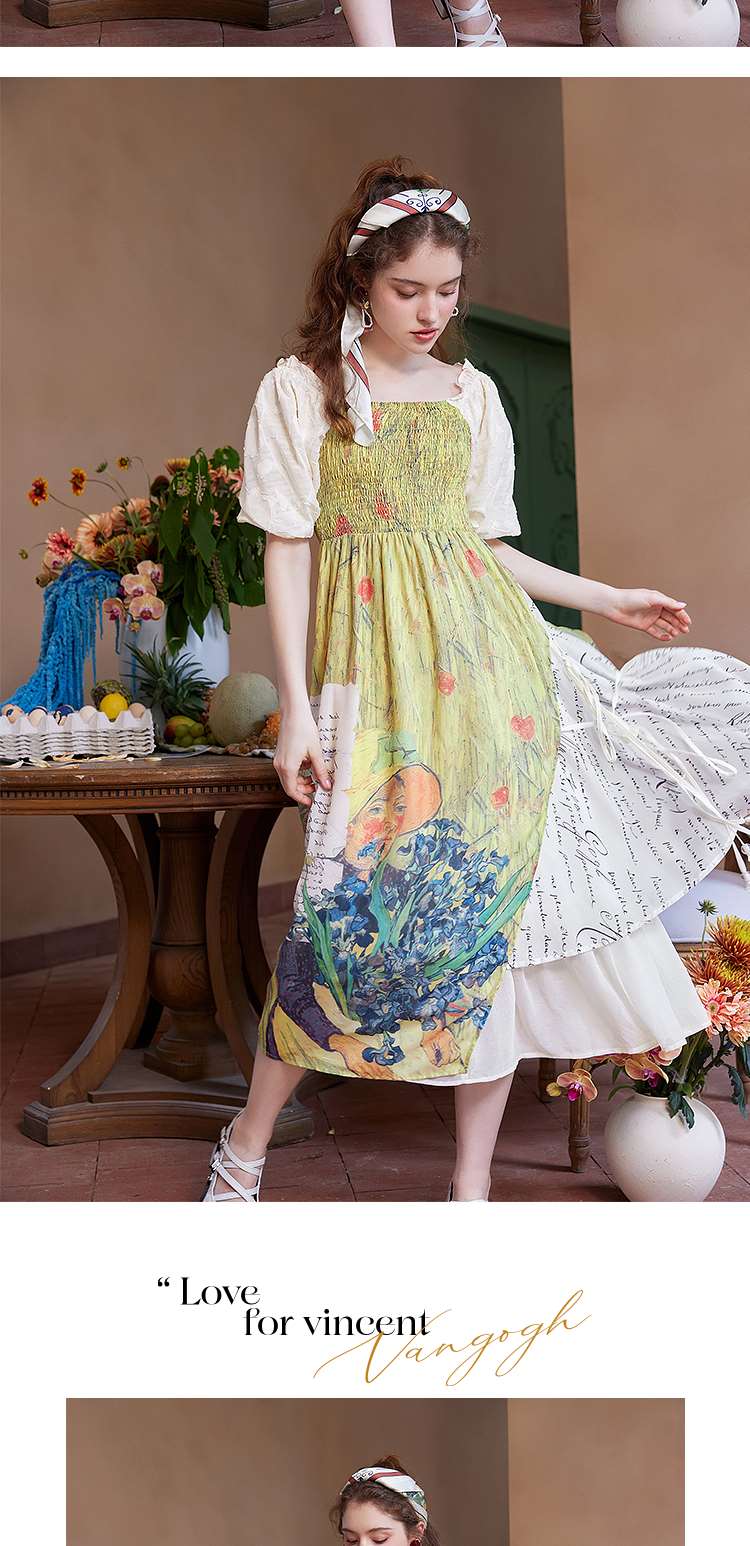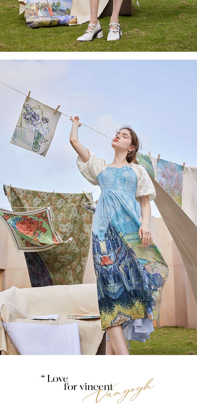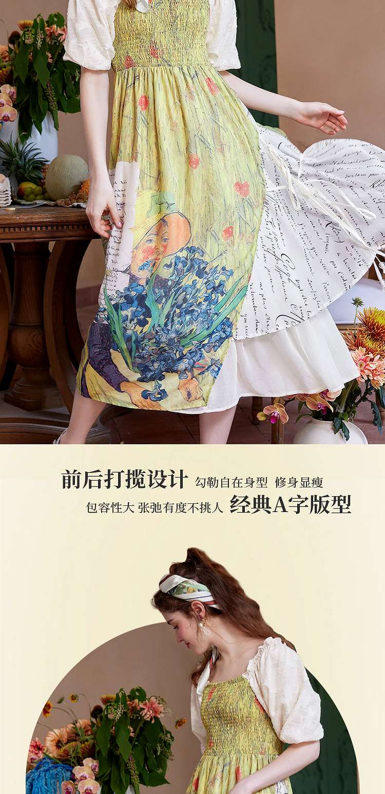 两三事梵高艺术荷以清凉夏季田园风泡泡袖印花绑带连衣裙